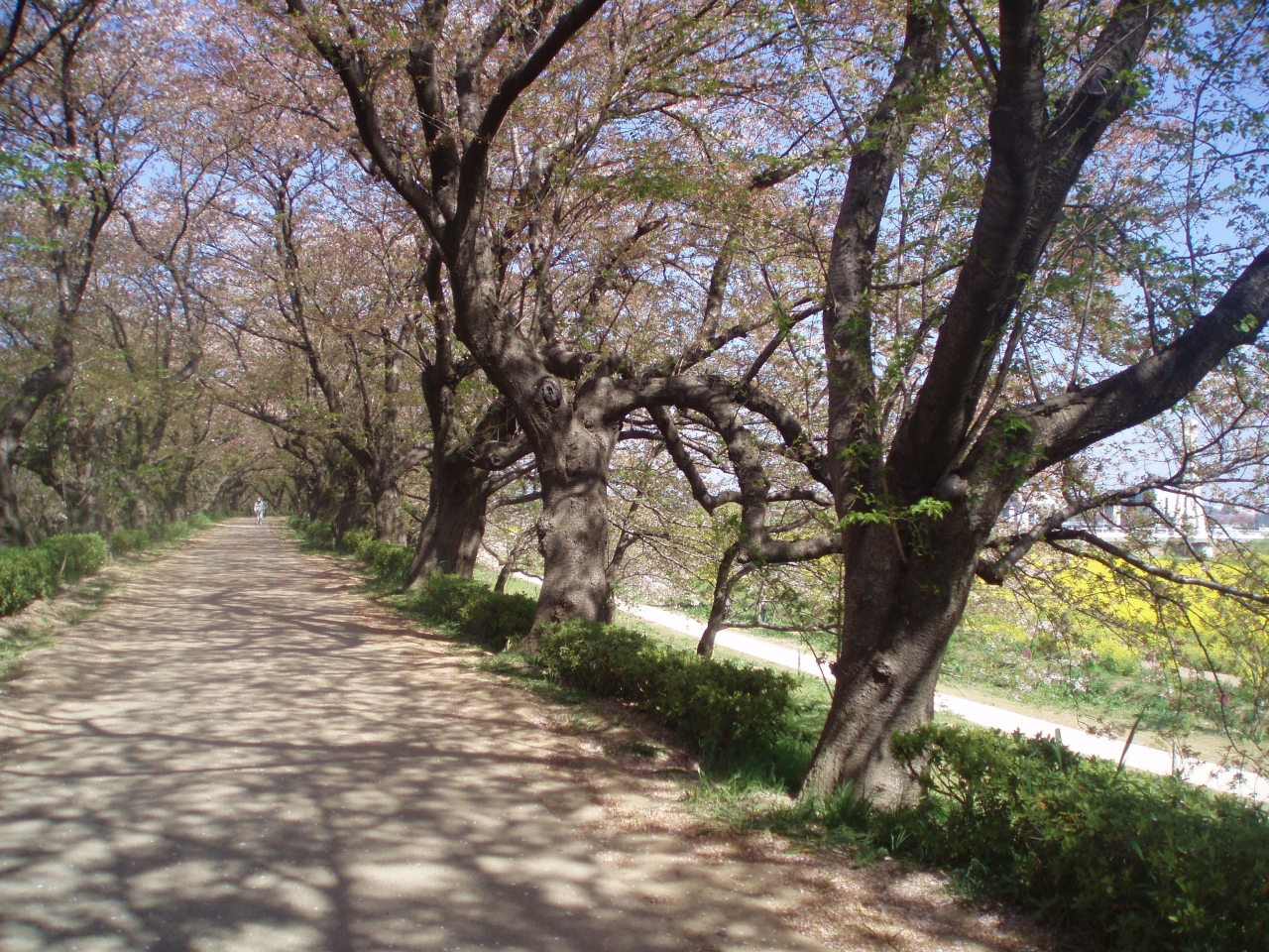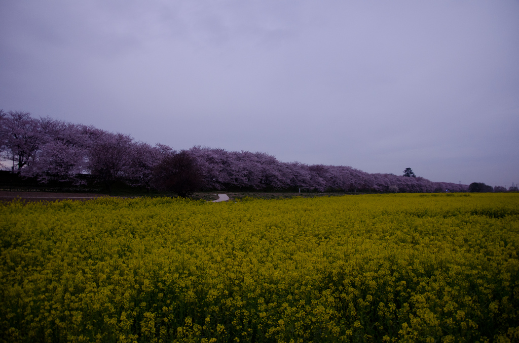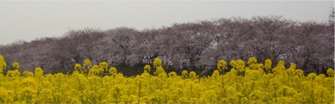 黄色い菜の花が咲き乱れる河川敷と薄墨色の桜の並木の景色は、なんだか心がほっとする景色。