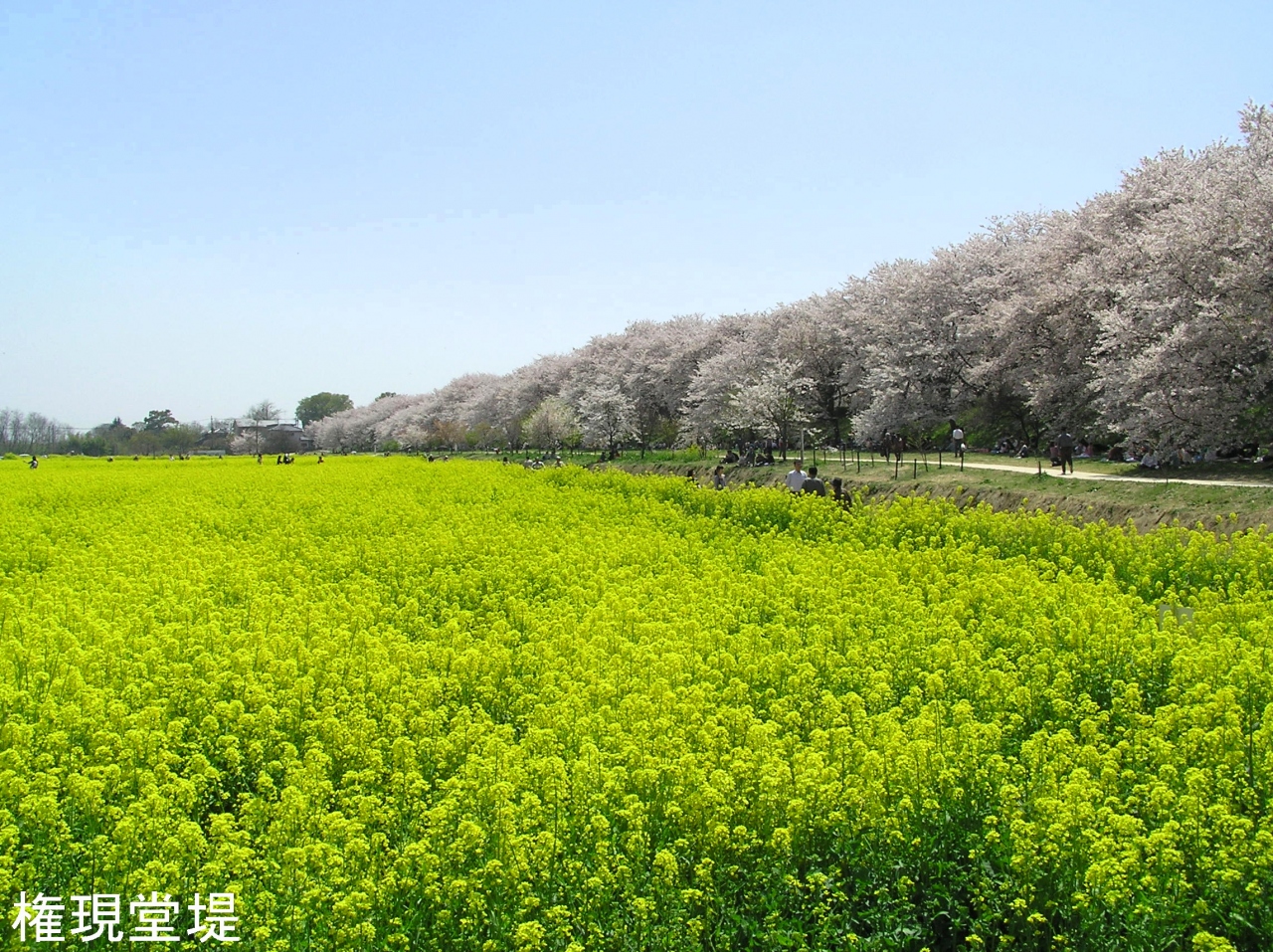 関東の桜の名所として有名な幸手権現堂桜堤は、約1000本のソメイヨシノが1kmにわたって咲き誇り、 堤周辺の菜の花とのコントラストが見事。 6月には色とりどりの紫陽花、9月には真っ赤に染まる曼珠沙華(彼岸花)、1月には白い可憐な水仙が見ごろを迎え、1年を通して花を楽しむことができる。