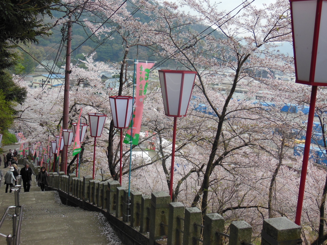 南北朝の戦いで金ヶ崎に籠城し、非業の死をとげた、後醍醐天皇の2人の皇子、尊良親王(たかながしんのう)と恒良親王(つねながしんのう)を祀る神社です。太平記の一話に尊良親王が永年想いを寄せ続けた姫君御くしげ殿とめでたく結ばれた話もあることなどから、恋の宮として恋愛祈願に多くの人達が訪れます。春には「千本桜」が咲き乱れ、絶好の花見どころとしても知られています。