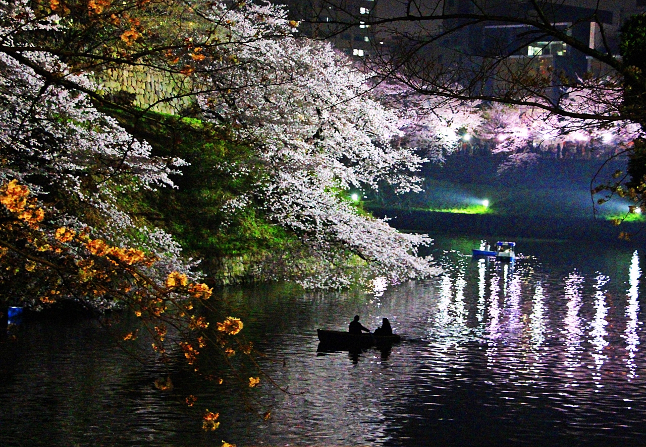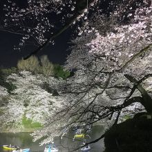 ボートの営業が終了し、静まり返ったお堀の水面へとリフレインする桜の色と夜の闇の対比はお勧めですよ。