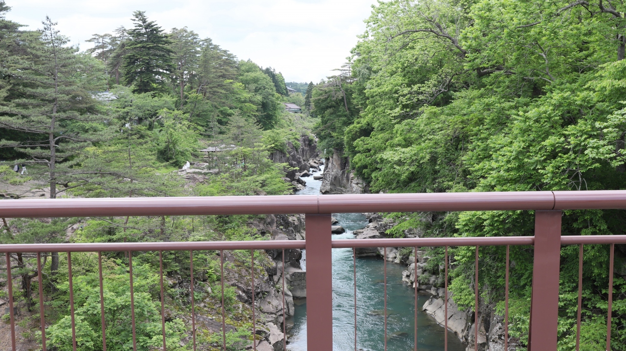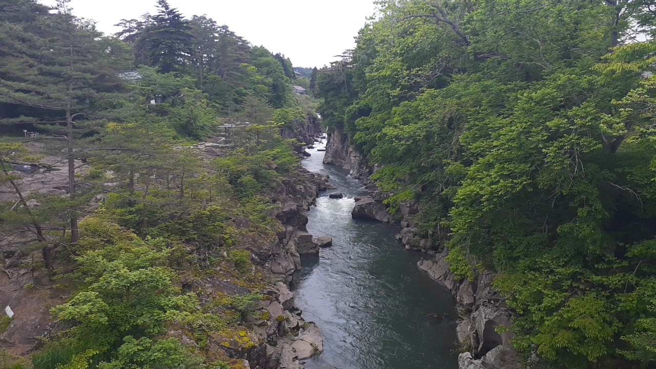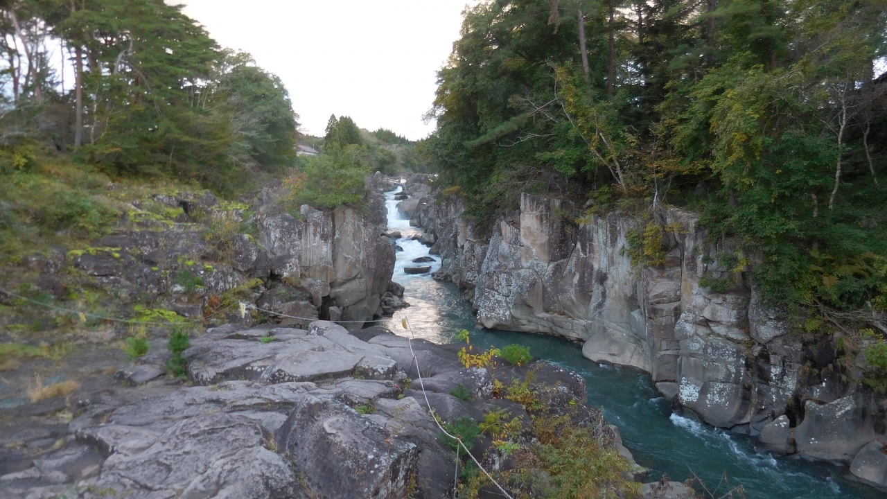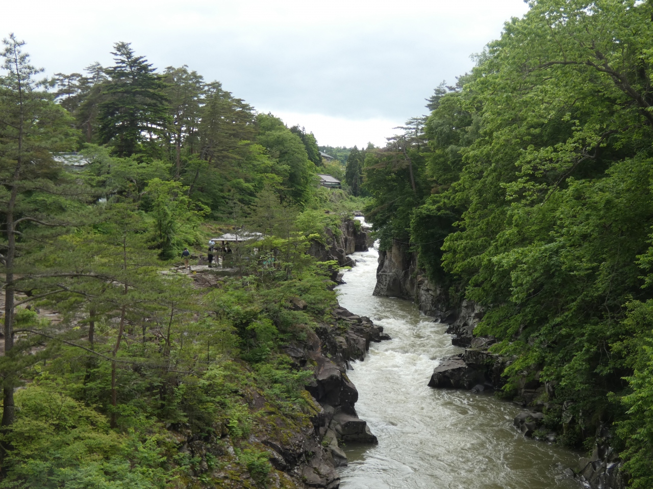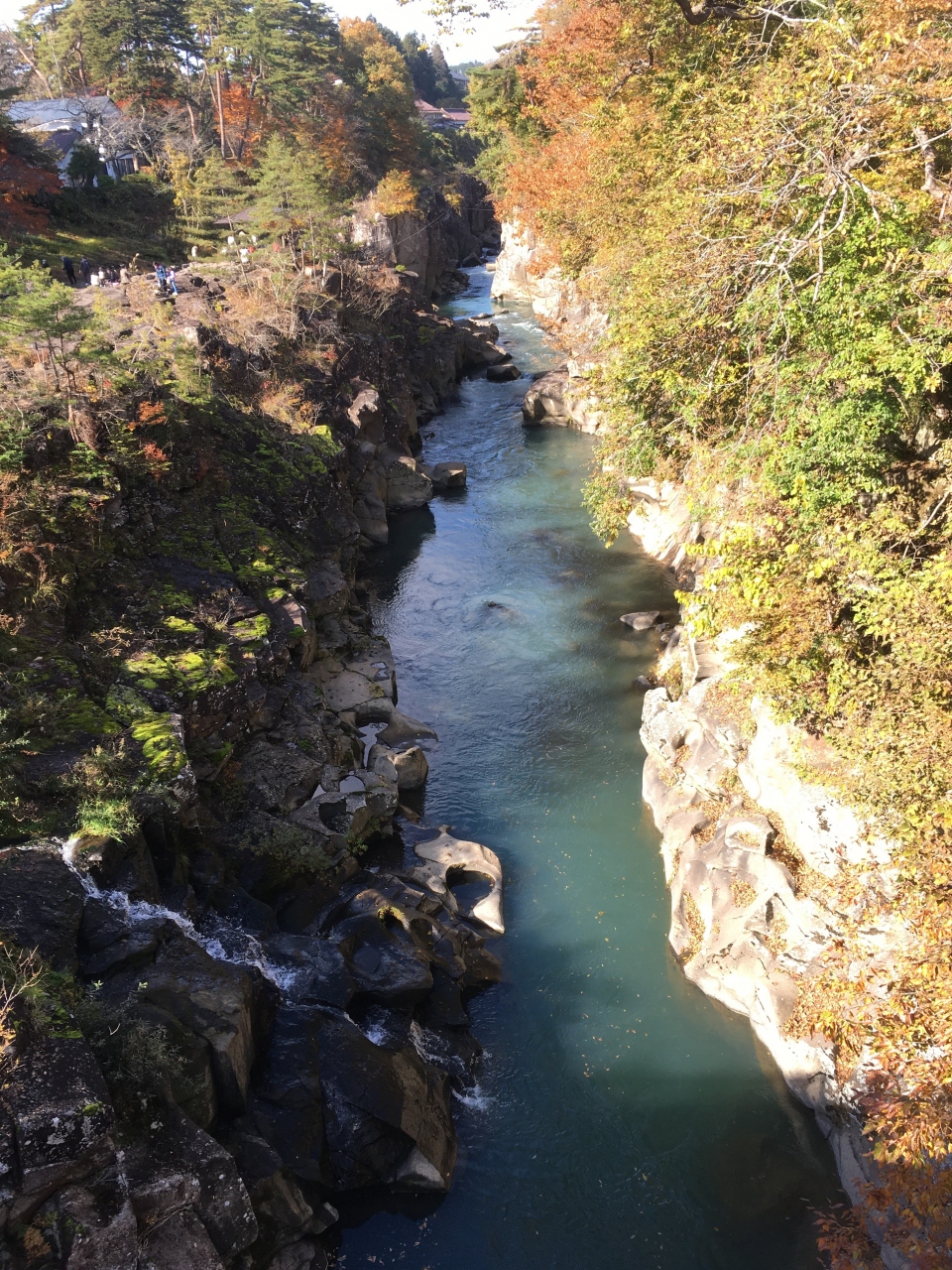 岩手県の磐井川沿いにある渓谷。磐井川が巨岩を浸食し、2kmにわたり渓谷美を見せる。渓流をはわんだ対岸のお茶屋からだんごとお茶を買う「空飛ぶだんご」が名物。吊り橋から眺める蒸留の荒々しい流れと下流のゆったりした淵が対象的。甌穴が見せる渓流美が美しい。名勝天然記念物指定。紅葉の見頃は10月中旬~11月上旬。