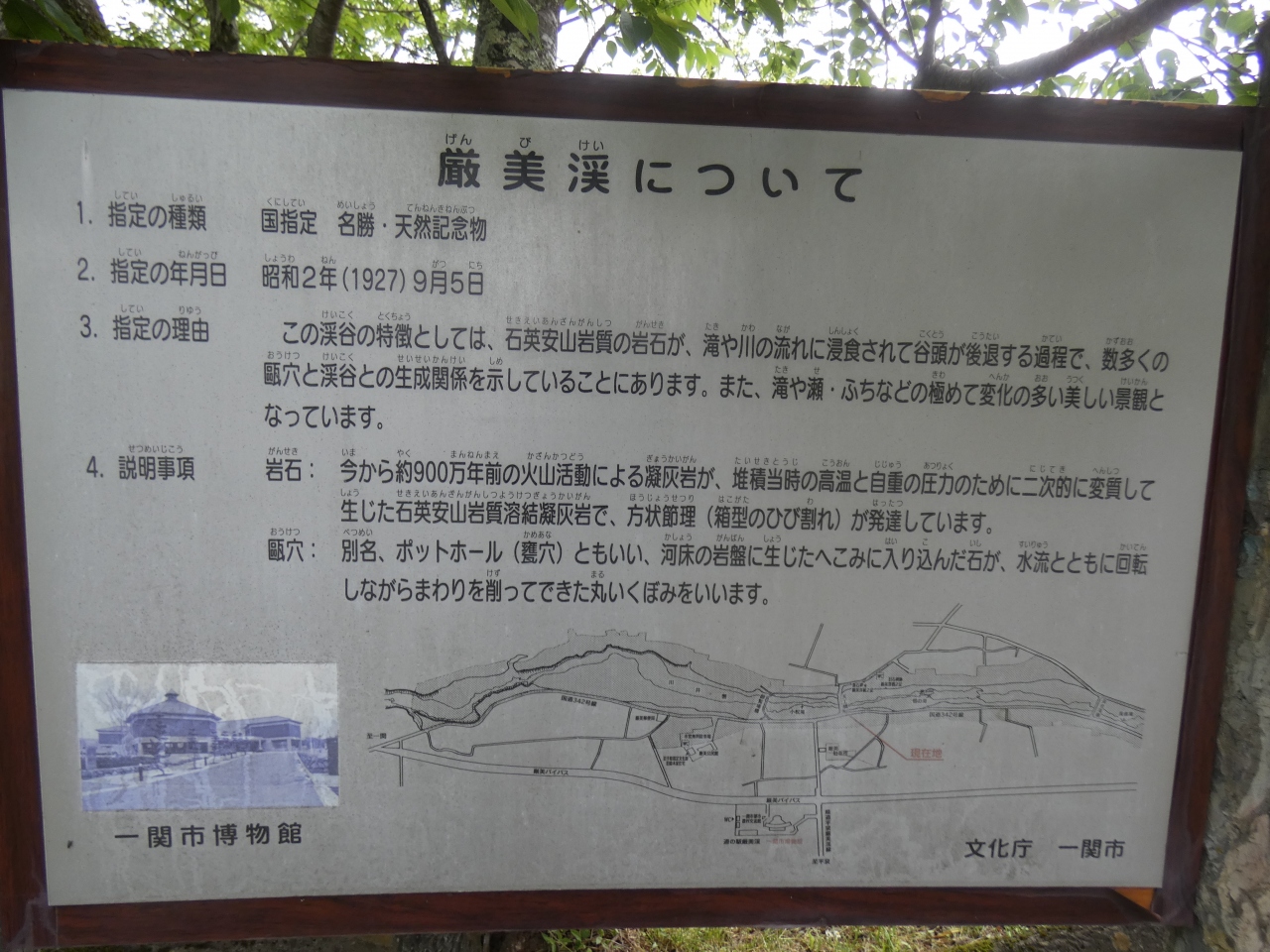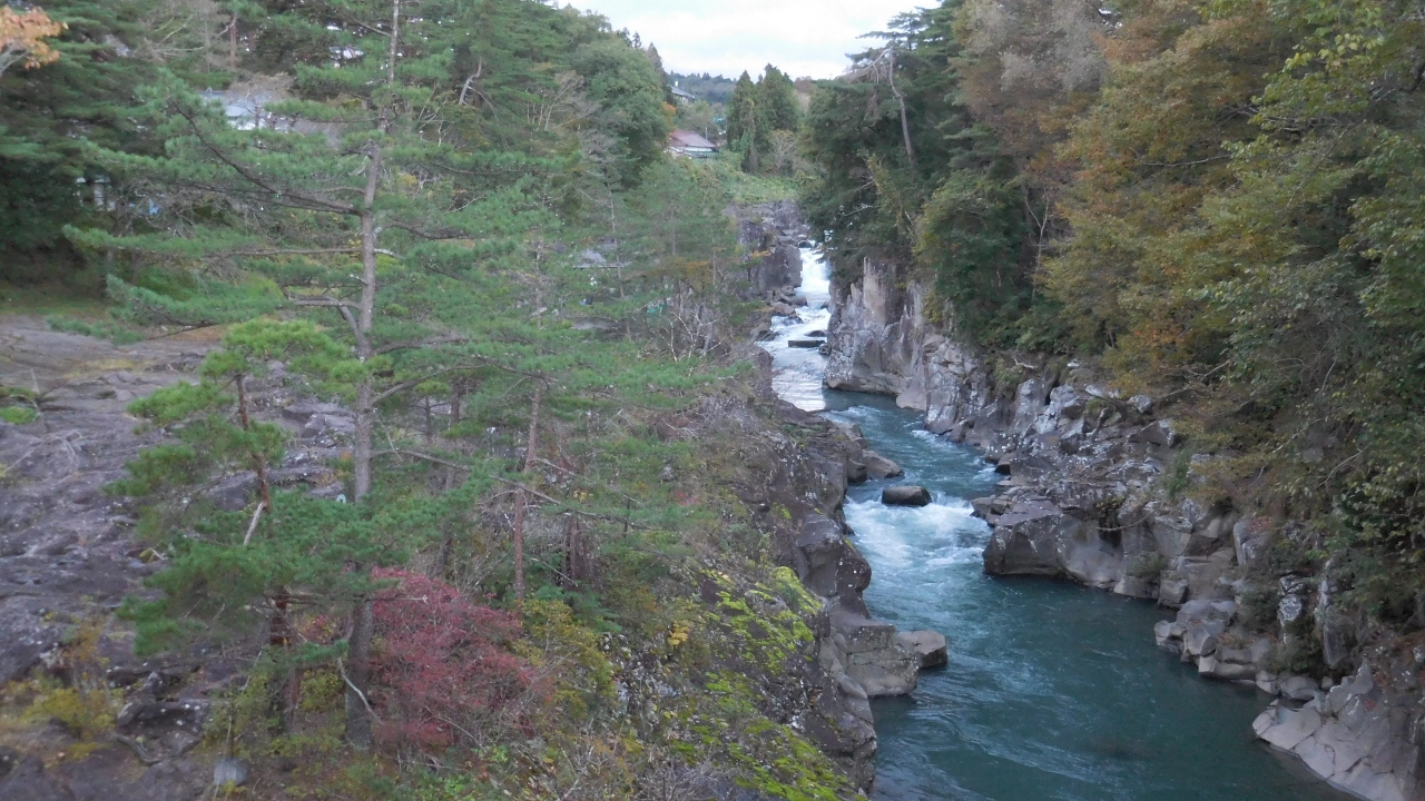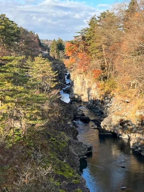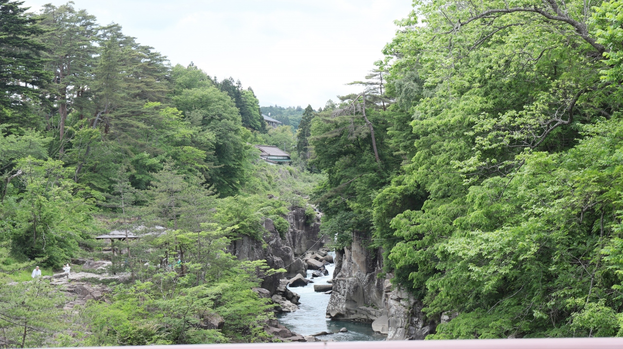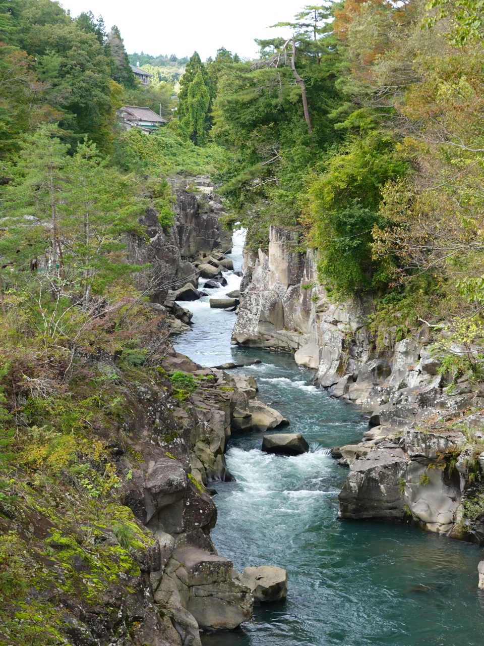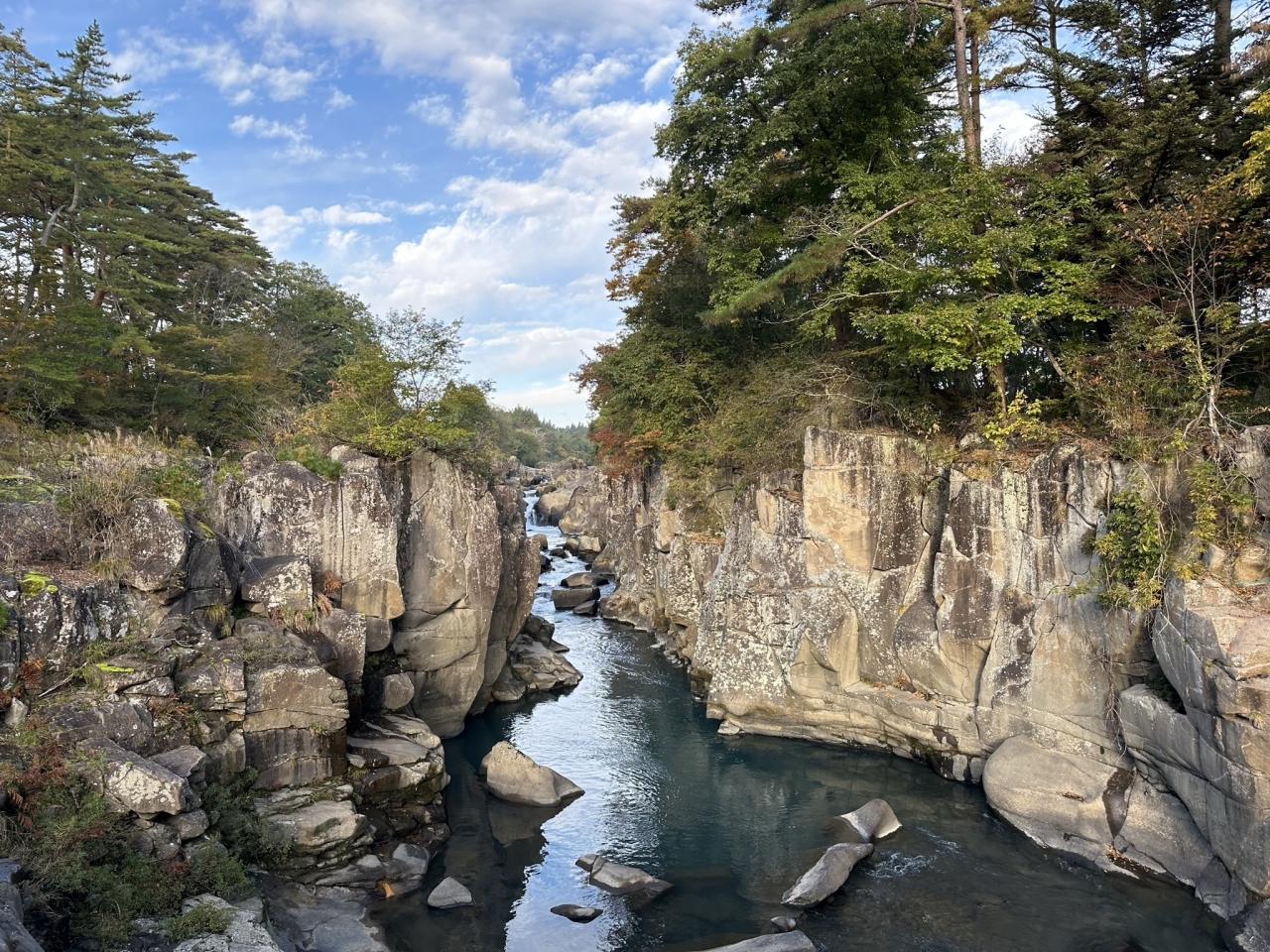 岩手県の磐井川沿いにある渓谷。磐井川が巨岩を浸食し、2kmにわたり渓谷美を見せる。渓流をはわんだ対岸のお茶屋からだんごとお茶を買う「空飛ぶだんご」が名物。吊り橋から眺める蒸留の荒々しい流れと下流のゆったりした淵が対象的。甌穴が見せる渓流美が美しい。名勝天然記念物指定。紅葉の見頃は10月中旬~11月上旬。
