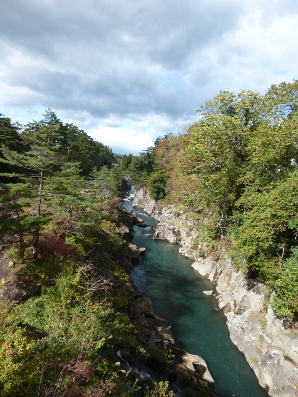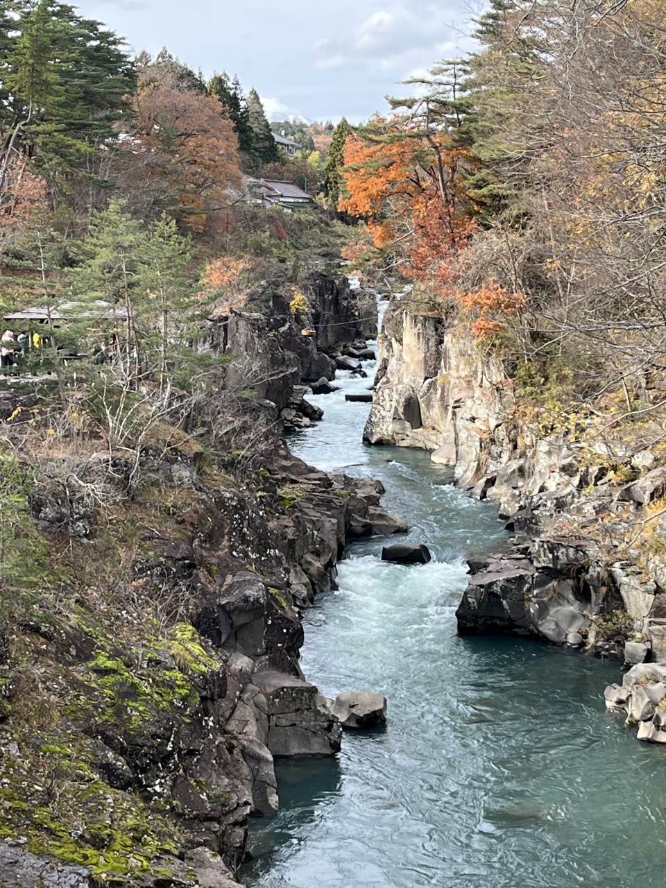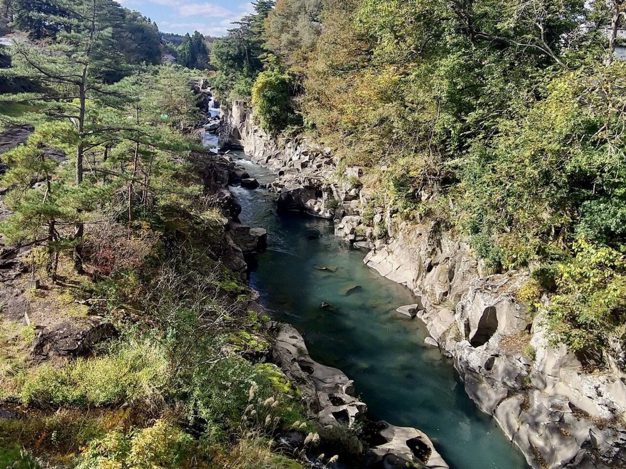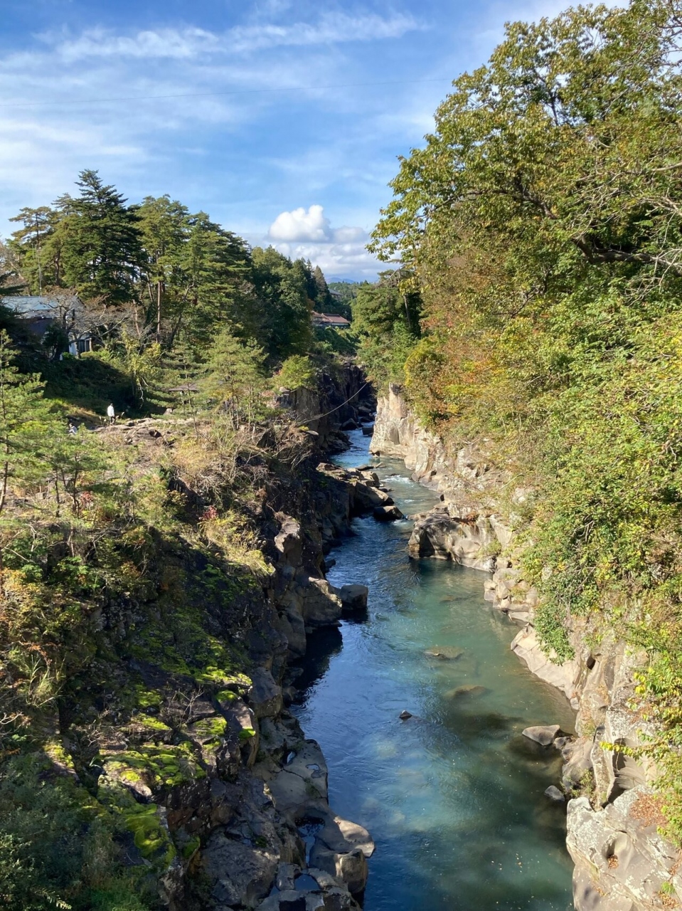 岩手県の磐井川沿いにある渓谷。磐井川が巨岩を浸食し、2kmにわたり渓谷美を見せる。渓流をはわんだ対岸のお茶屋からだんごとお茶を買う「空飛ぶだんご」が名物。吊り橋から眺める蒸留の荒々しい流れと下流のゆったりした淵が対象的。甌穴が見せる渓流美が美しい。名勝天然記念物指定。紅葉の見頃は10月中旬~11月上旬。