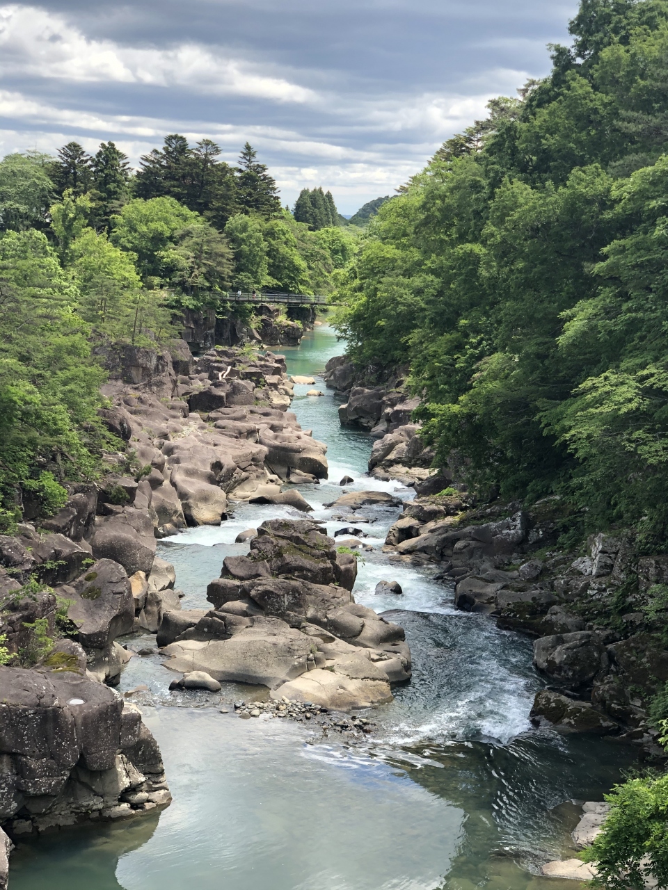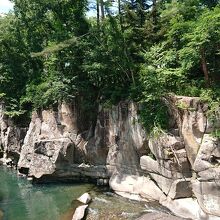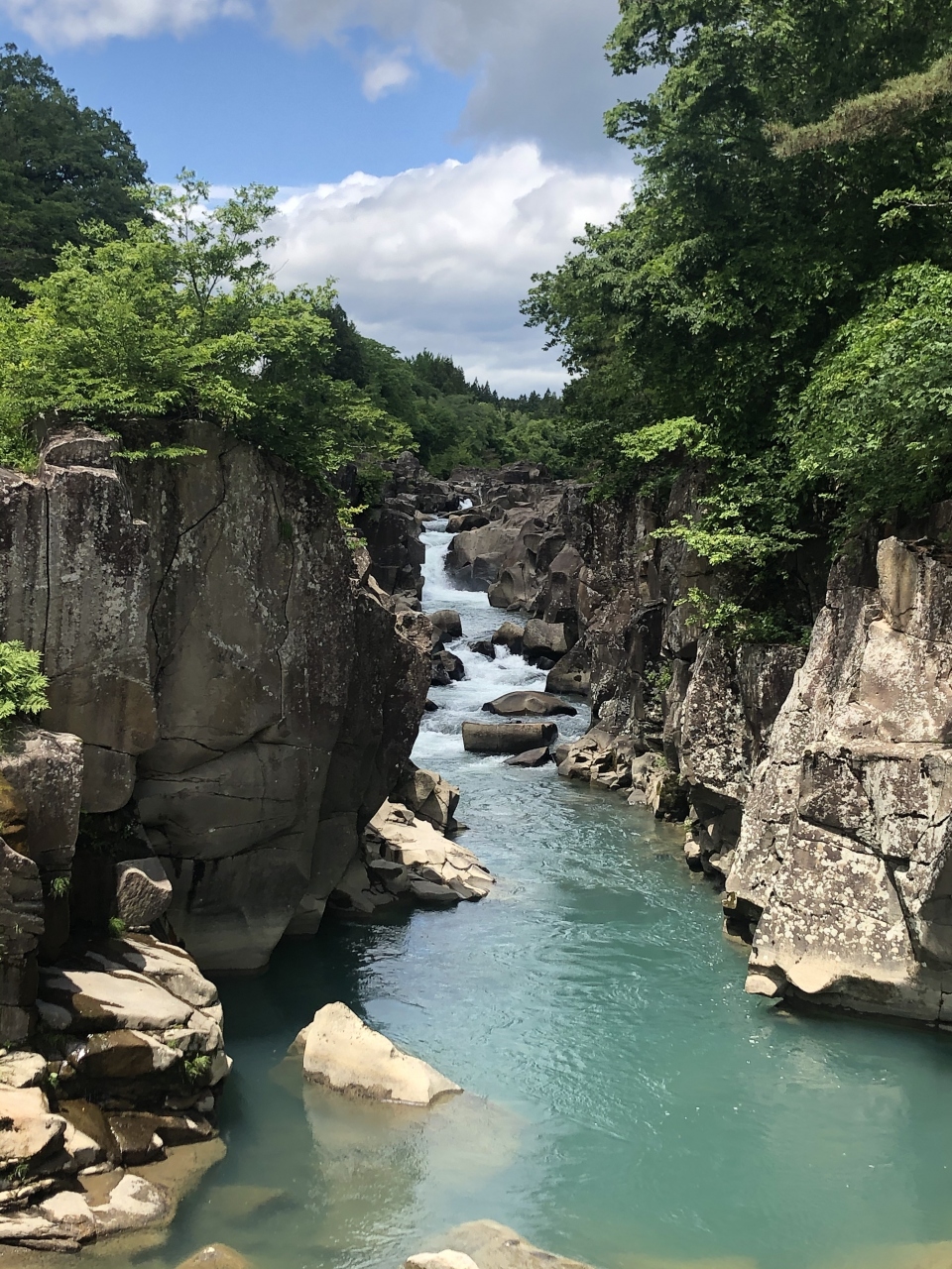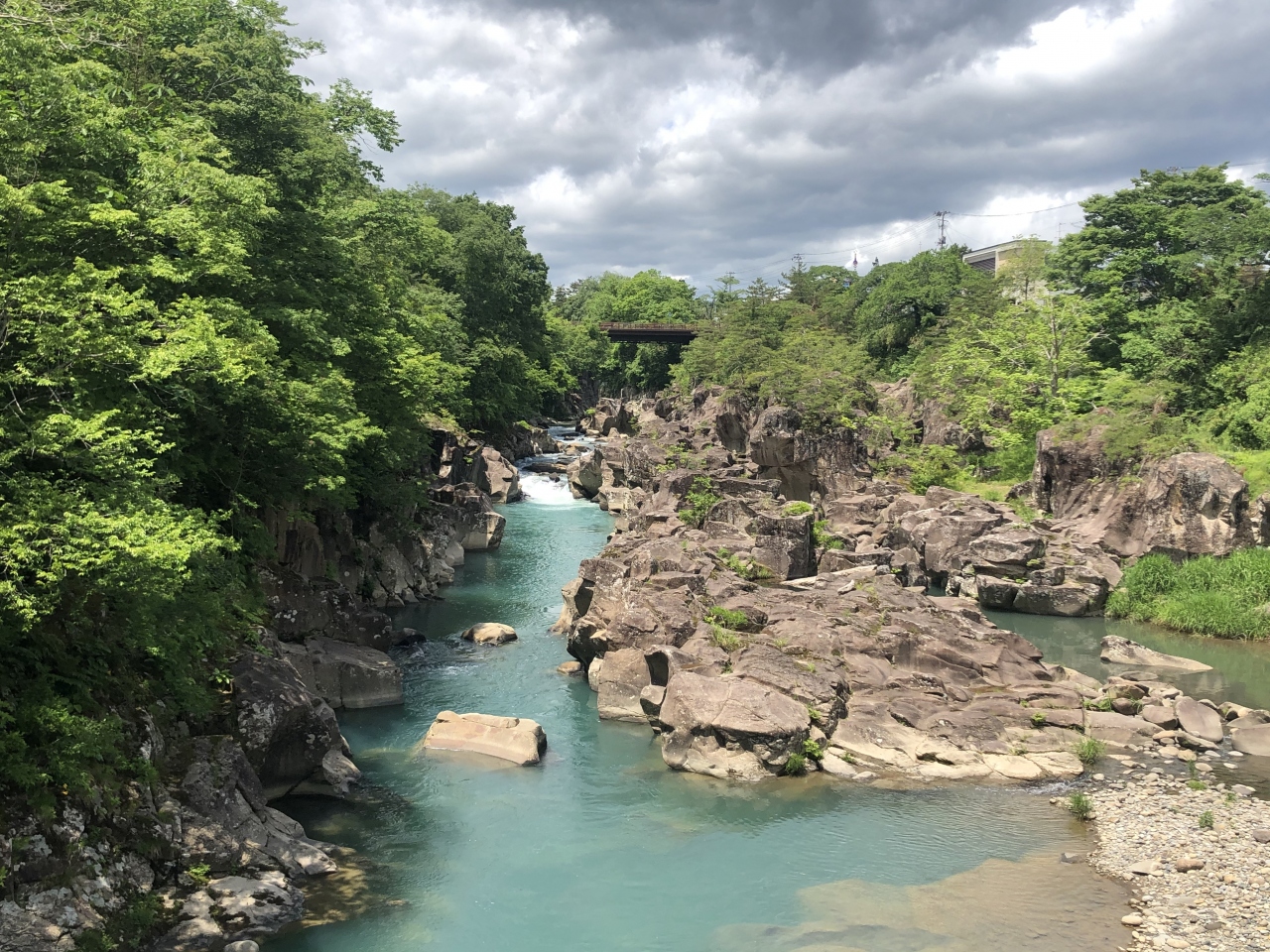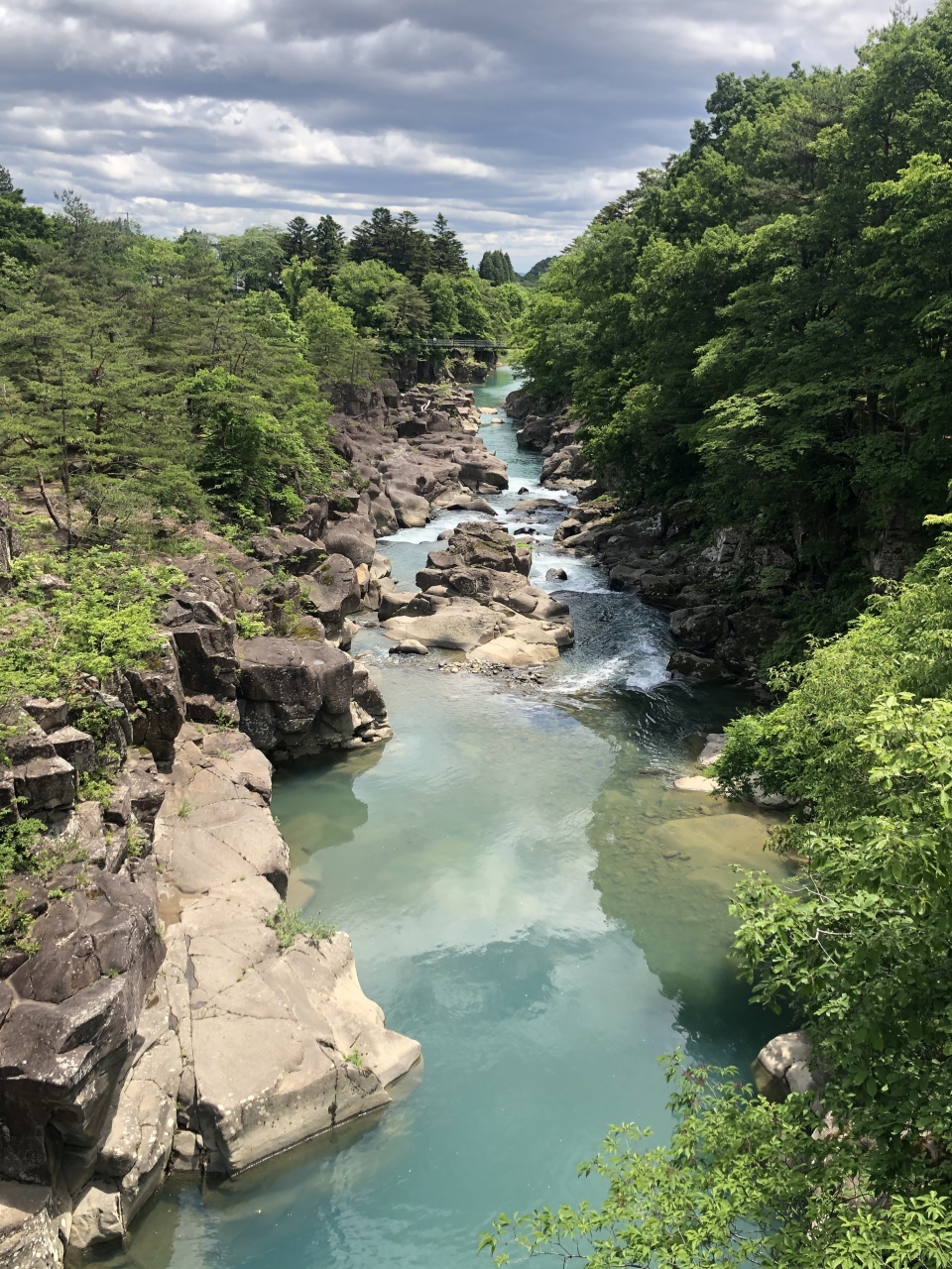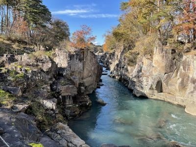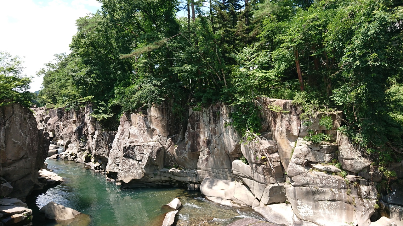 岩手県の磐井川沿いにある渓谷。磐井川が巨岩を浸食し、2kmにわたり渓谷美を見せる。渓流をはわんだ対岸のお茶屋からだんごとお茶を買う「空飛ぶだんご」が名物。吊り橋から眺める蒸留の荒々しい流れと下流のゆったりした淵が対象的。甌穴が見せる渓流美が美しい。名勝天然記念物指定。紅葉の見頃は10月中旬~11月上旬。