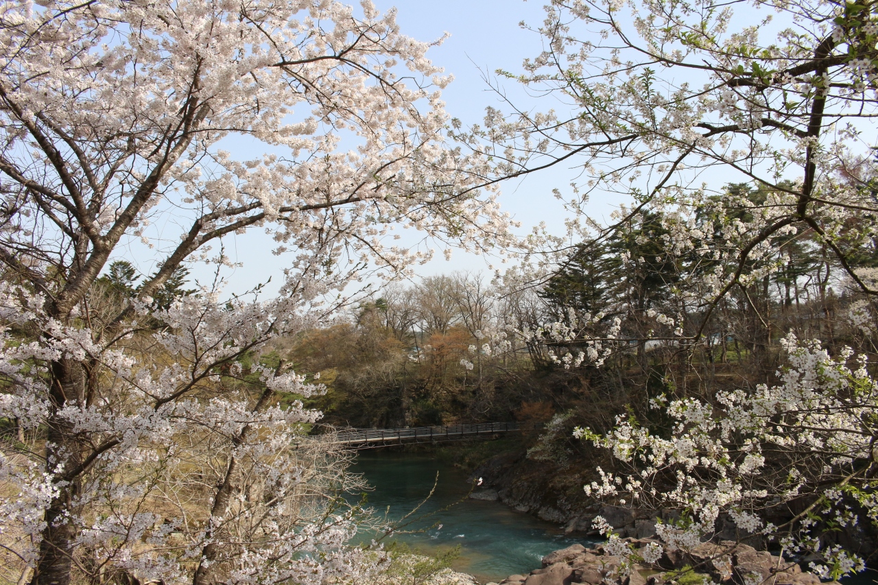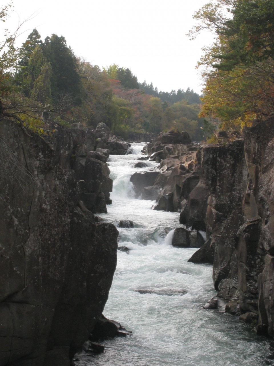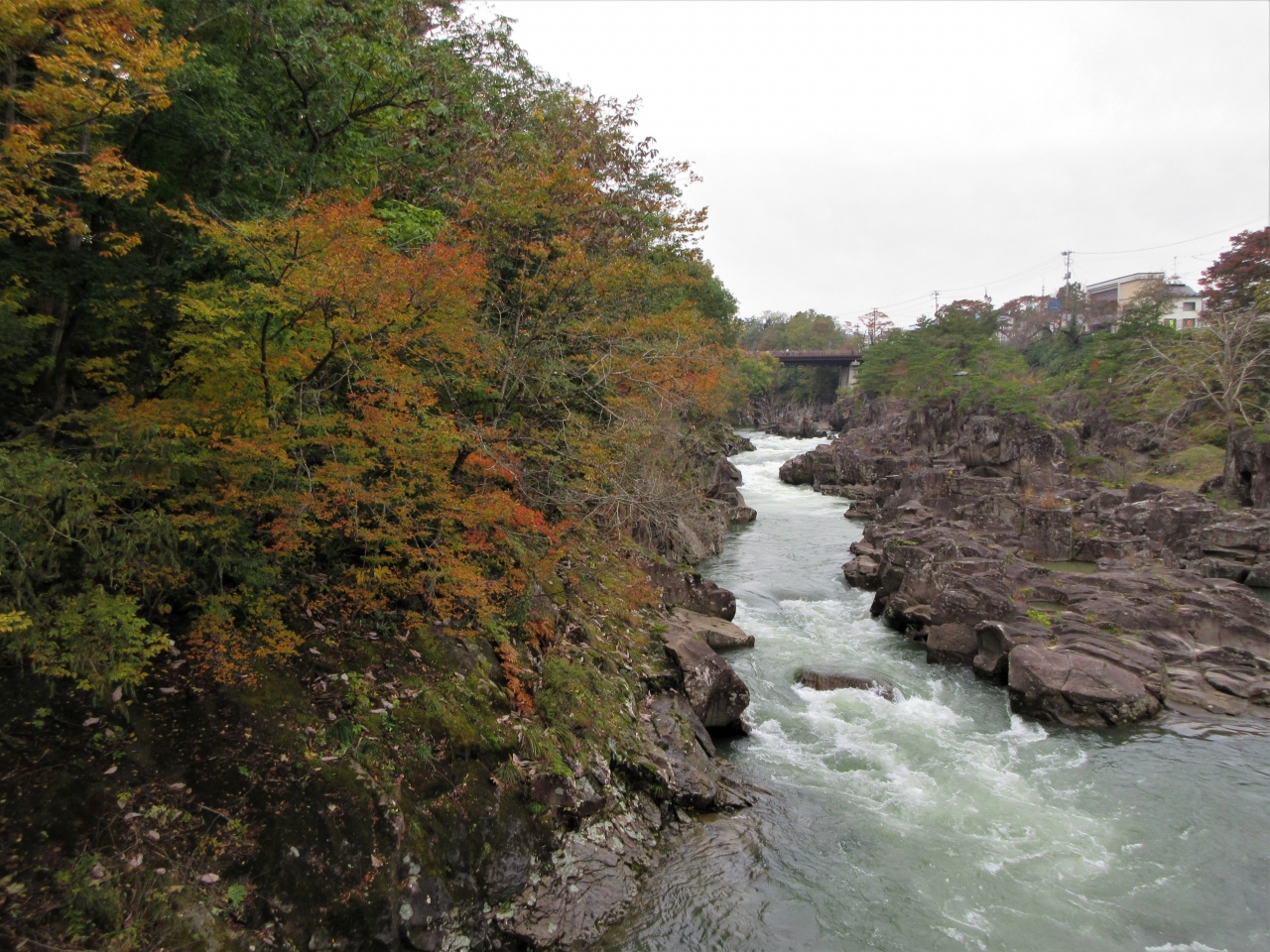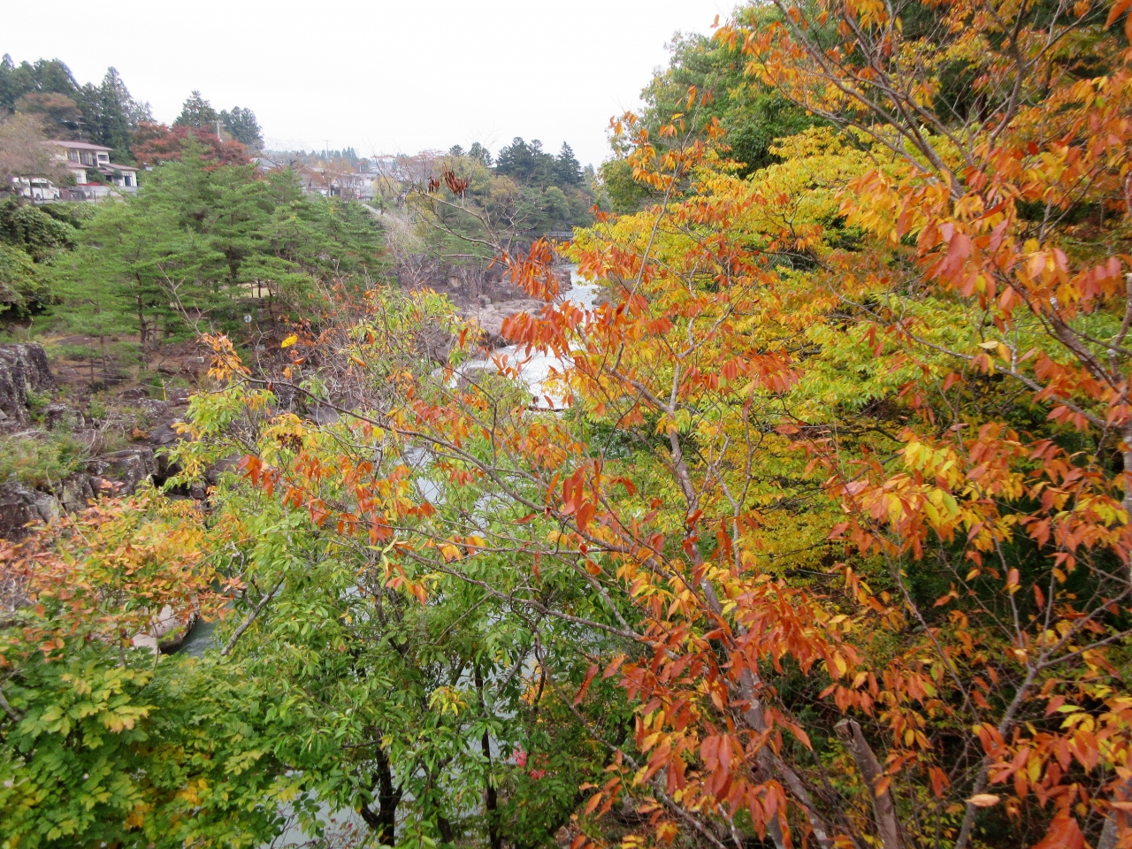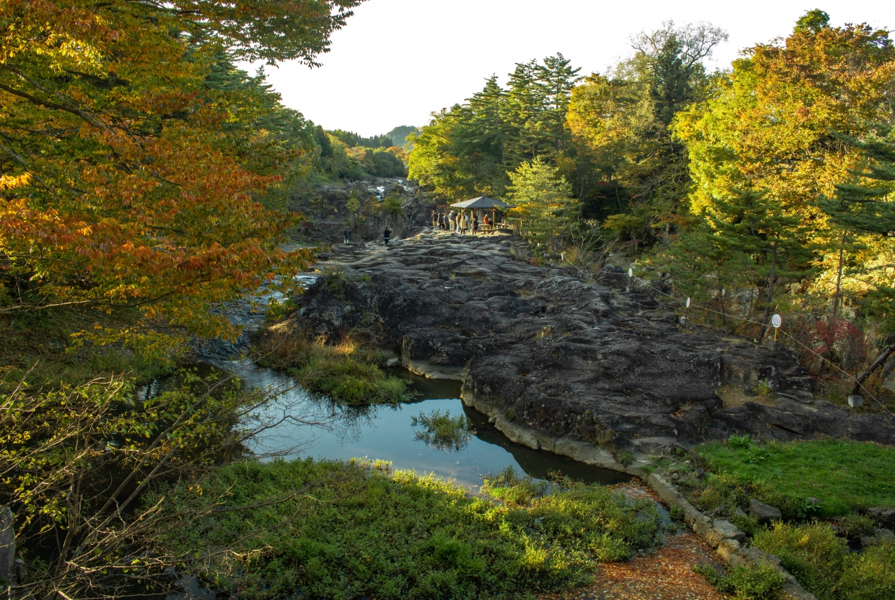 岩手県の磐井川沿いにある渓谷。磐井川が巨岩を浸食し、2kmにわたり渓谷美を見せる。渓流をはわんだ対岸のお茶屋からだんごとお茶を買う「空飛ぶだんご」が名物。吊り橋から眺める蒸留の荒々しい流れと下流のゆったりした淵が対象的。甌穴が見せる渓流美が美しい。名勝天然記念物指定。紅葉の見頃は10月中旬~11月上旬。