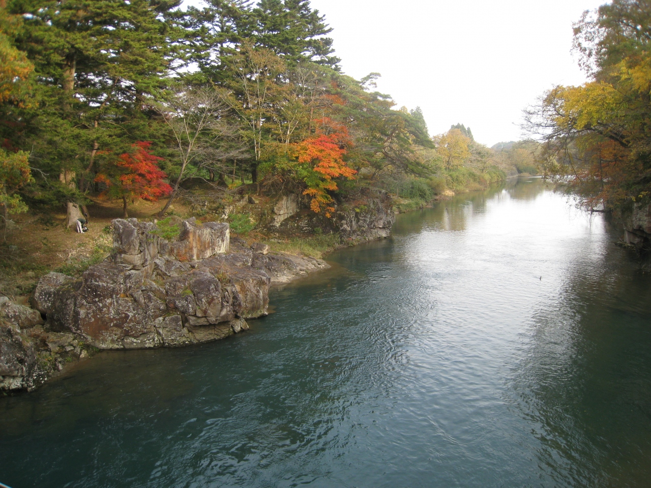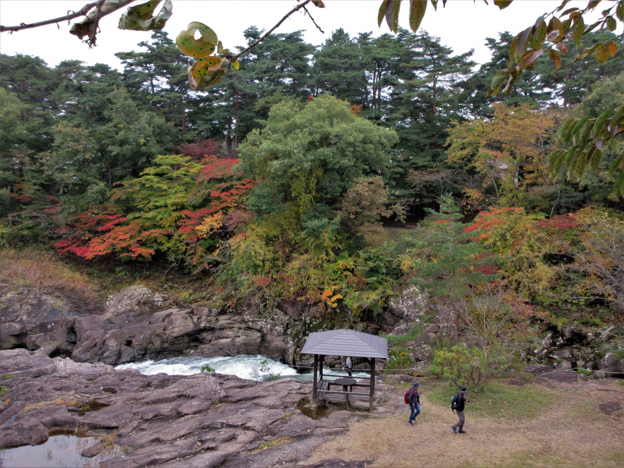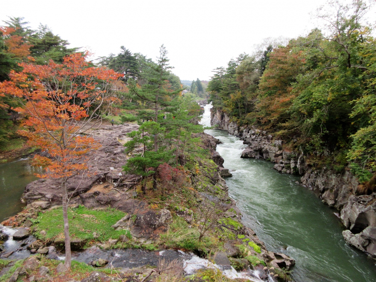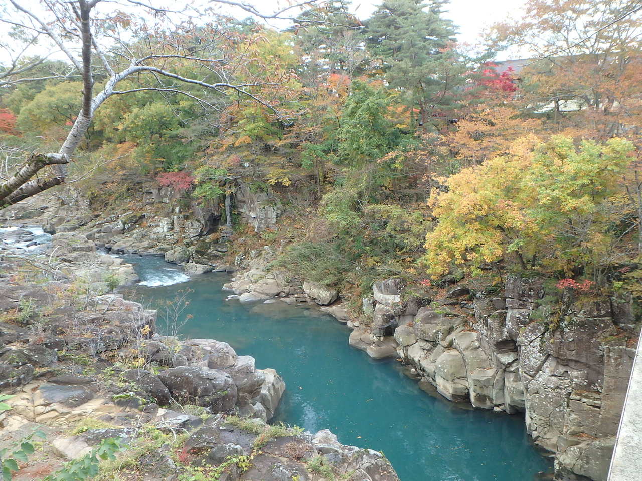岩手県の磐井川沿いにある渓谷。磐井川が巨岩を浸食し、2kmにわたり渓谷美を見せる。渓流をはわんだ対岸のお茶屋からだんごとお茶を買う「空飛ぶだんご」が名物。吊り橋から眺める蒸留の荒々しい流れと下流のゆったりした淵が対象的。甌穴が見せる渓流美が美しい。名勝天然記念物指定。紅葉の見頃は10月中旬~11月上旬。