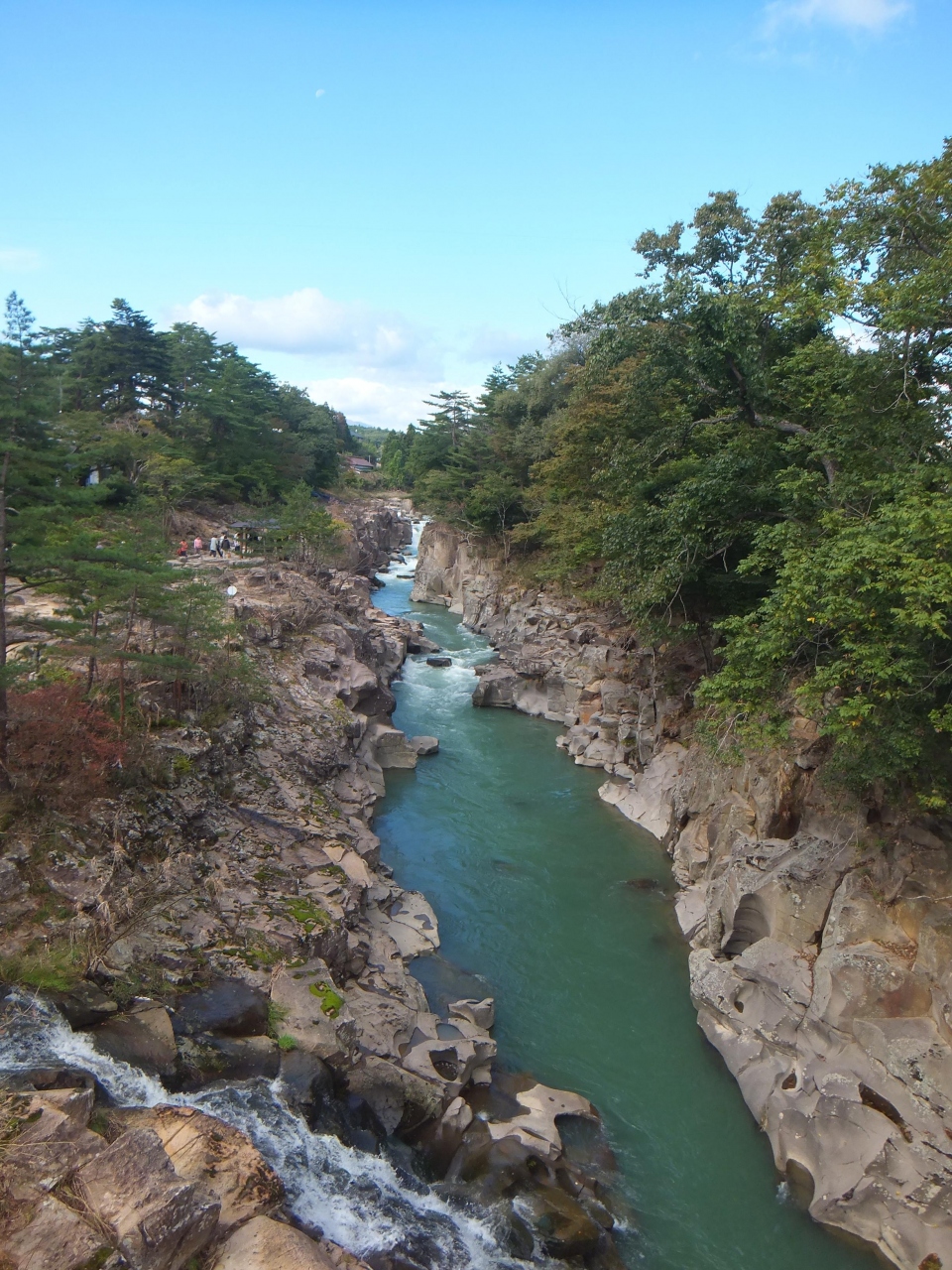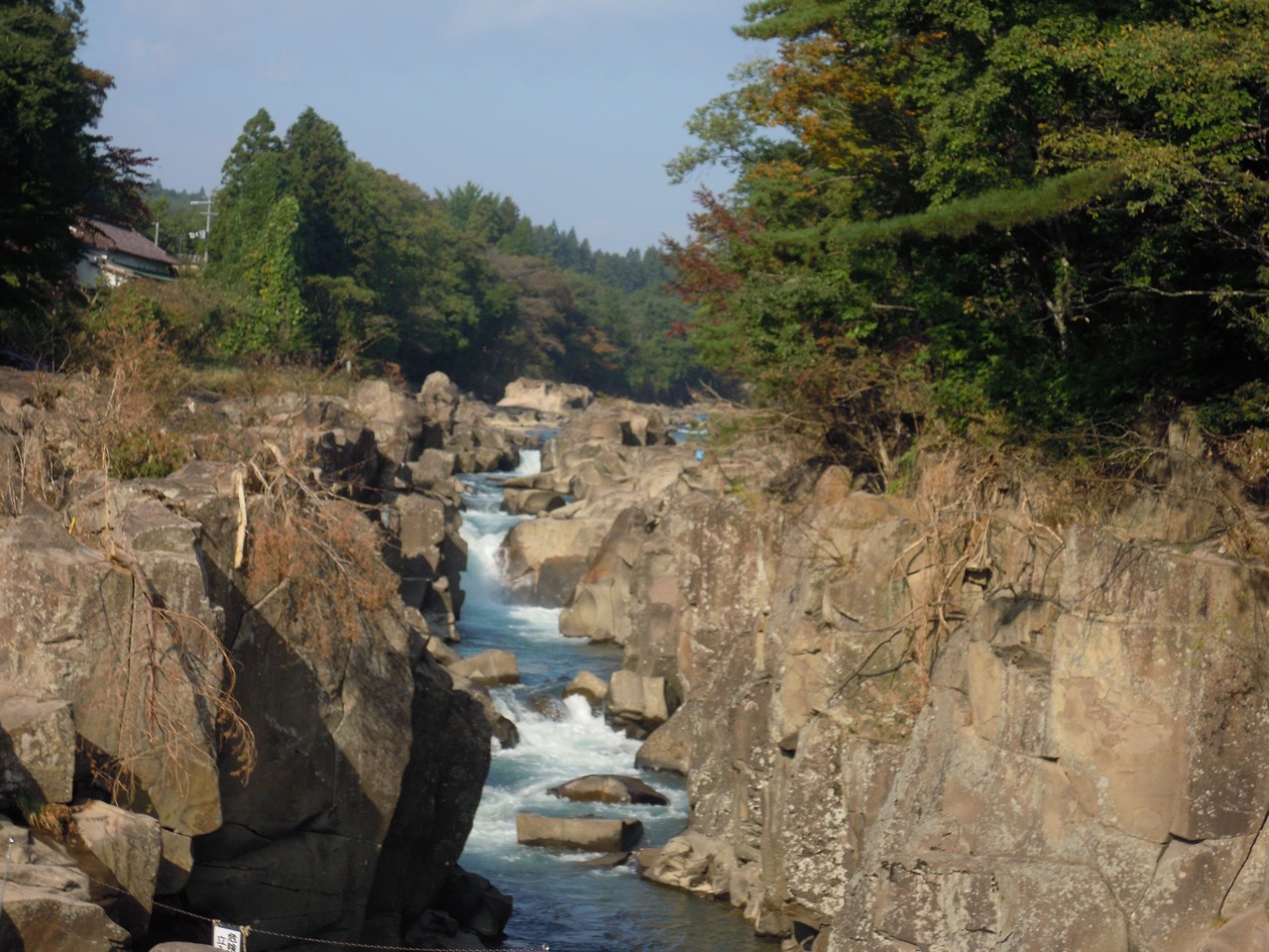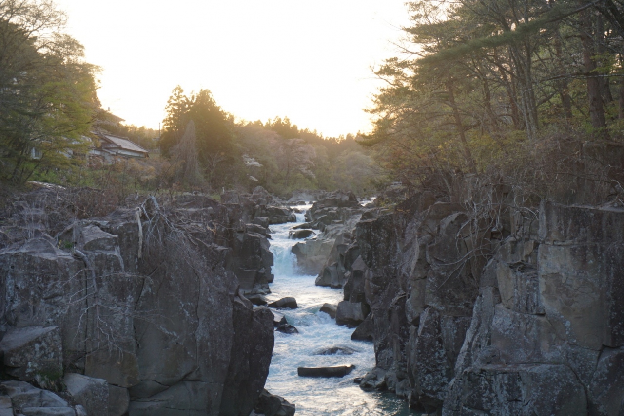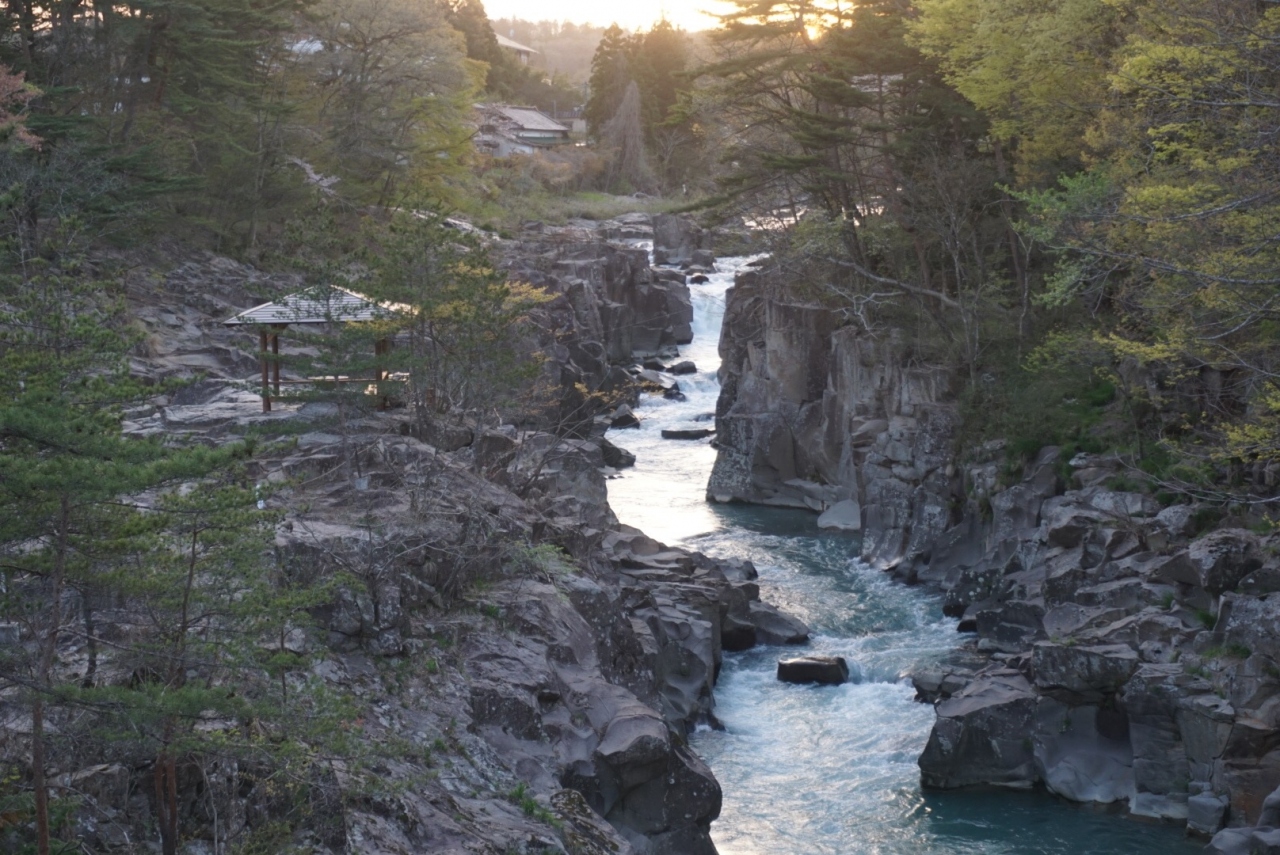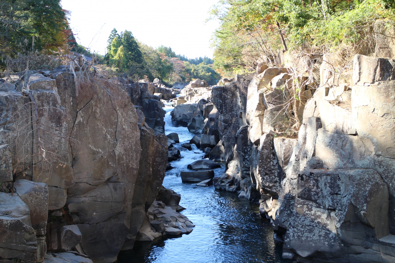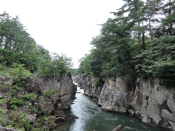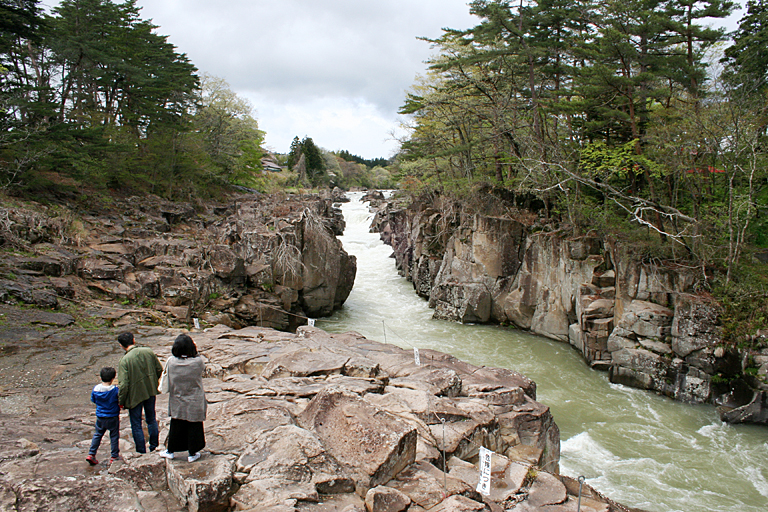 岩手県の磐井川沿いにある渓谷。磐井川が巨岩を浸食し、2kmにわたり渓谷美を見せる。渓流をはわんだ対岸のお茶屋からだんごとお茶を買う「空飛ぶだんご」が名物。吊り橋から眺める蒸留の荒々しい流れと下流のゆったりした淵が対象的。甌穴が見せる渓流美が美しい。名勝天然記念物指定。紅葉の見頃は10月中旬~11月上旬。