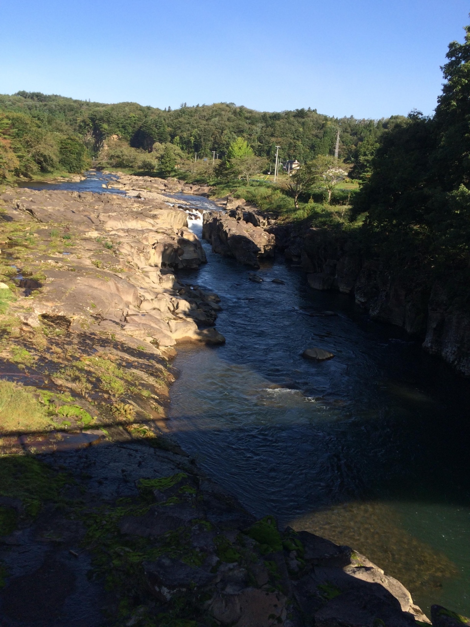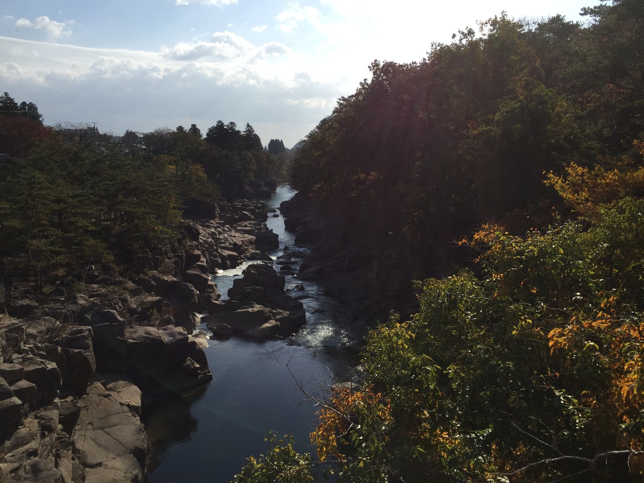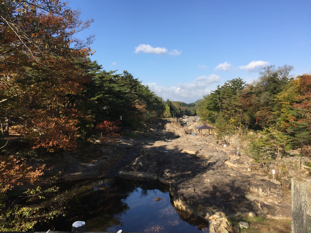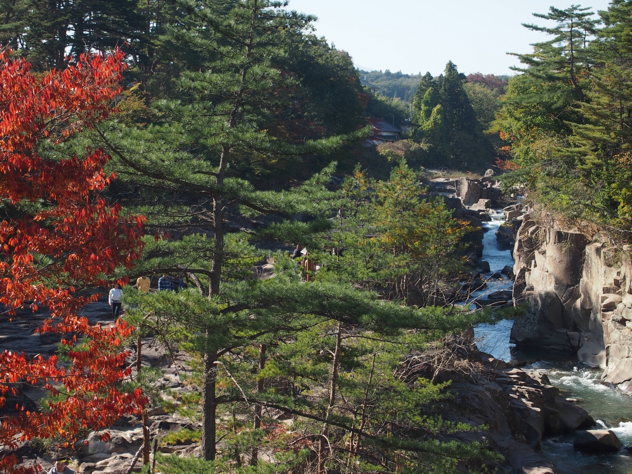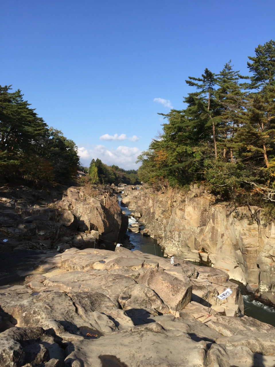 岩手県の磐井川沿いにある渓谷。磐井川が巨岩を浸食し、2kmにわたり渓谷美を見せる。渓流をはわんだ対岸のお茶屋からだんごとお茶を買う「空飛ぶだんご」が名物。吊り橋から眺める蒸留の荒々しい流れと下流のゆったりした淵が対象的。甌穴が見せる渓流美が美しい。名勝天然記念物指定。紅葉の見頃は10月中旬~11月上旬。