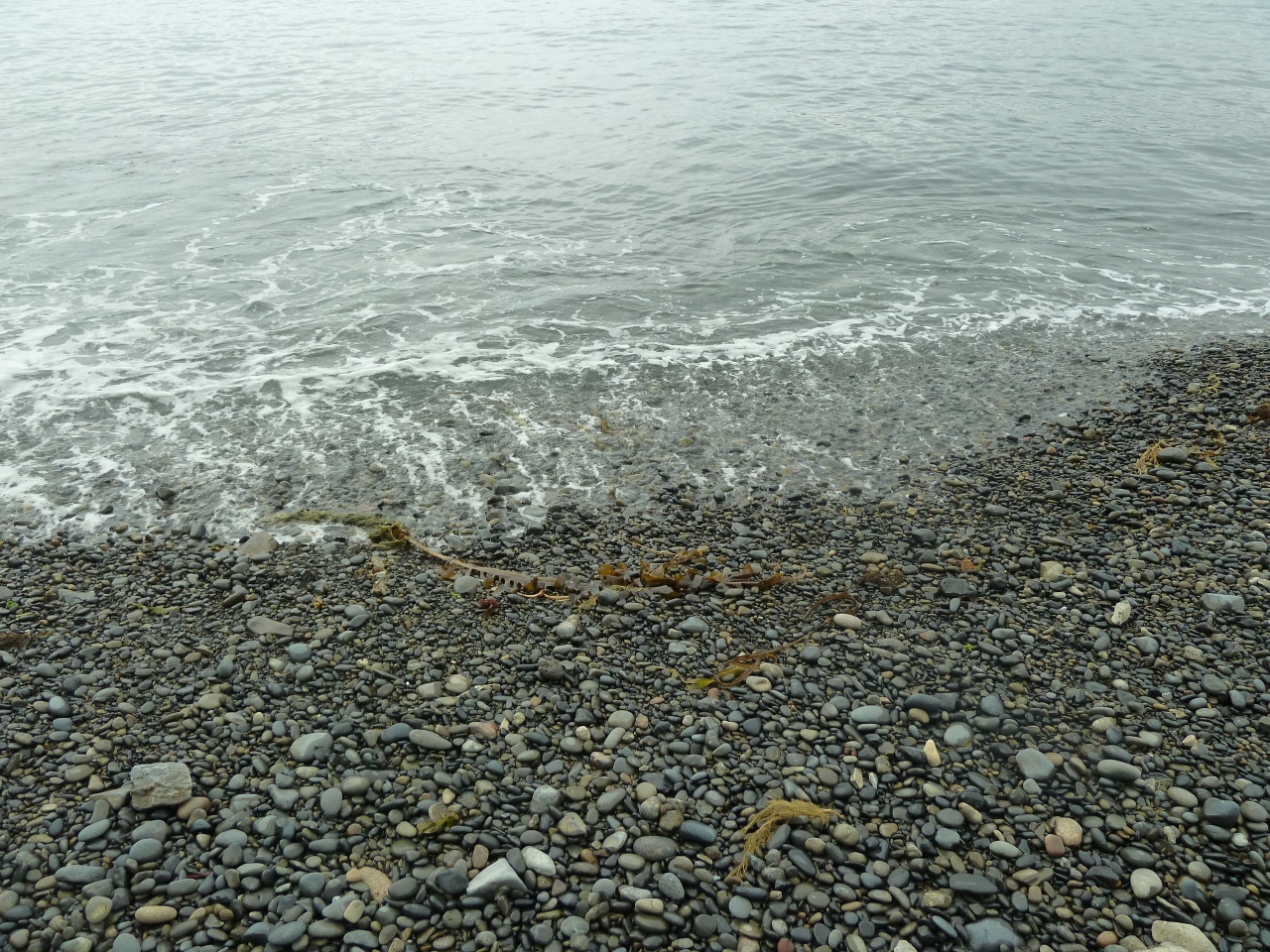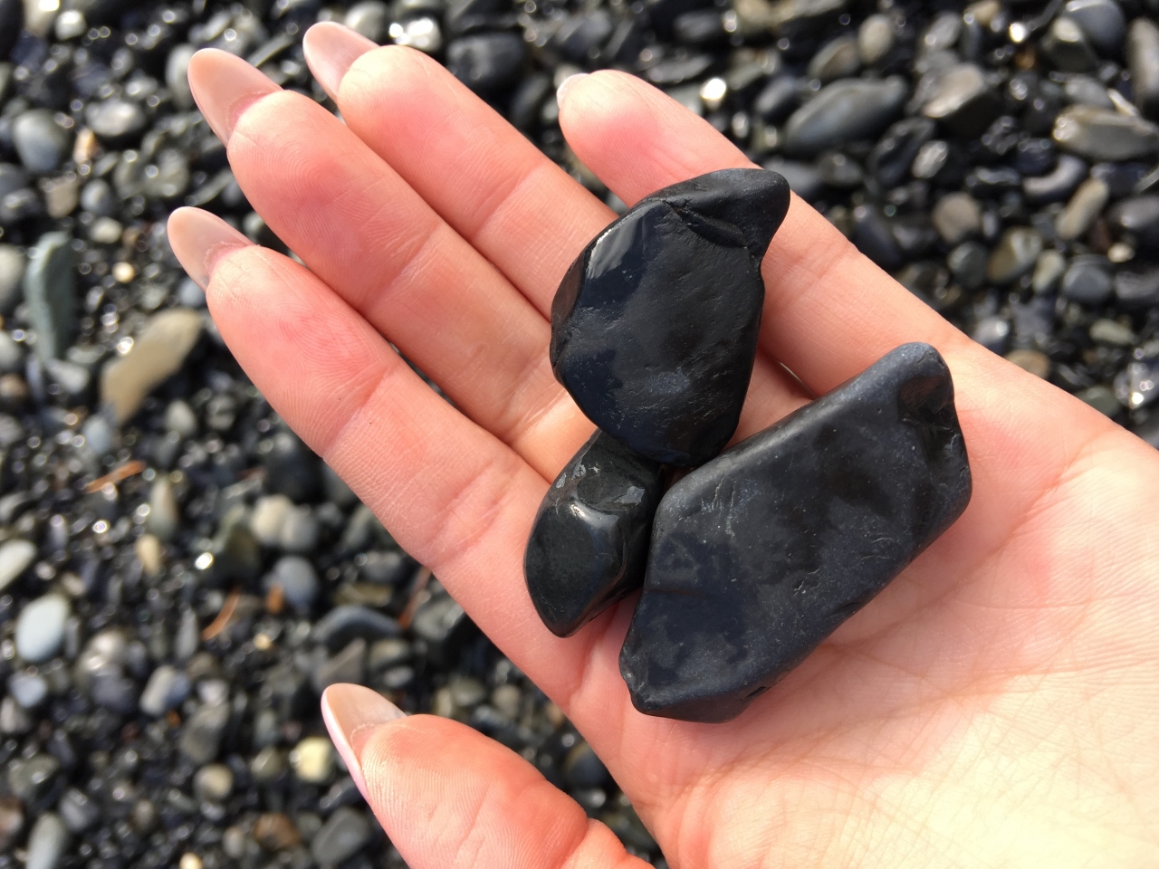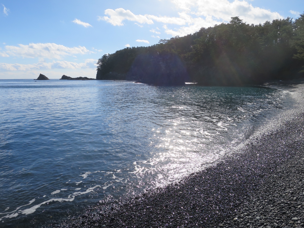 磨き上げた黒い碁石のような小石でいっぱいの碁石浜は穏やか。