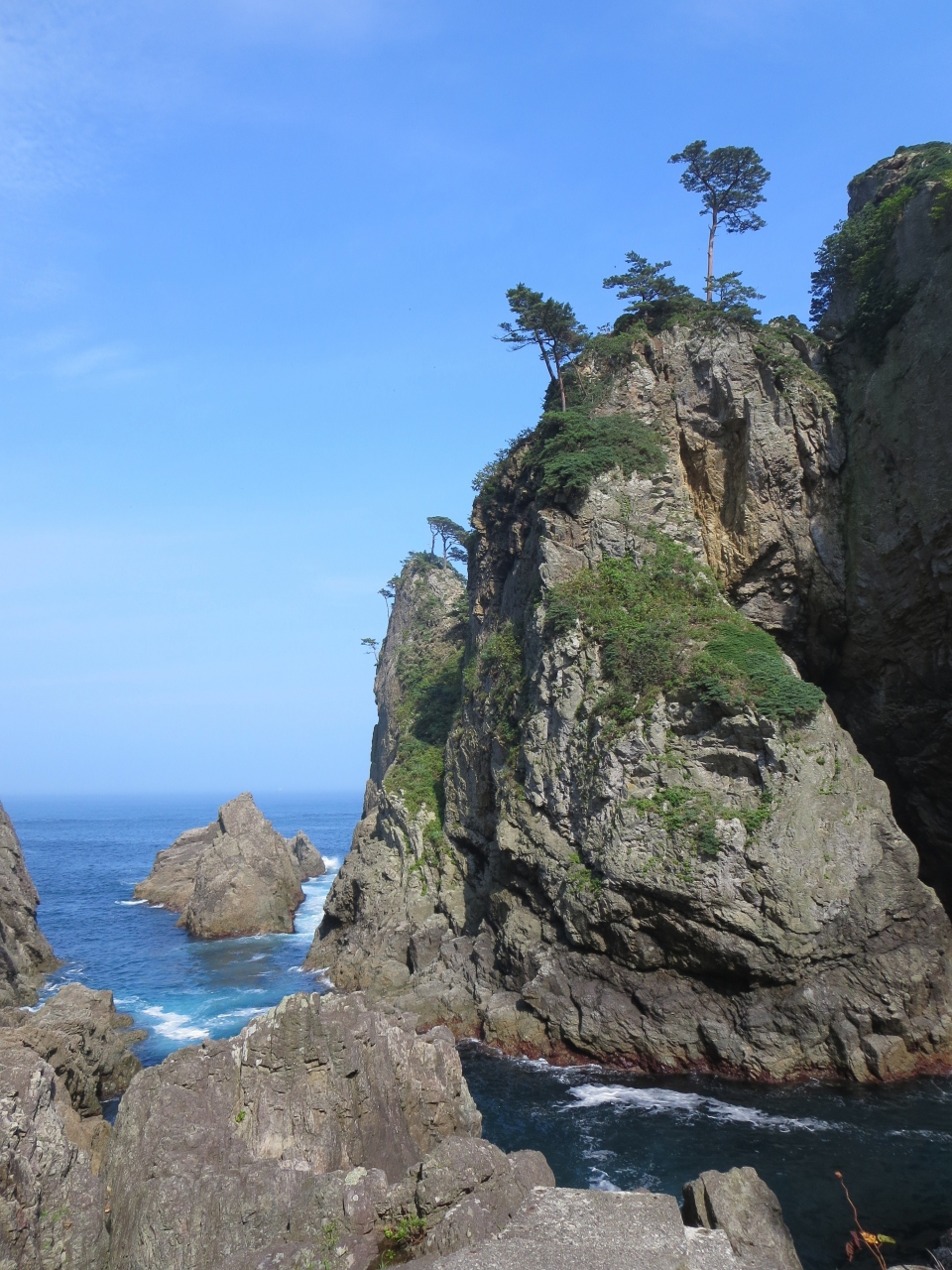 三陸海岸を代表する景勝地「北山崎」にはいくつか展望台があり、長い階段を下って海面際まで下りることもできますが、私たちは時間... 続きを読むの関係で高台から見下ろす光景のみを楽しみました。高さ200mもの断崖がかなり先まで見渡せる光景は素晴らしく、とてもダイナミックでした。 閉じる
