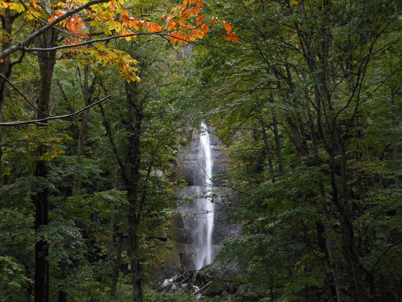木々の奥にまっすぐの滝