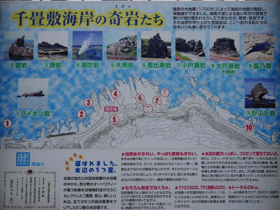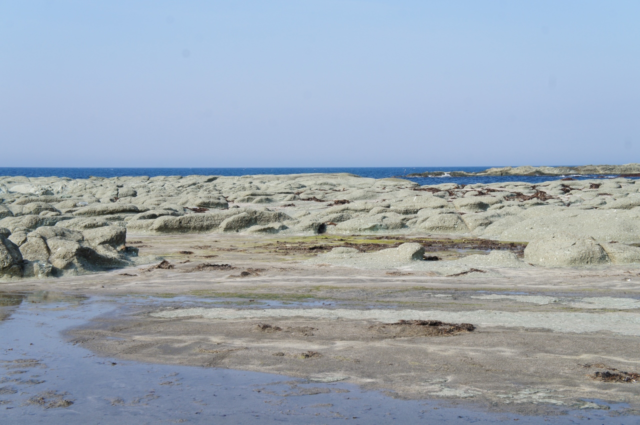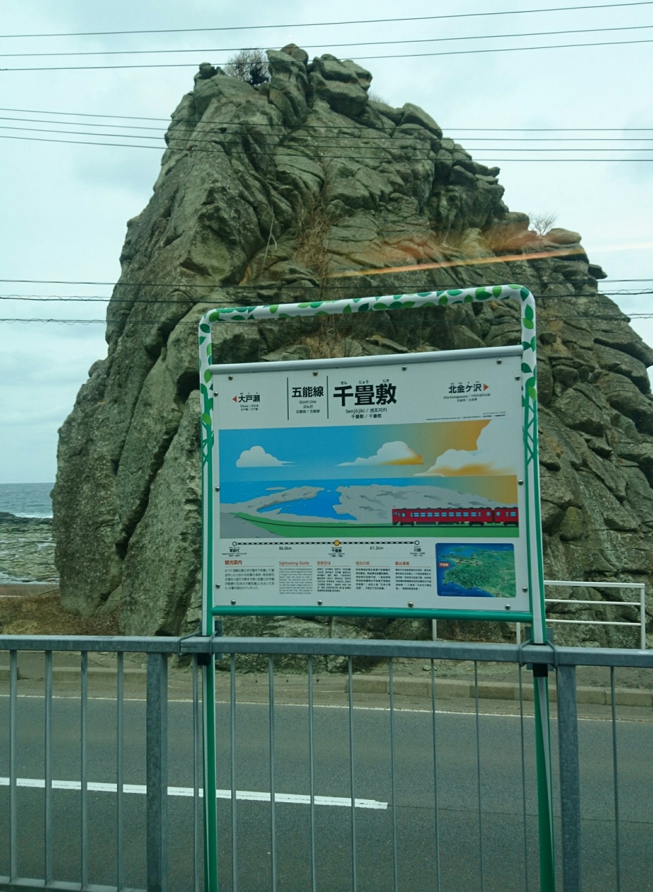 千畳敷駅を下車、道路を横断するとそこは千畳敷海岸である。1792年(寛政4年)の地震で隆起して出来た岩床の海岸です。その昔、殿様が千畳の畳を敷き酒宴を催したといわれる岩棚が広大に続いている。