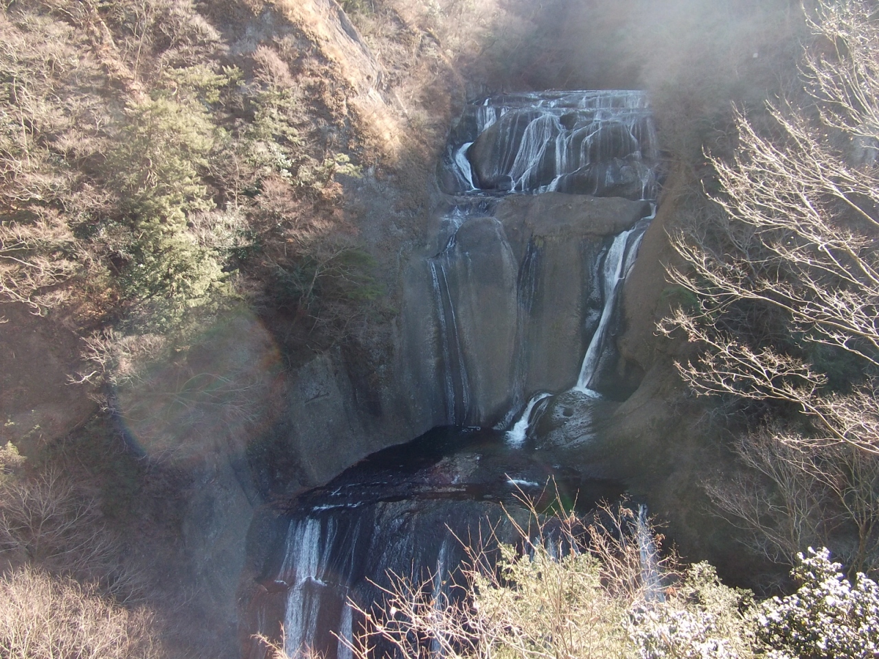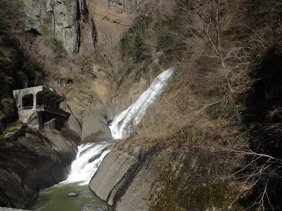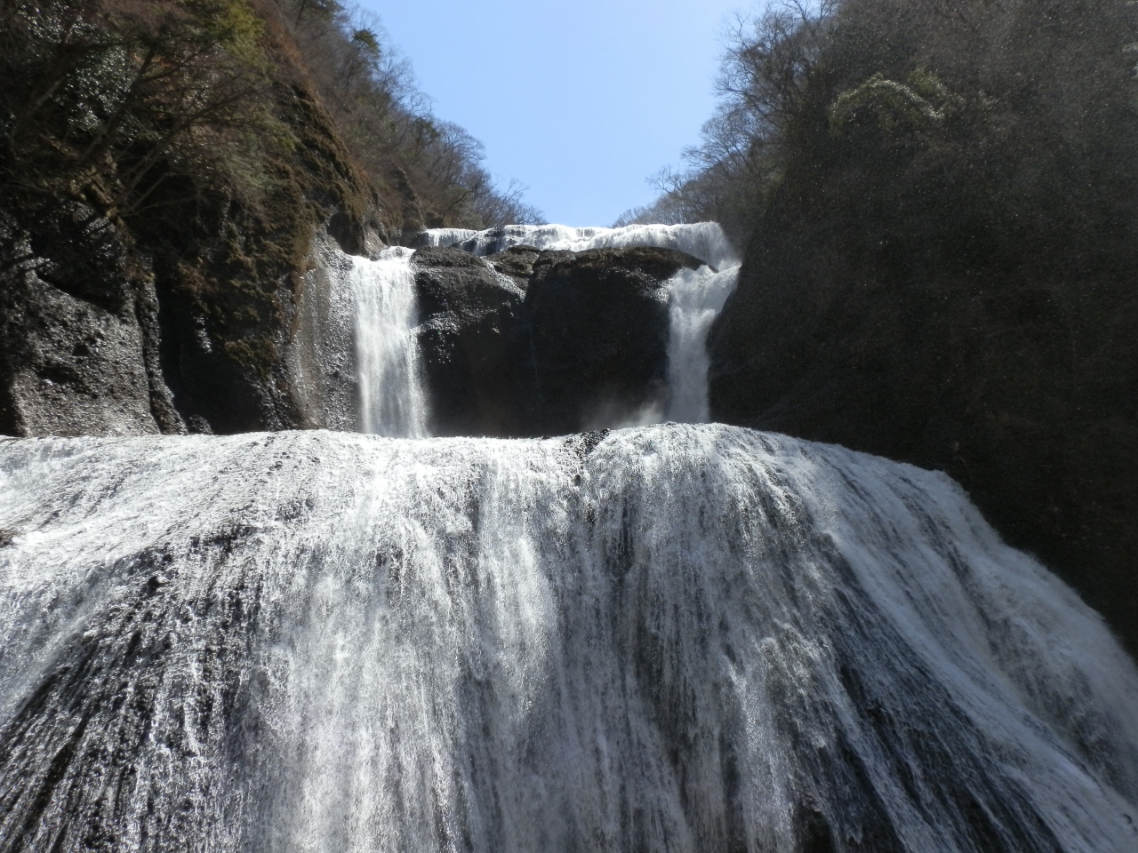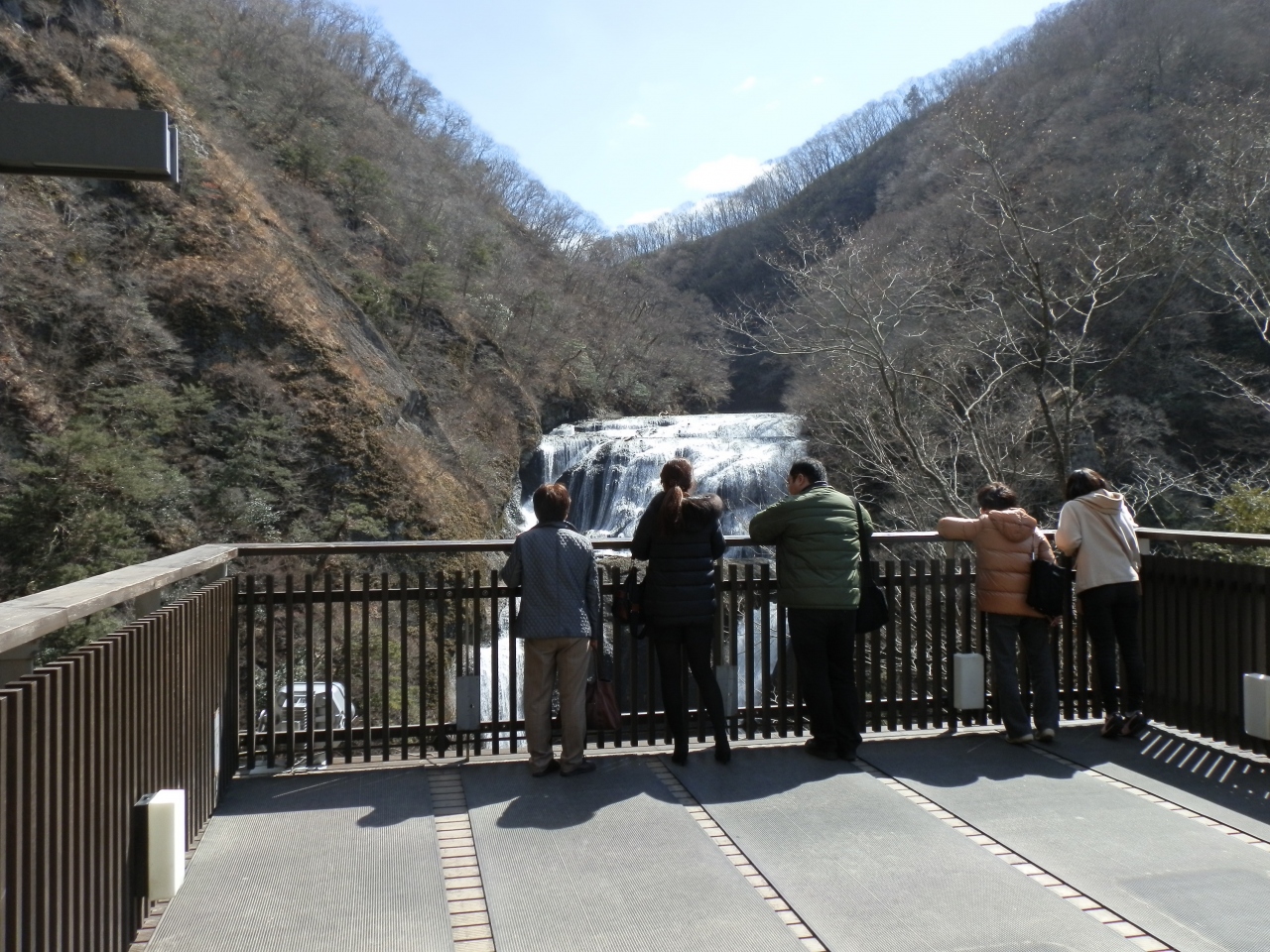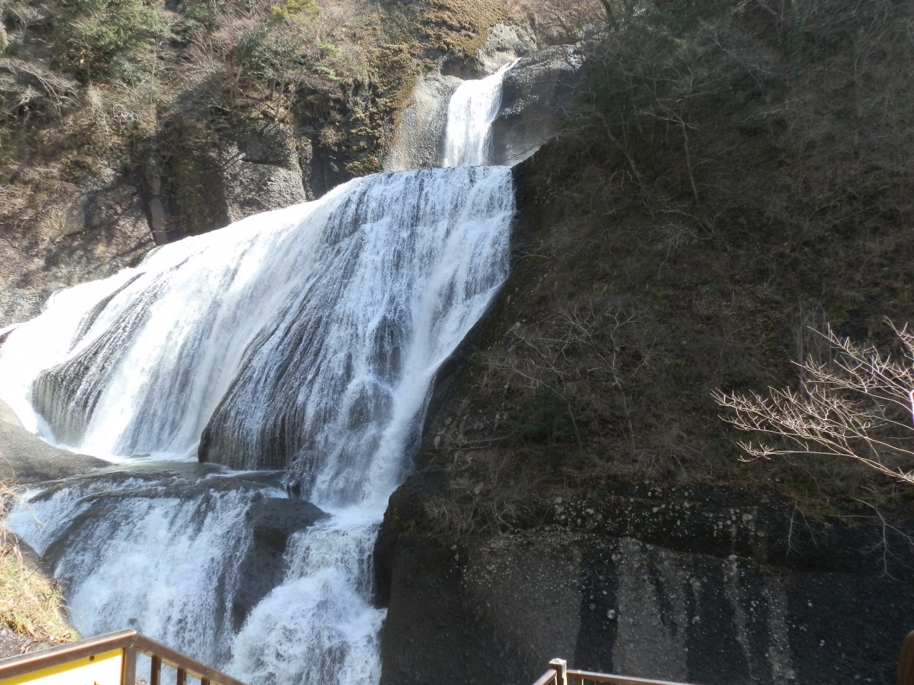 呼込みからお土産屋の駐車場に車を止めた。春浅く、車が少ない。そこが一番滝に近かった。滝を目指し坂を登った。滝の横から入った。滝の正面に出ると、音と水しぶきが凄かった。やはり、日本三名瀑のひとつだ。大きな滝である。高さが120m幅が73mその大きさに圧倒され感動した、本当に来て見て良かった。  閉じる