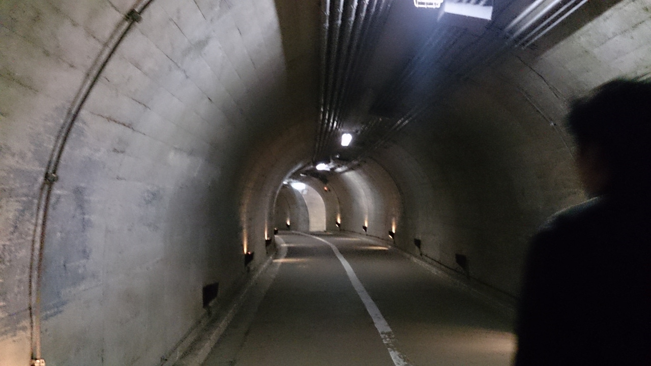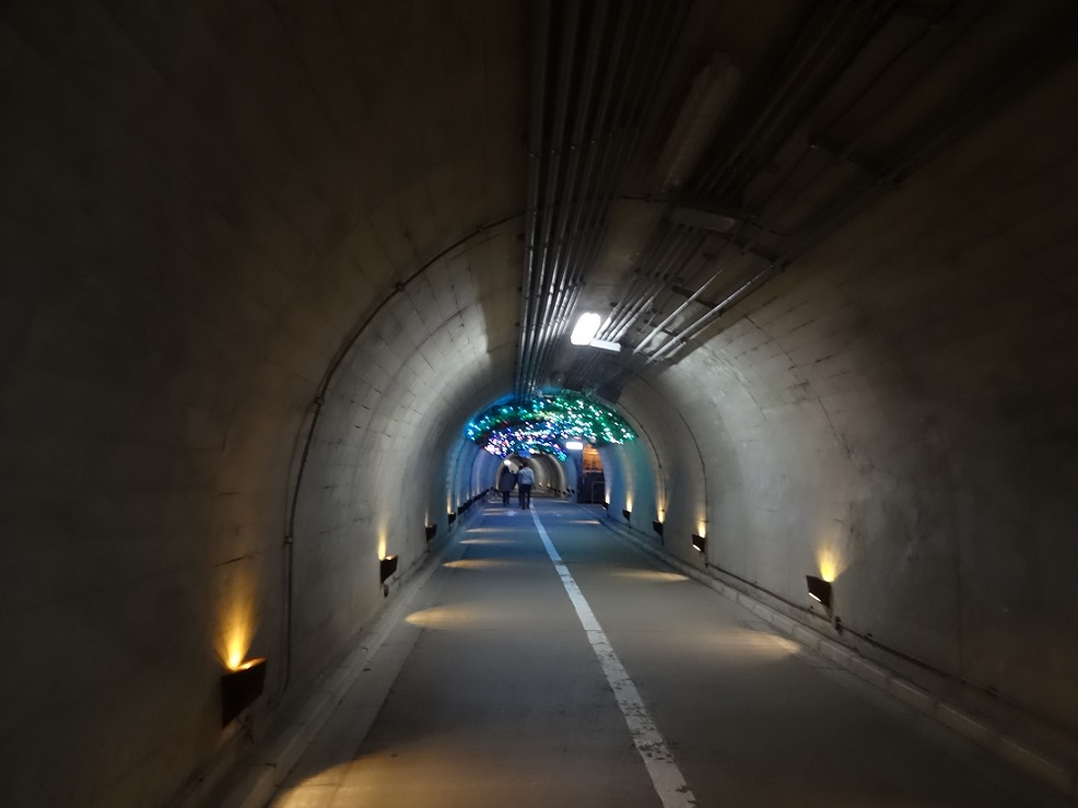 トンネル前で入場料を払う。トンネルを通って展望台やエレベータでより高い展望台までいけるが、紅葉の時期は相当混雑するのか、床には順路と進行方向の矢印が書かれていた。
