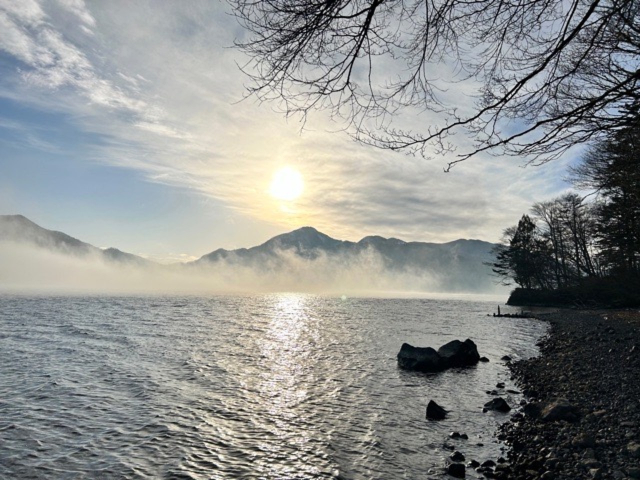 翌朝は宿泊した中禅寺金谷ホテルから中禅寺湖畔まで散歩し、朝の静かな湖を眺めました