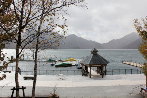 中禅寺温泉のバス停から5分ほど歩くと湖岸に到着。(華厳の滝とは反対方向です)
