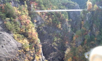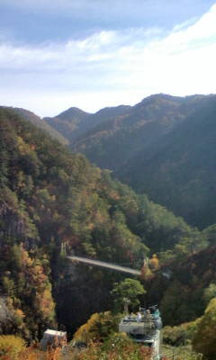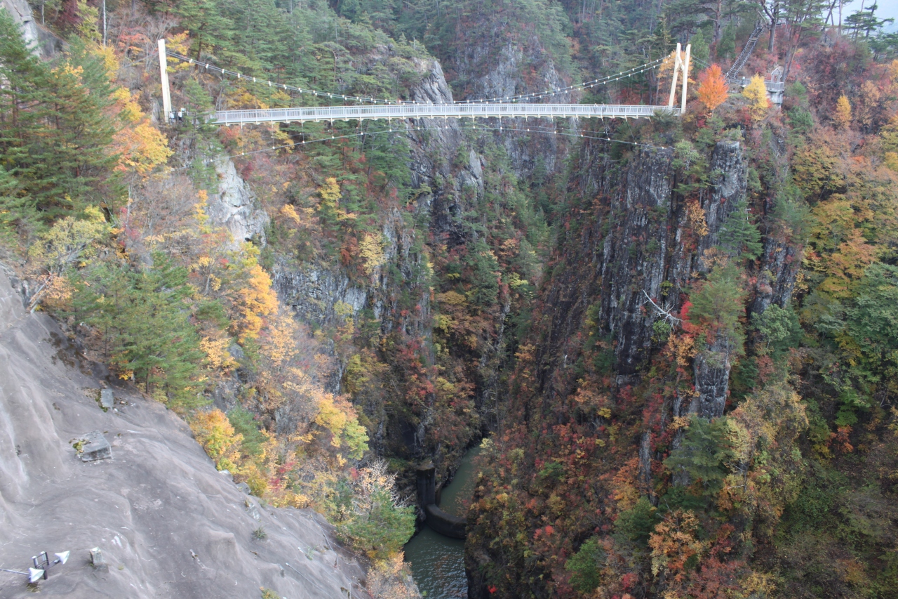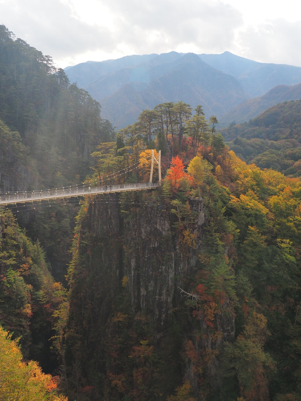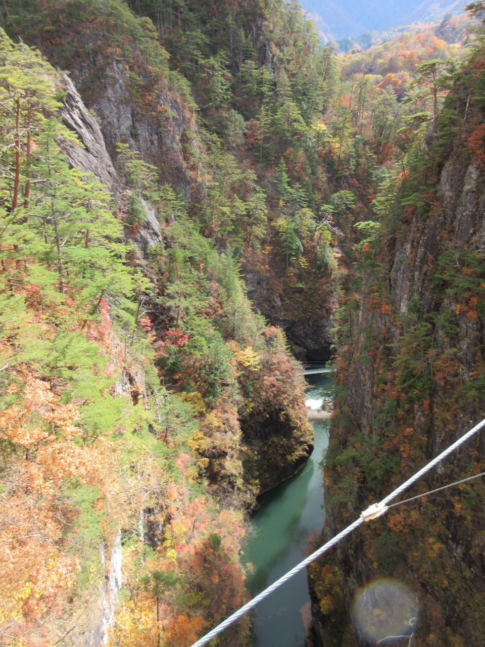 橋の中央部へ進むとそこは深い渓谷のどまんなか。100メートルほど下には青い川の流れが、そして川の両側は100メートルほどの岩壁と色鮮やかな紅葉。