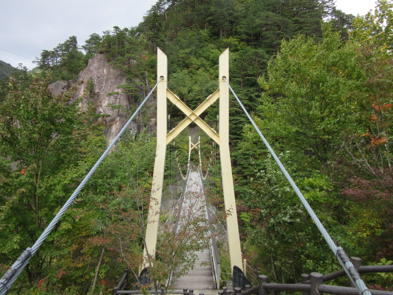ダムサイトからも切り立った美しい瀬戸合峡を望むことが出来ますが、目を引くのはやはり「渡らっしゃい吊橋」です。