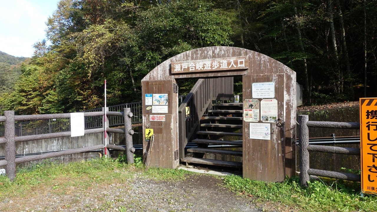 瀬戸合峡に行くには県道23号線から分岐した細い道を川俣ダム駐車場まで行く。駐車場の先に遊歩道入口のゲートがあり、そこを進むと川俣ダムに着く。川俣ダムはコンクリートアーチ式ダムで堤長131m、堤高117m。正面の展望台から見るとなかなかの迫力。ダム湖の下流が瀬戸合峡で、「渡らっしゃい吊り橋」まで遊歩道が続いている。吊り橋は近くに見えるが途中には100段以上の階段を上り下りす必要がある。しかし吊り橋近くから見る瀬戸合峡は本当に素晴らしく苦労の甲斐は十分。