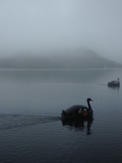 霧に包まれた榛名湖湖畔は幻想的な美しさ