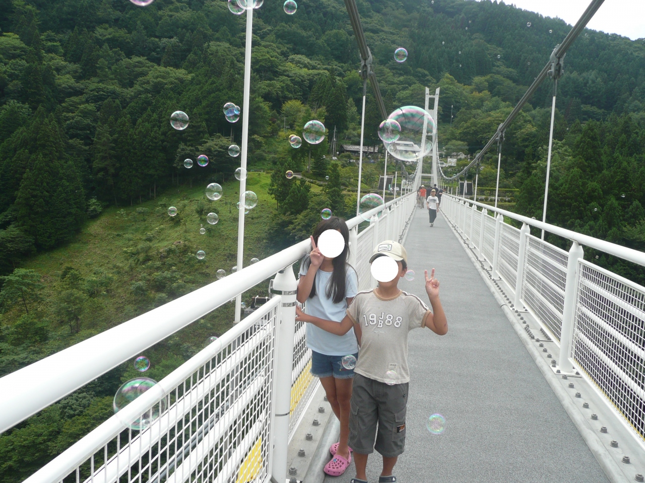高さ90m、長さ225mの徒歩専用としては日本有数の規模を誇る釣り橋です。尚、4月?11月の土・日・祝日(夏休み期間は毎日)は10時から15時半まで30分おきに10分間スカイブリッジからシャボン玉が舞う風景が見られます。※天候の悪い日は中止。