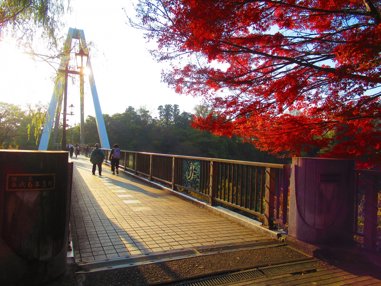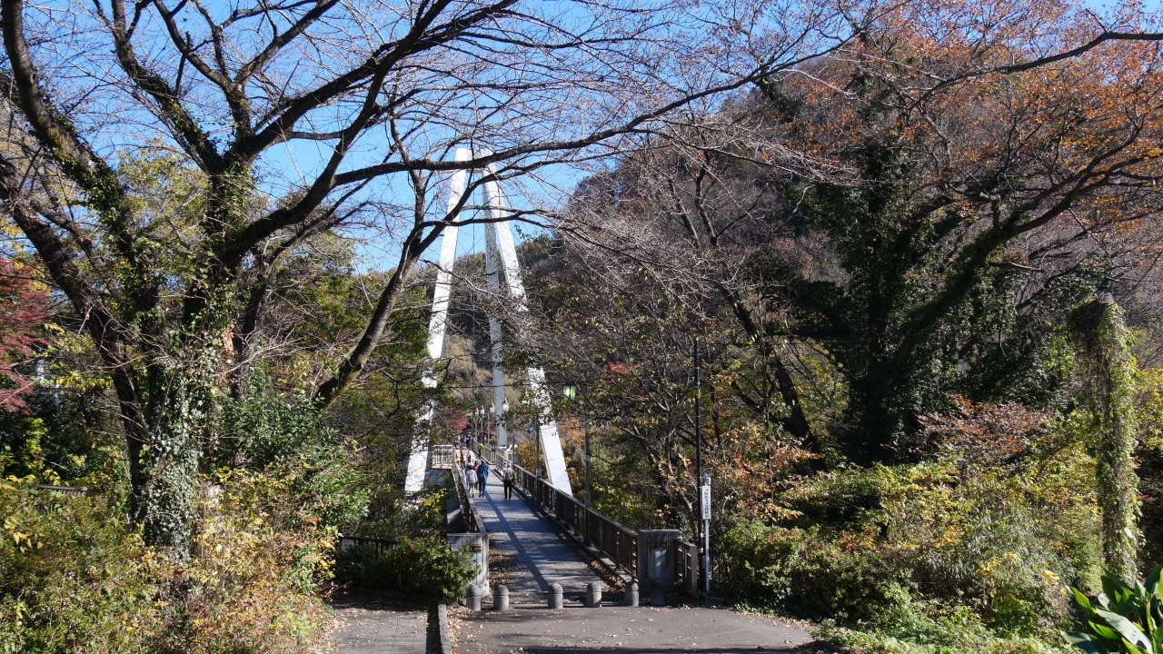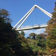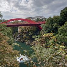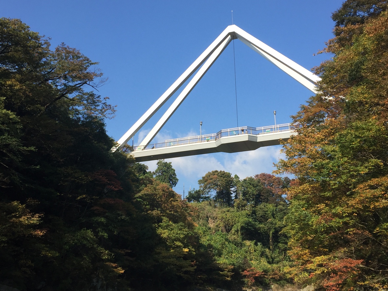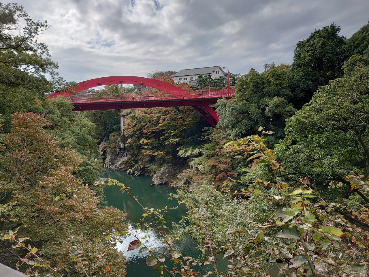 見所は、真赤な高津戸橋と、純白のはねたき橋から眺める峡谷風景。