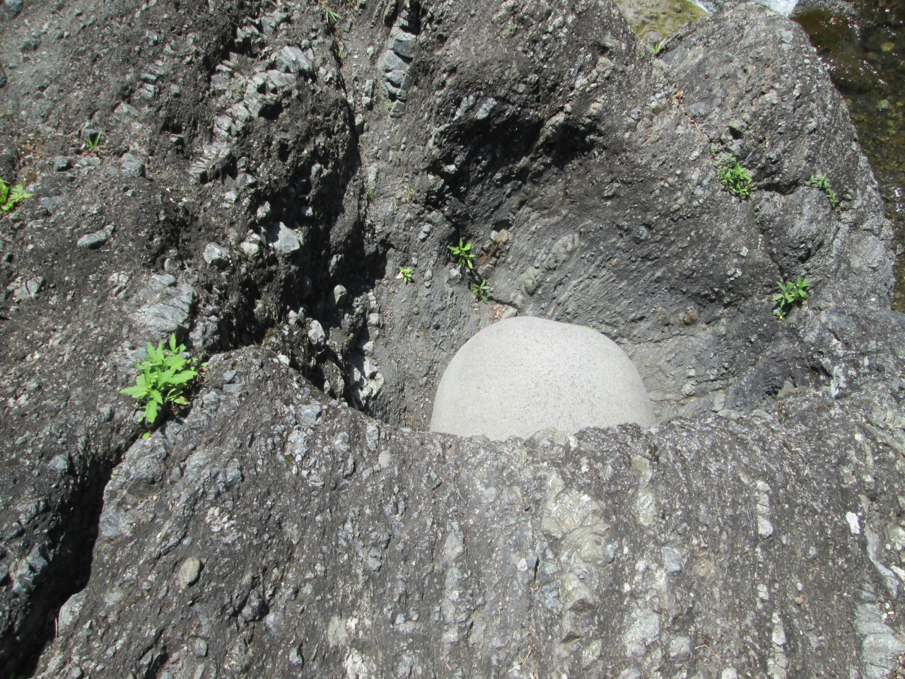 ポットホールの石穴の中に、如何にも「この石が巨大な穴を穿ちました」な感じで楕円形の巨大な石が入っていますが、多分、真赤な偽物で、楕円の石は雰囲気作りのために置かれているだけと思われます。