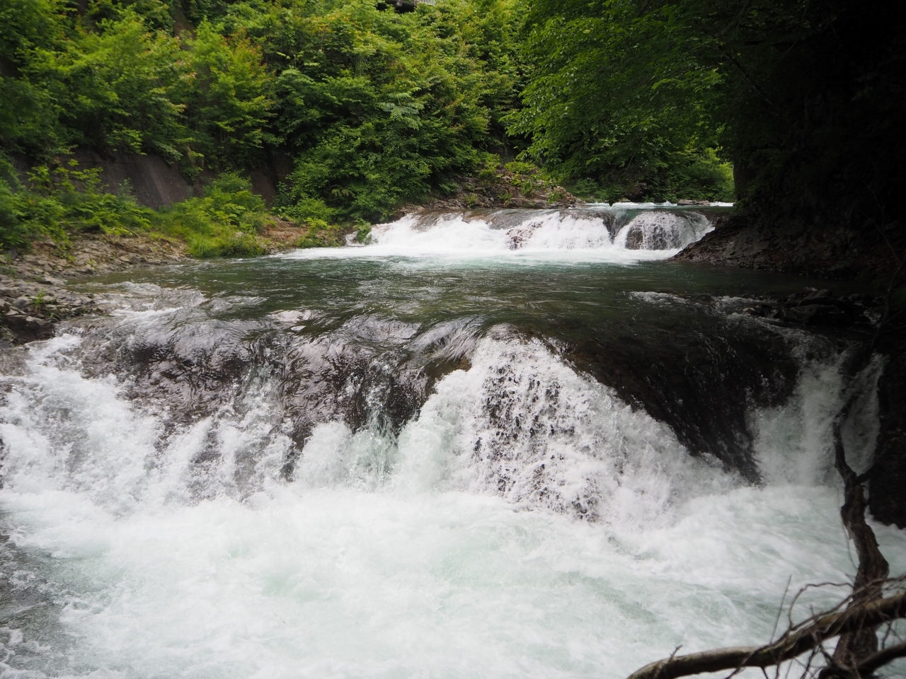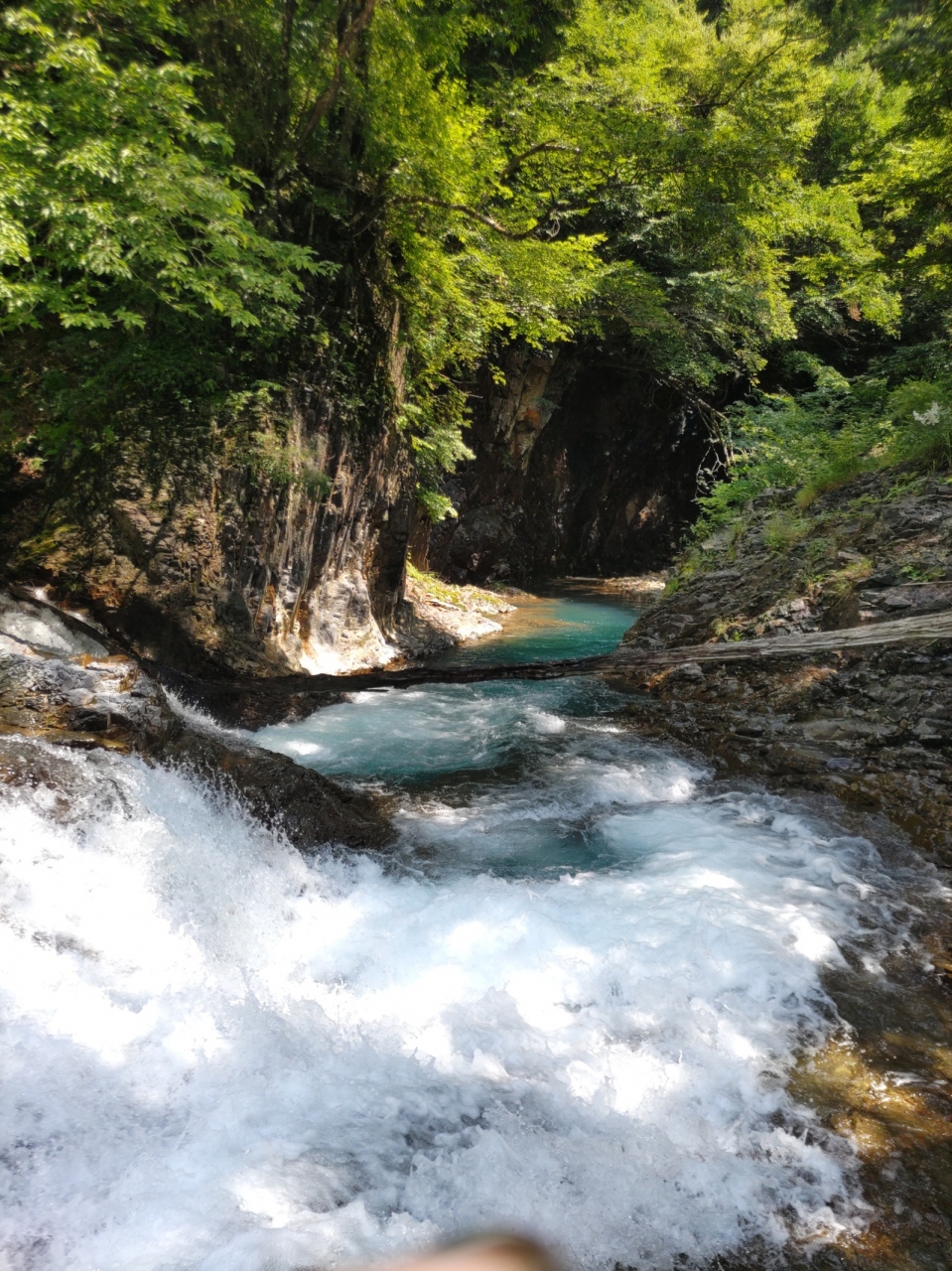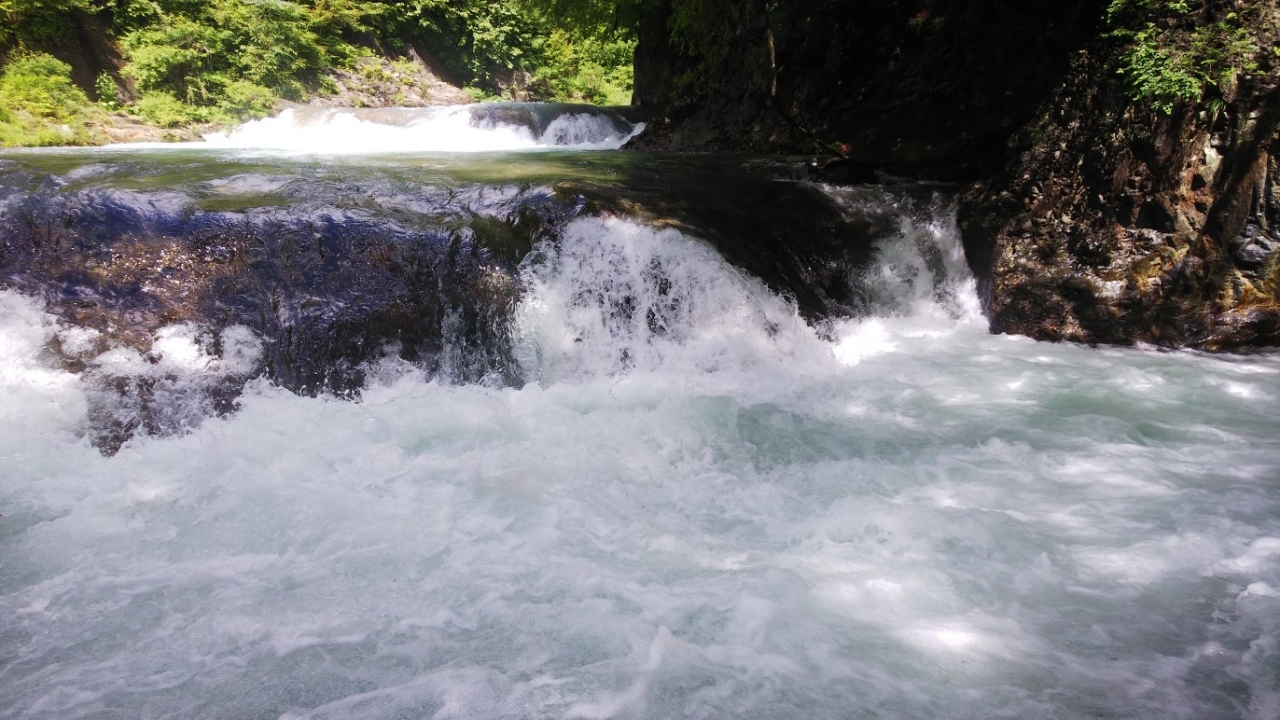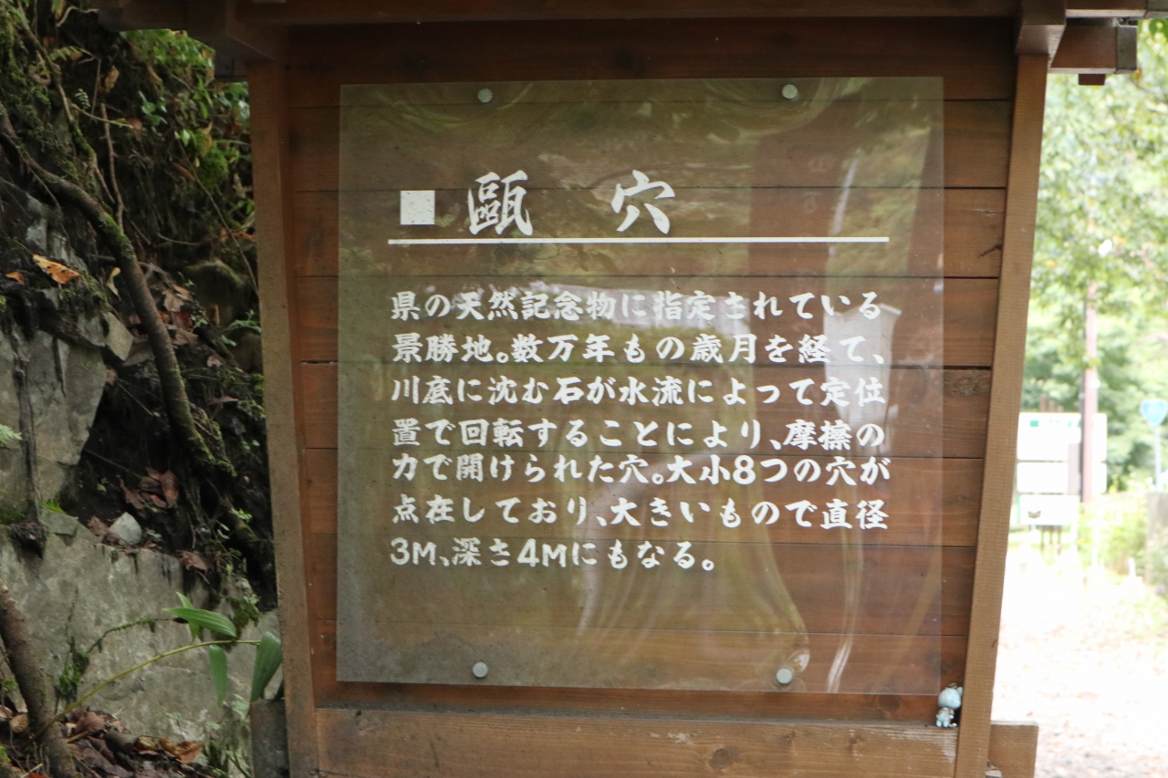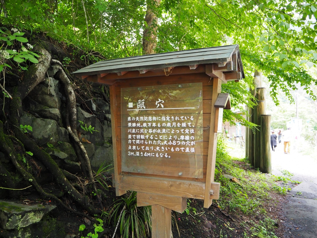 川の水が渦状に巻くことで、中の石などが川底を削り甌穴が作られるのだそう。梅雨時で水量が多くて穴の様子はよく見えませんでしたが、滝のような白いしぶきと共に綺麗な青色の水は少し見えました。