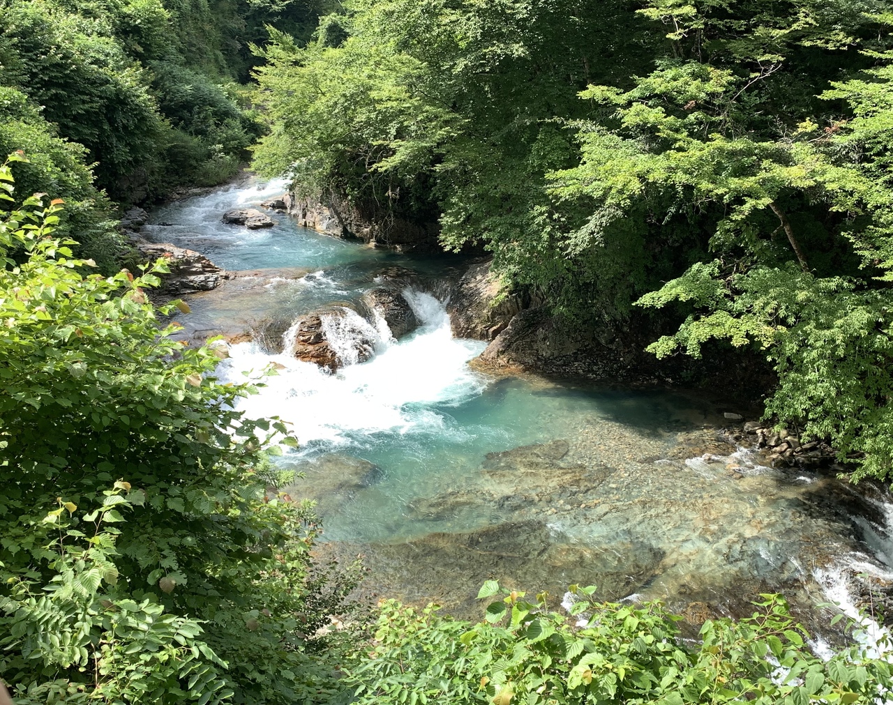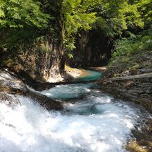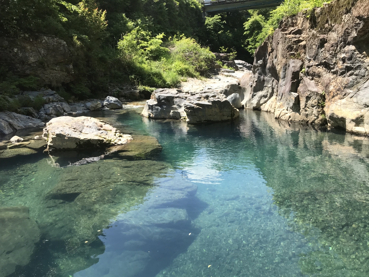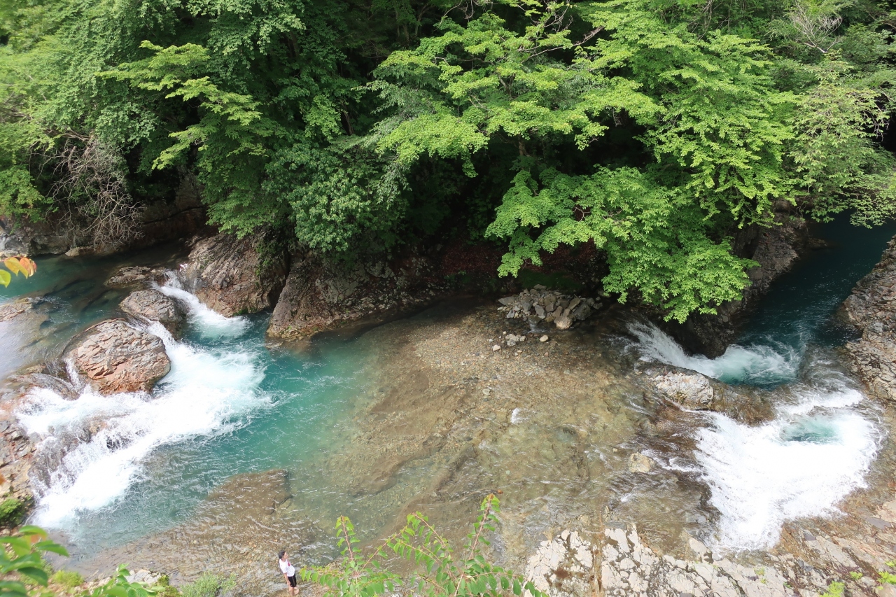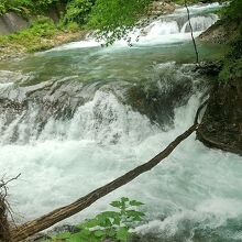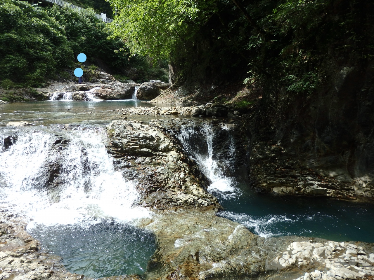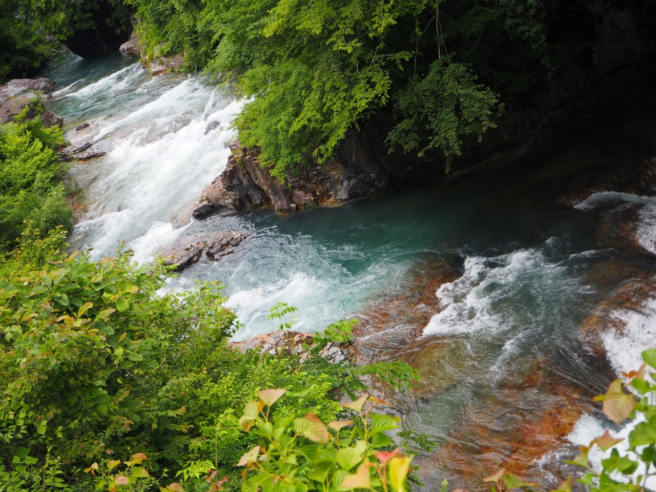 川の水が渦状に巻くことで、中の石などが川底を削り甌穴が作られるのだそう。梅雨時で水量が多くて穴の様子はよく見えませんでしたが、滝のような白いしぶきと共に綺麗な青色の水は少し見えました。