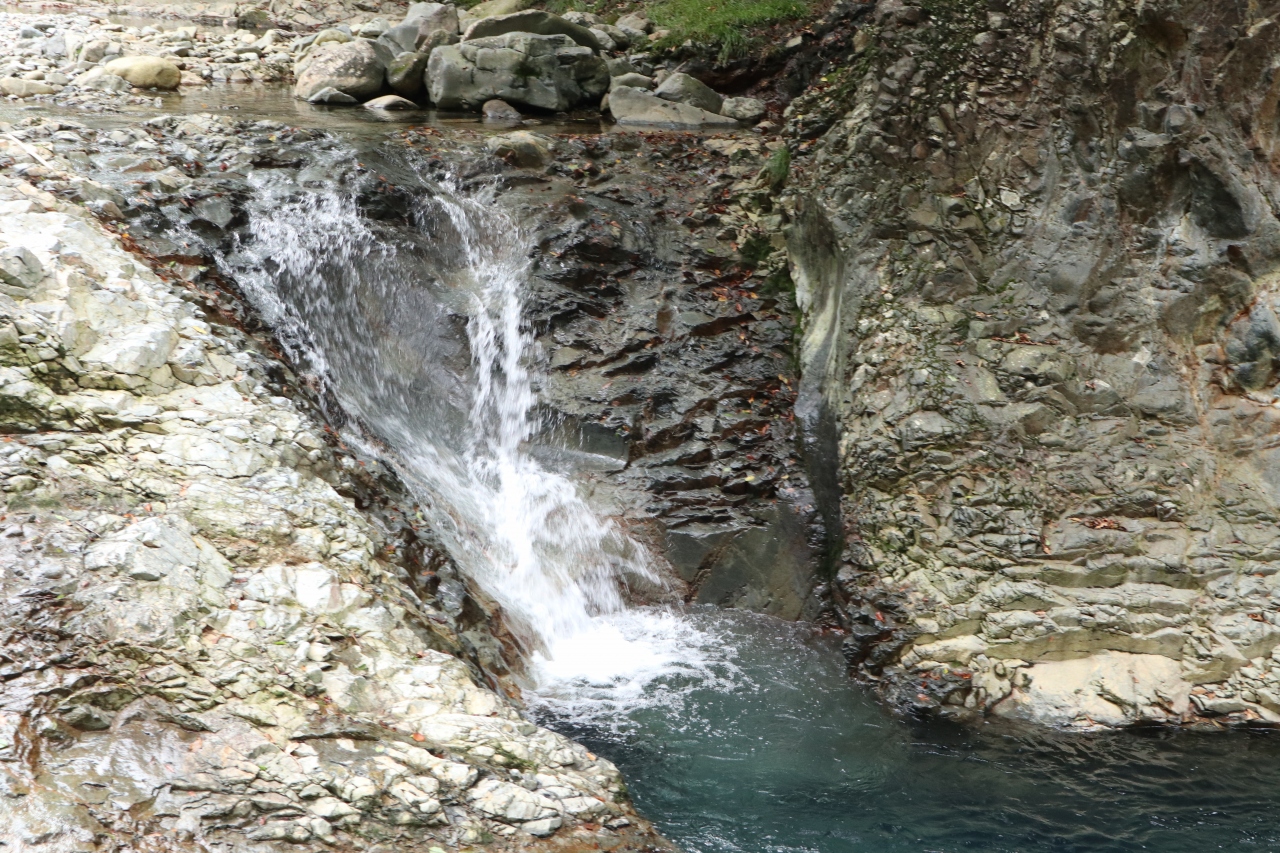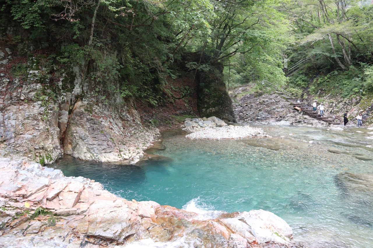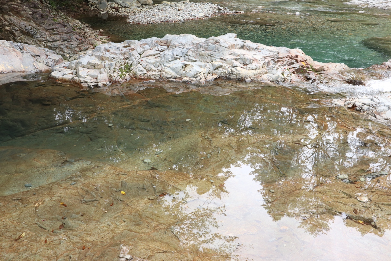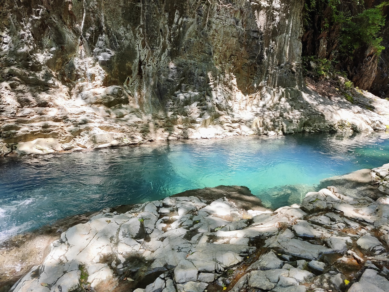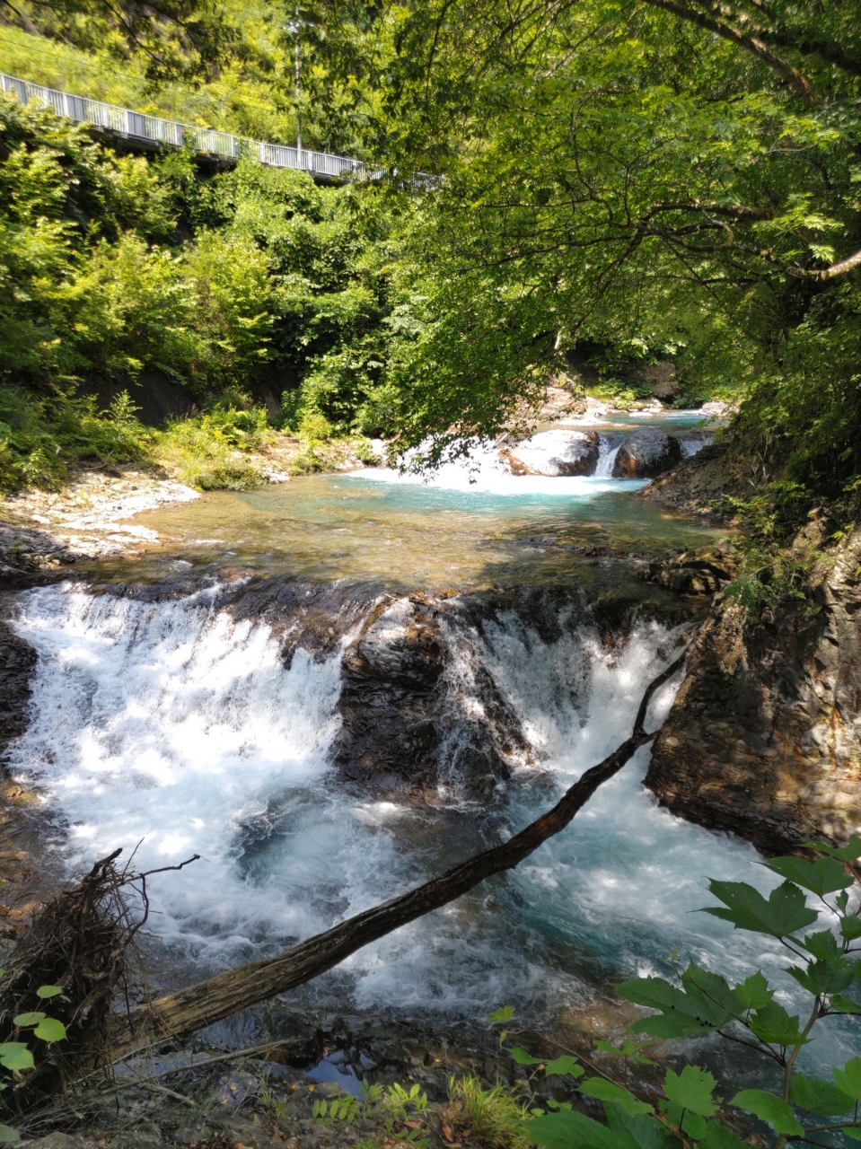 川の水が渦状に巻くことで、中の石などが川底を削り甌穴が作られるのだそう。梅雨時で水量が多くて穴の様子はよく見えませんでしたが、滝のような白いしぶきと共に綺麗な青色の水は少し見えました。