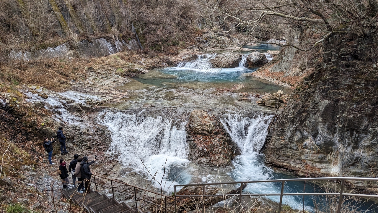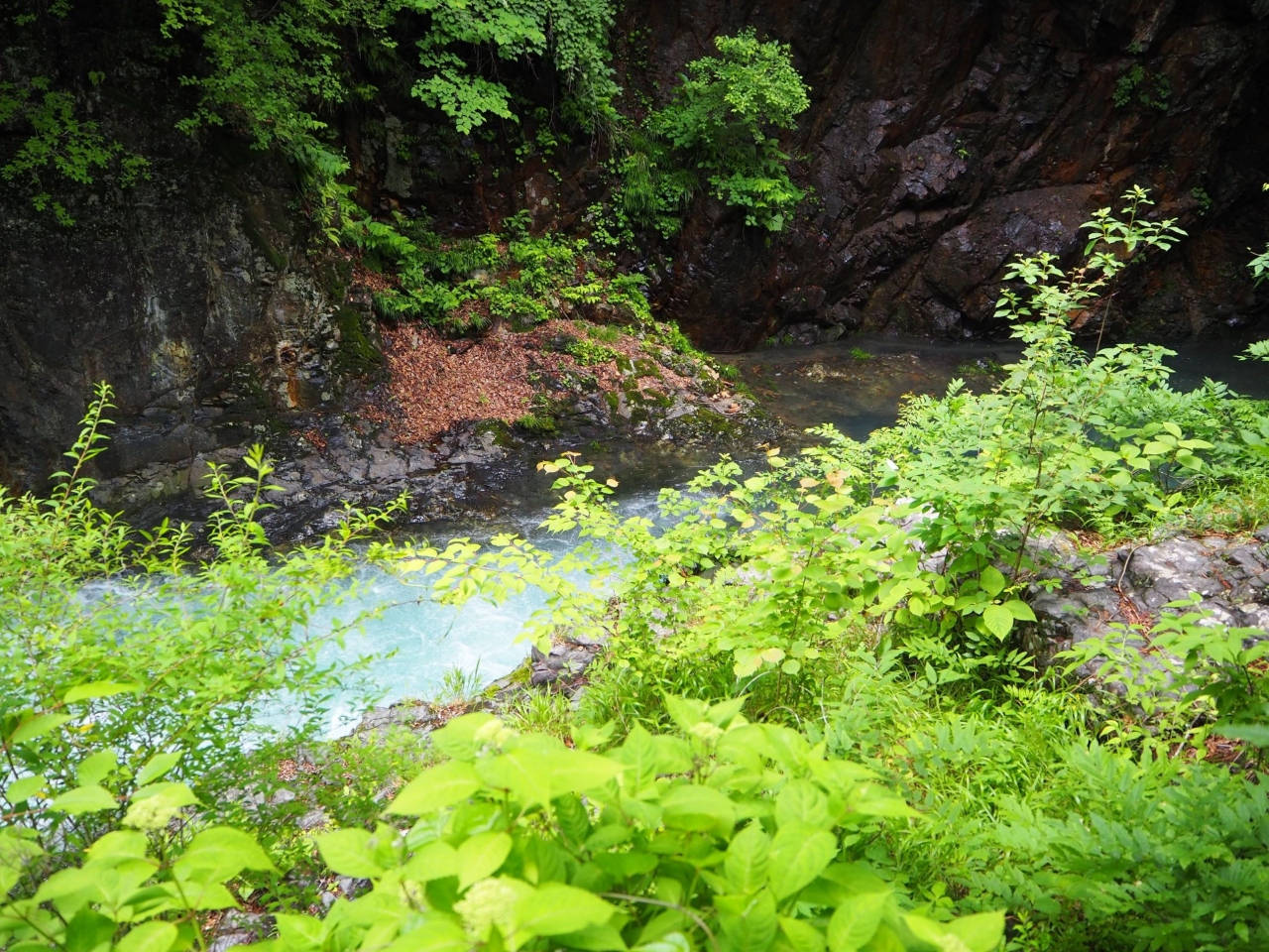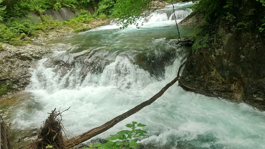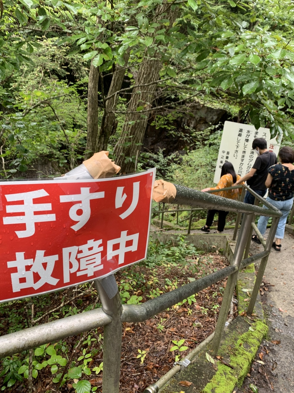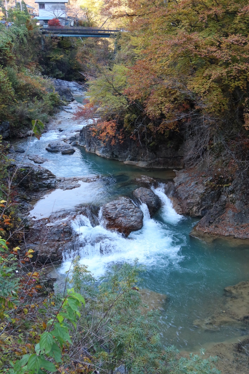 川の水が渦状に巻くことで、中の石などが川底を削り甌穴が作られるのだそう。梅雨時で水量が多くて穴の様子はよく見えませんでしたが、滝のような白いしぶきと共に綺麗な青色の水は少し見えました。