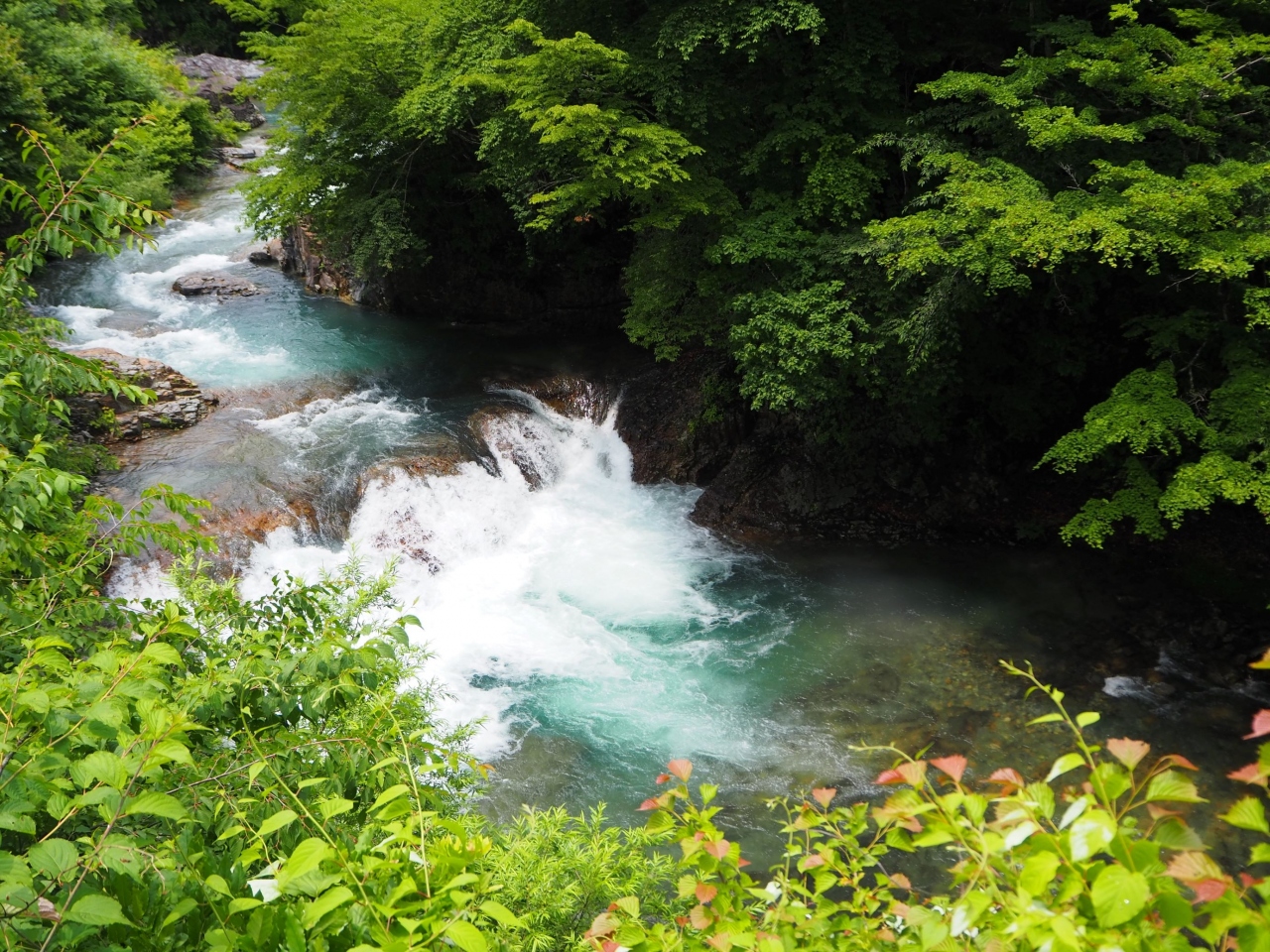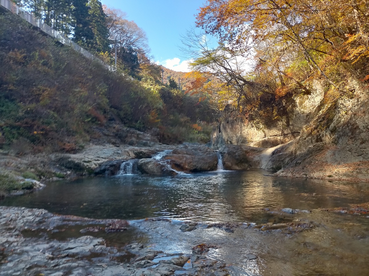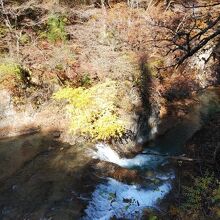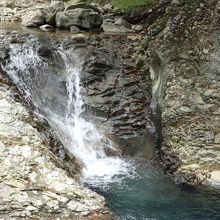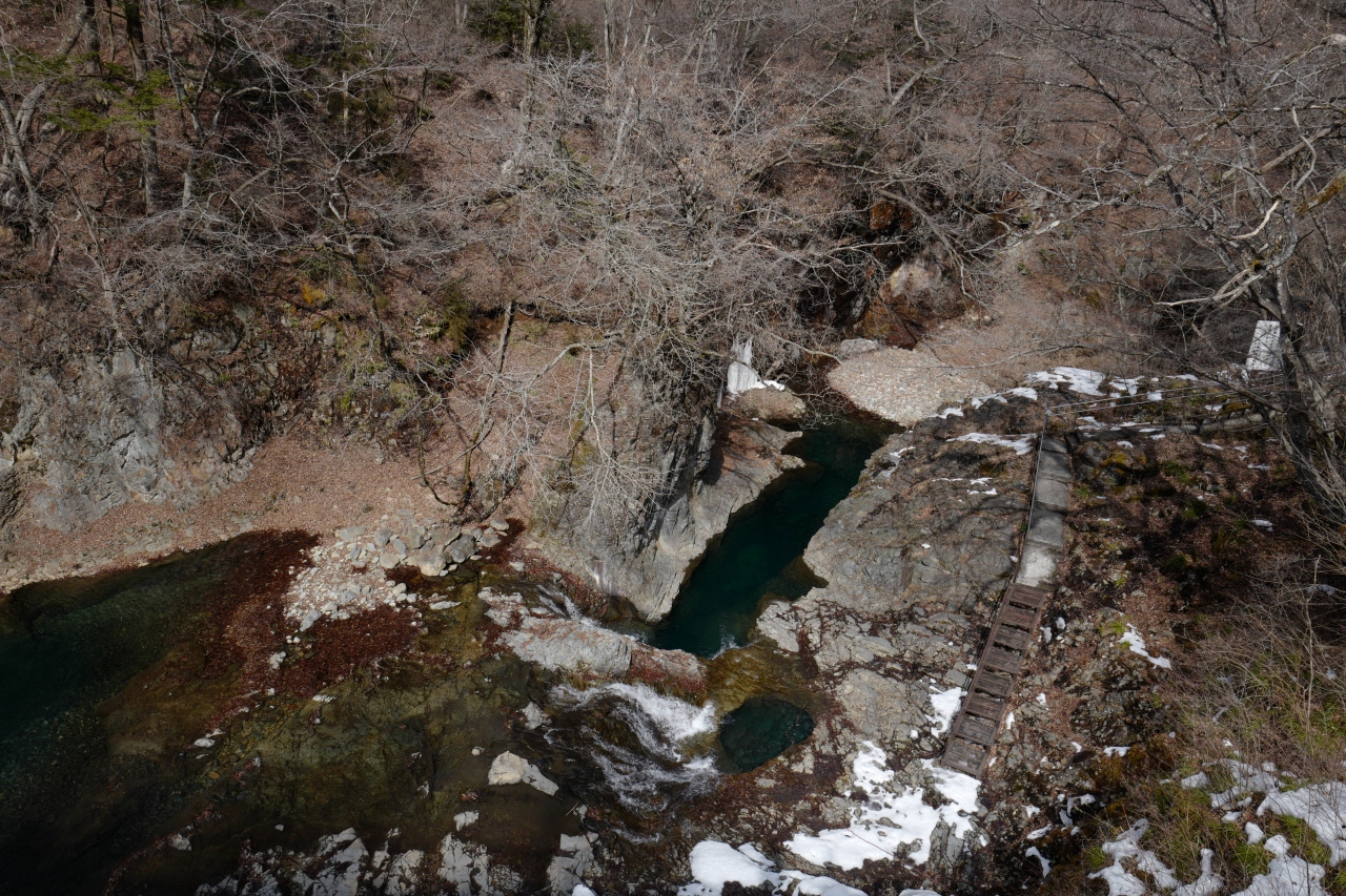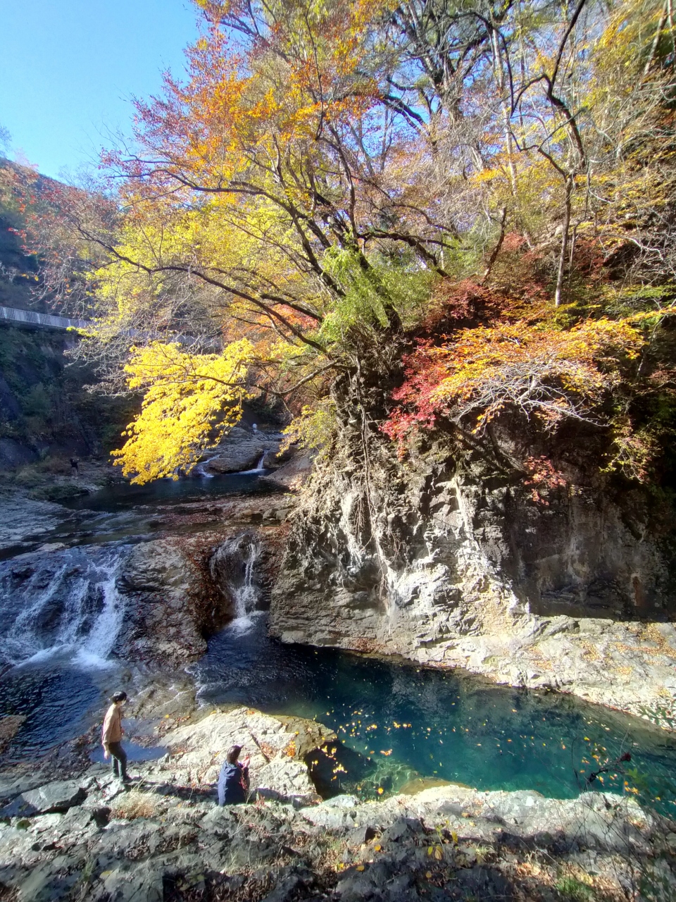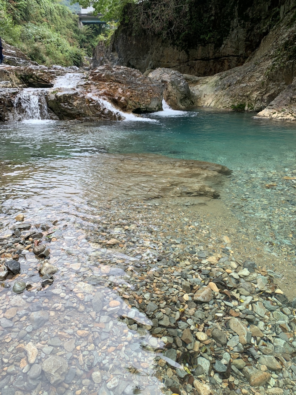 川の水が渦状に巻くことで、中の石などが川底を削り甌穴が作られるのだそう。梅雨時で水量が多くて穴の様子はよく見えませんでしたが、滝のような白いしぶきと共に綺麗な青色の水は少し見えました。