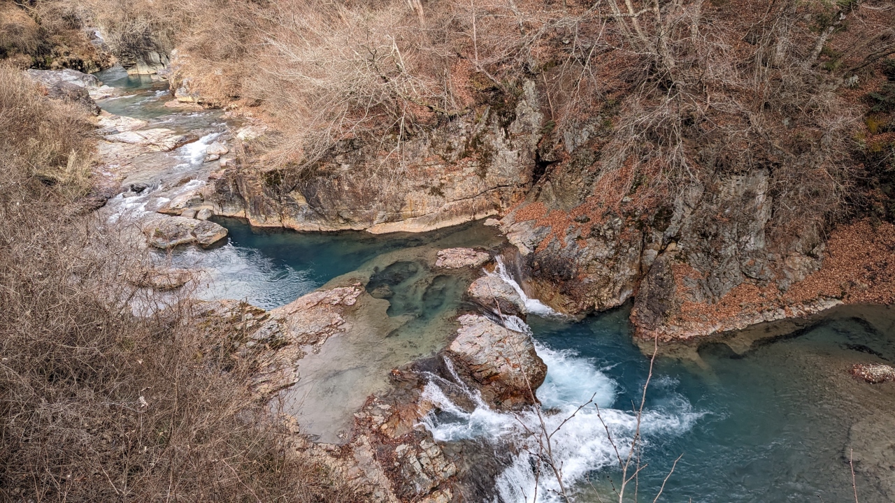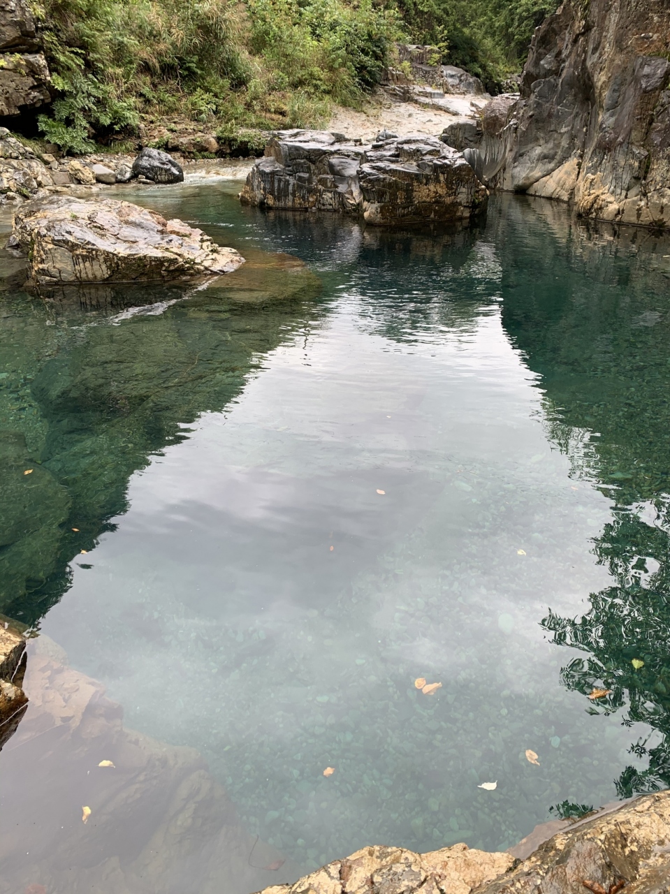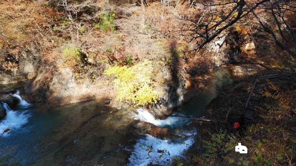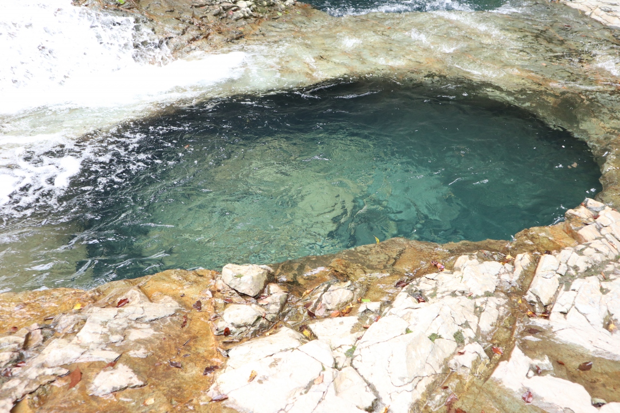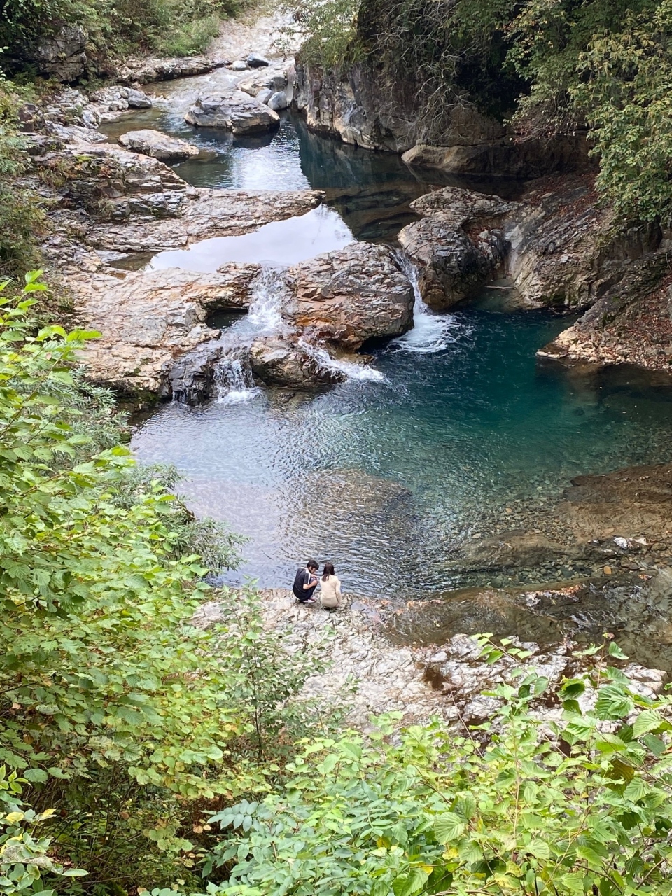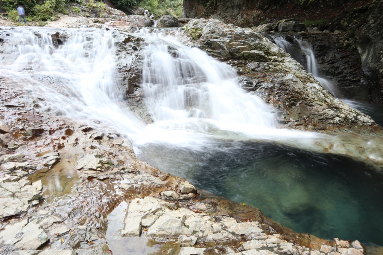 川の水が渦状に巻くことで、中の石などが川底を削り甌穴が作られるのだそう。梅雨時で水量が多くて穴の様子はよく見えませんでしたが、滝のような白いしぶきと共に綺麗な青色の水は少し見えました。