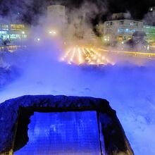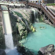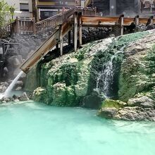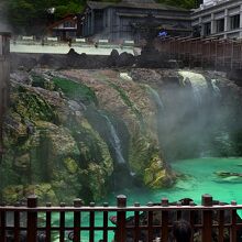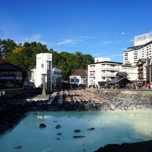 旅館街の中央にある草津温泉最大の源泉で、石柵に囲まれた幅20m、高さ60mの中から毎分約4,000リットルの熱湯が湧き出ており、硫気で黄緑色になった湯は何条もの木樋に流され、泉温を下げ、湯の花を採取して各旅館に送られる。