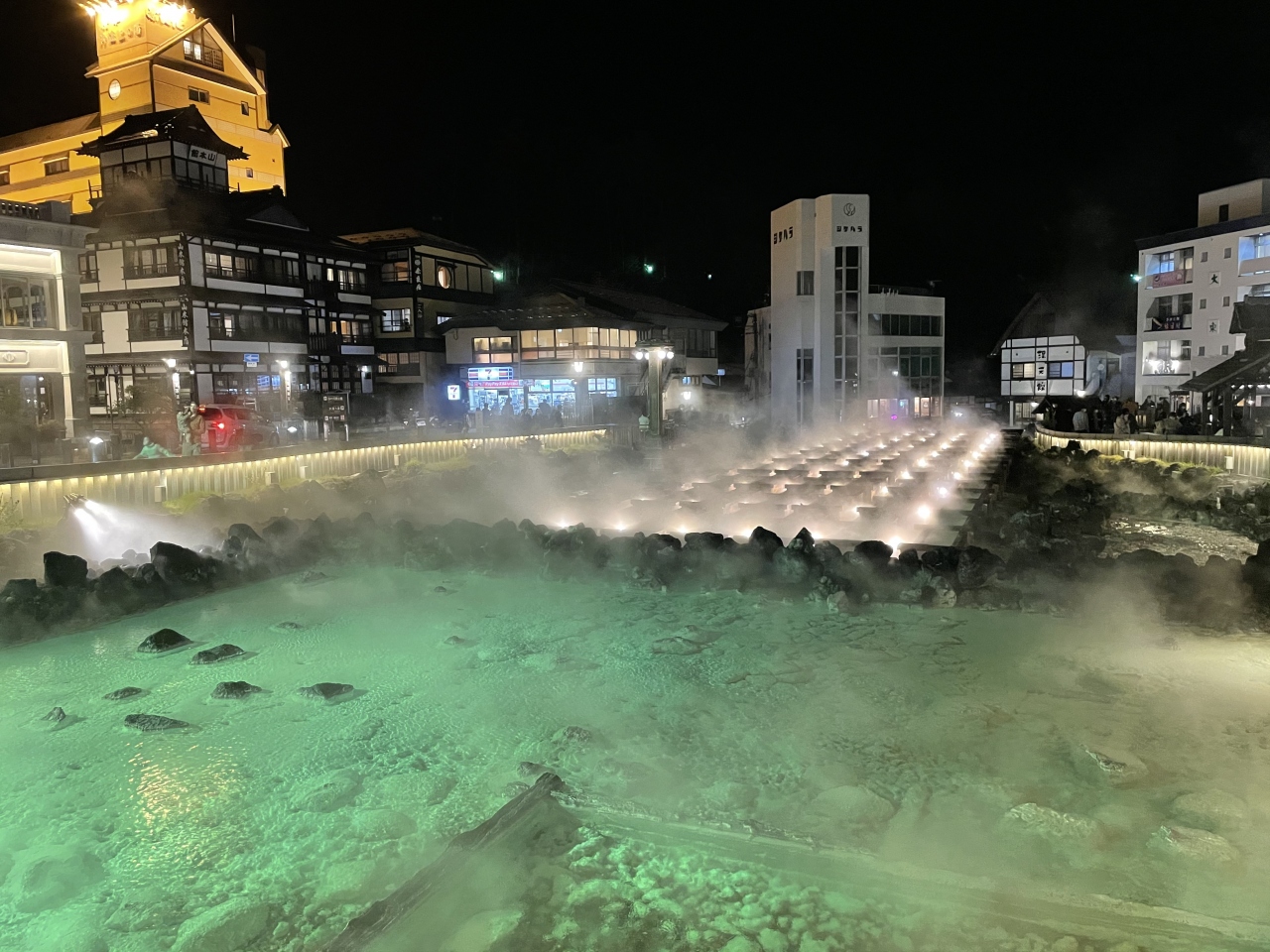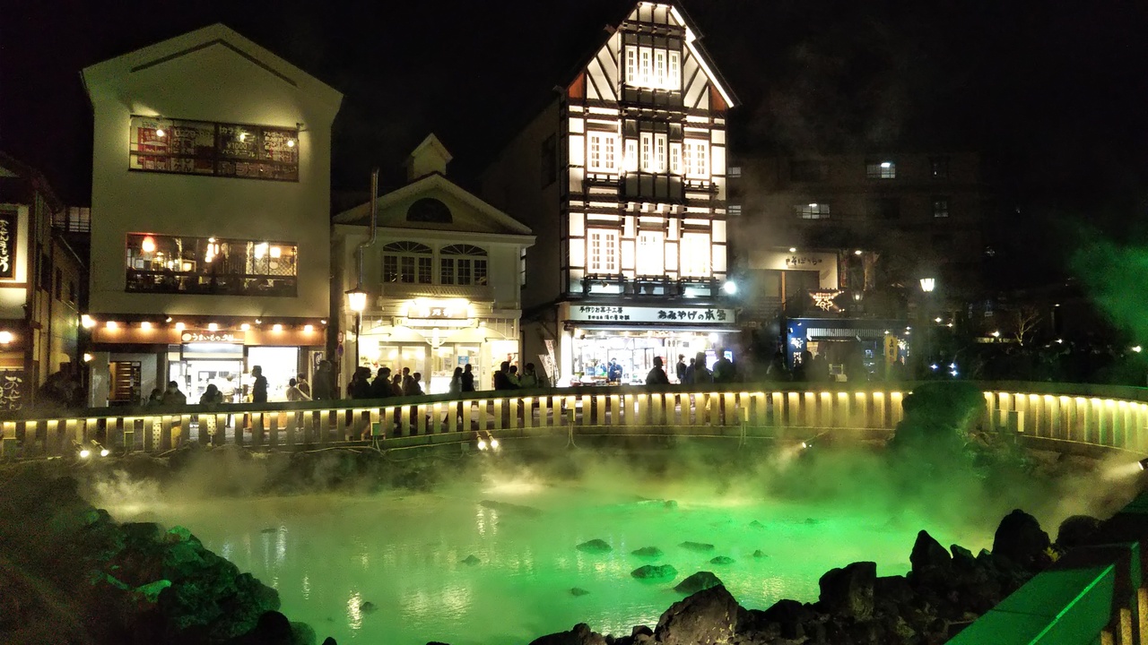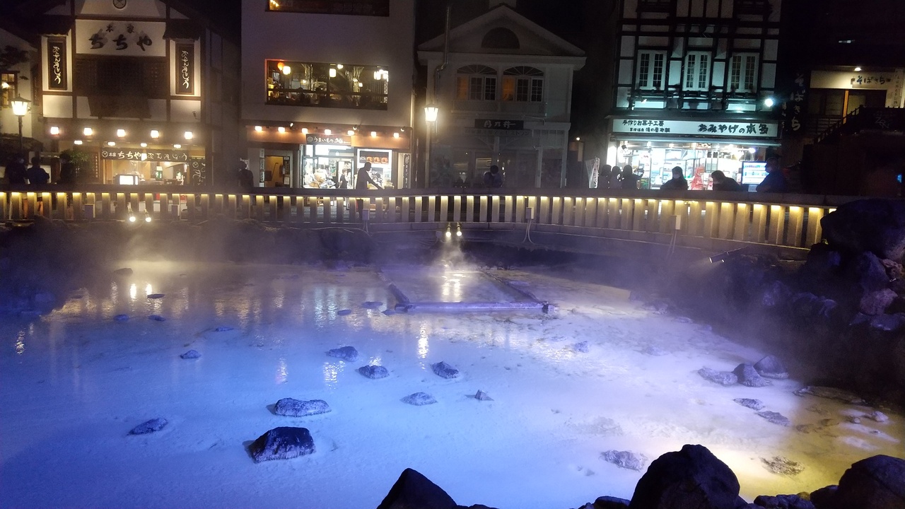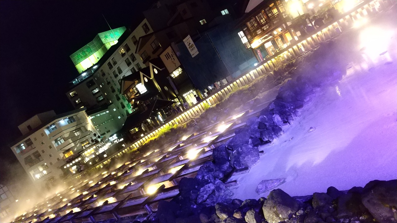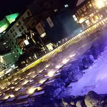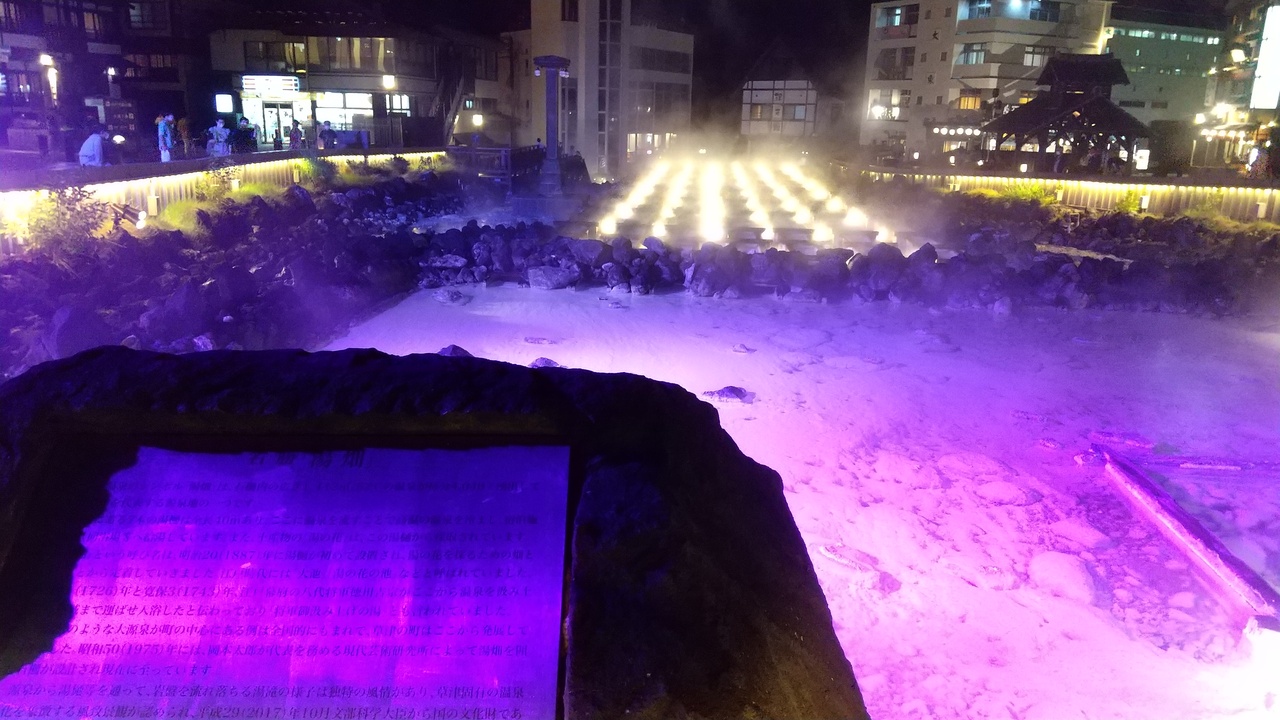 ライトアップされた夜の湯畑の雰囲気が良いです!