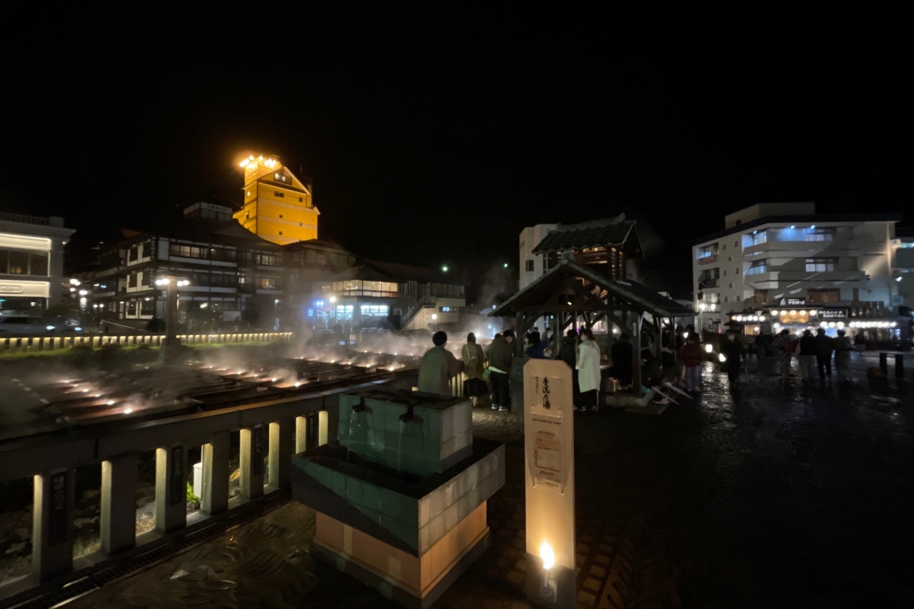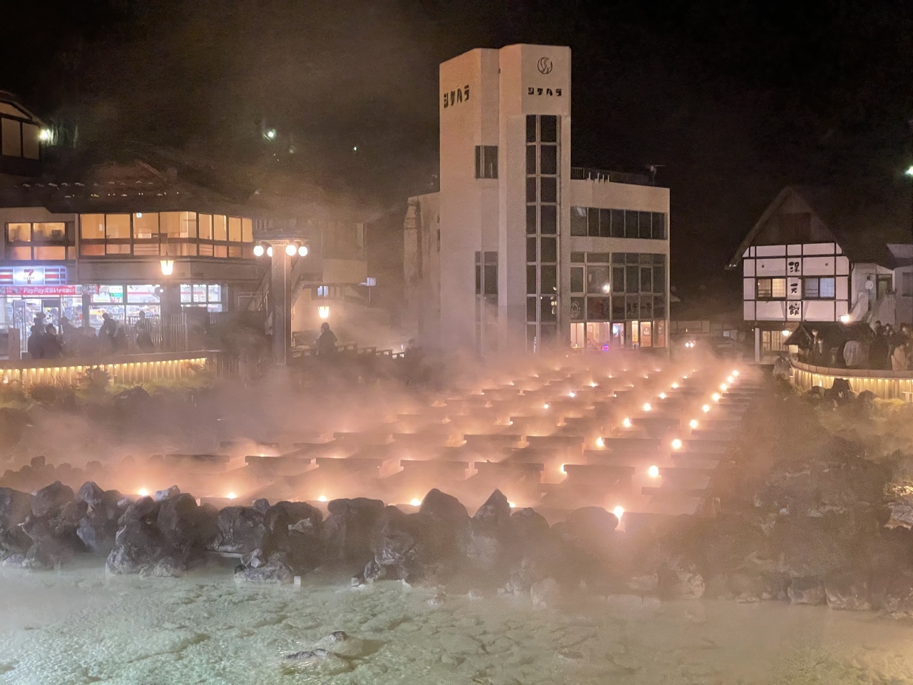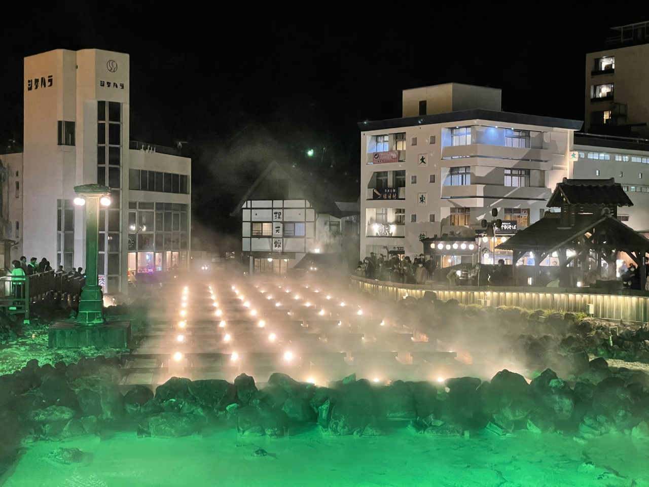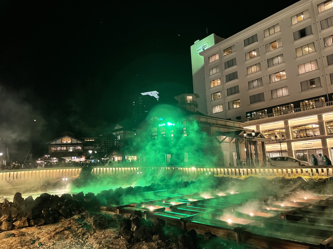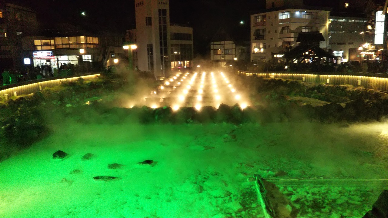 ライトアップされた夜の湯畑の雰囲気が良いです!