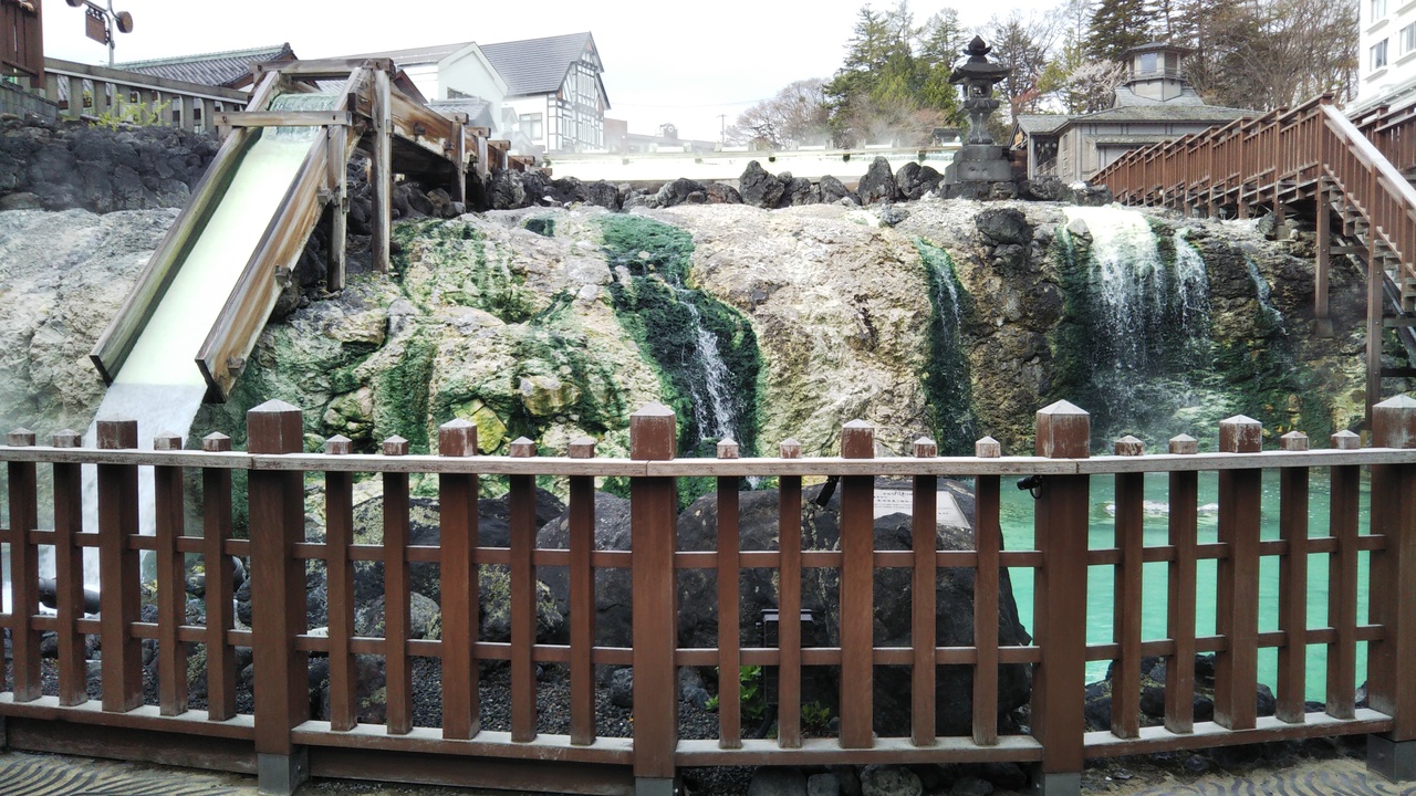 旅館街の中央にある草津温泉最大の源泉で、石柵に囲まれた幅20m、高さ60mの中から毎分約4,000リットルの熱湯が湧き出ており、硫気で黄緑色になった湯は何条もの木樋に流され、泉温を下げ、湯の花を採取して各旅館に送られる。