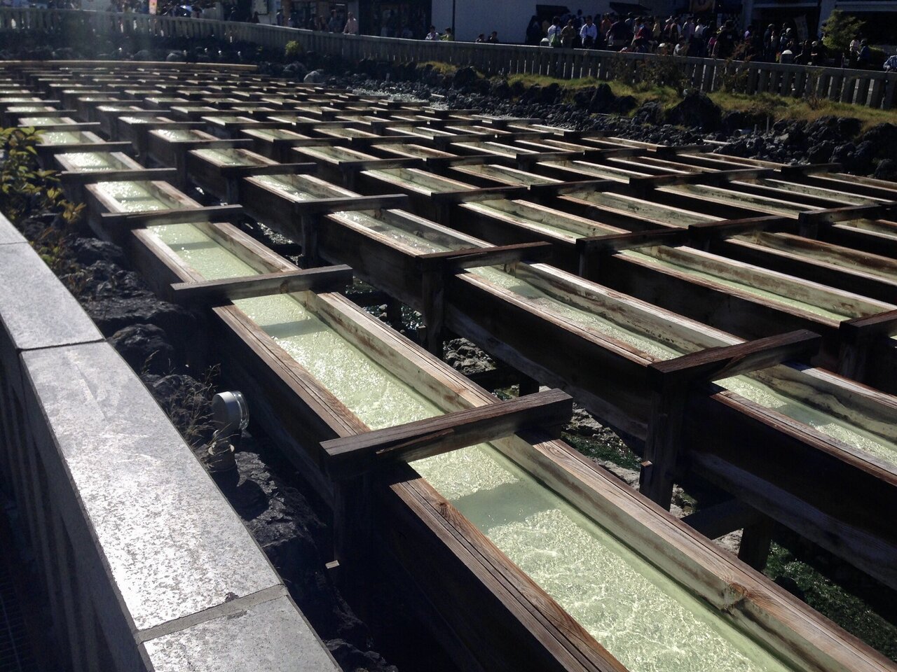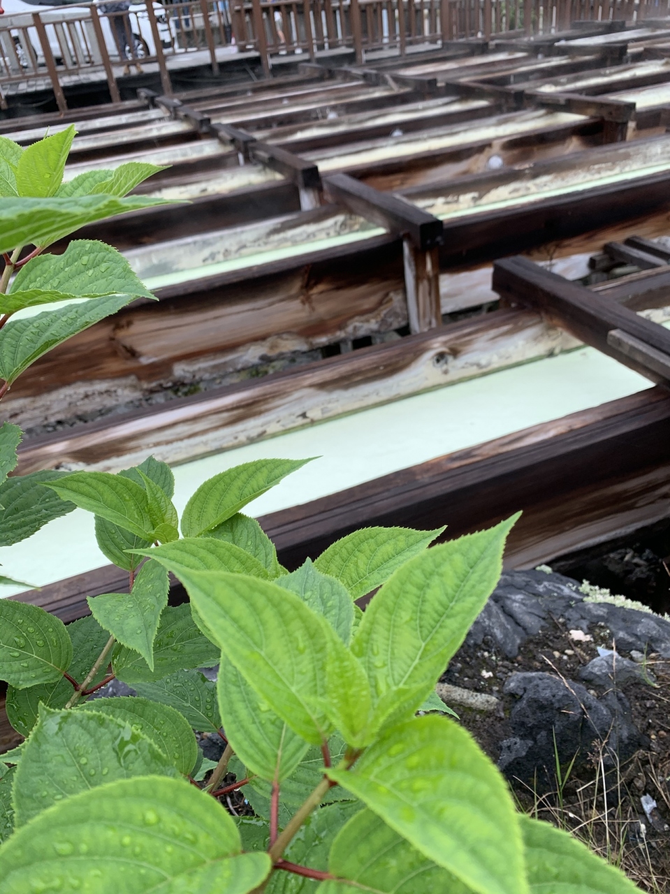長い木製の桶状の上を熱湯が流れています。木製の桶を通すことで、温度を下げることや湯ノ花採取の目的もあるとか。