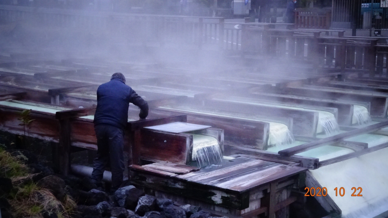 早朝に行くと湯畑を管理・掃除をしている人がいました。