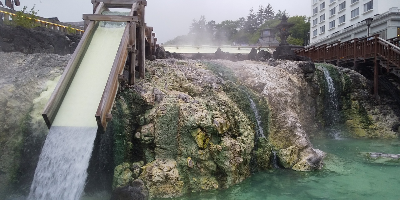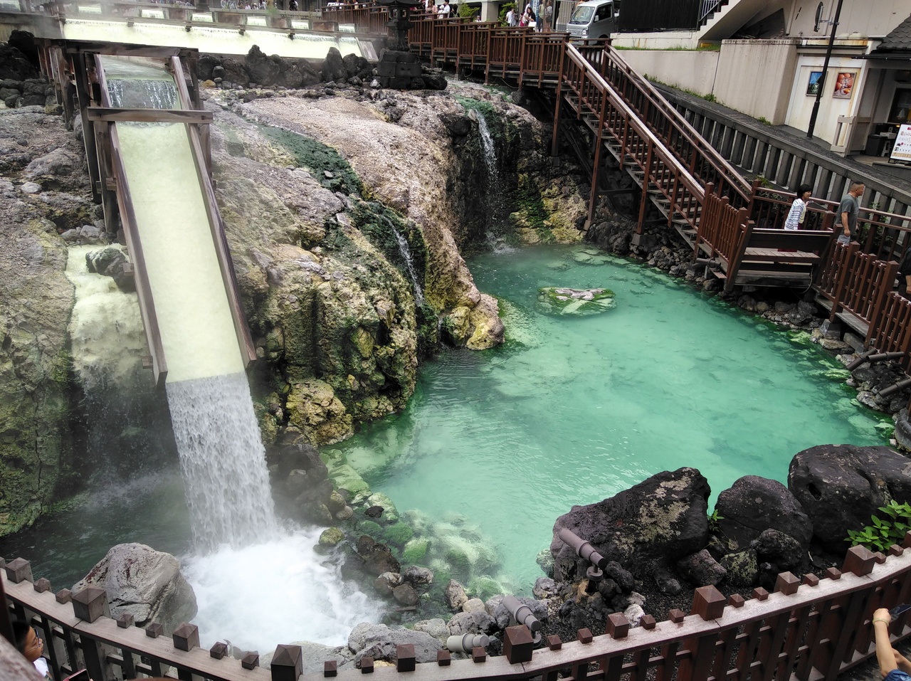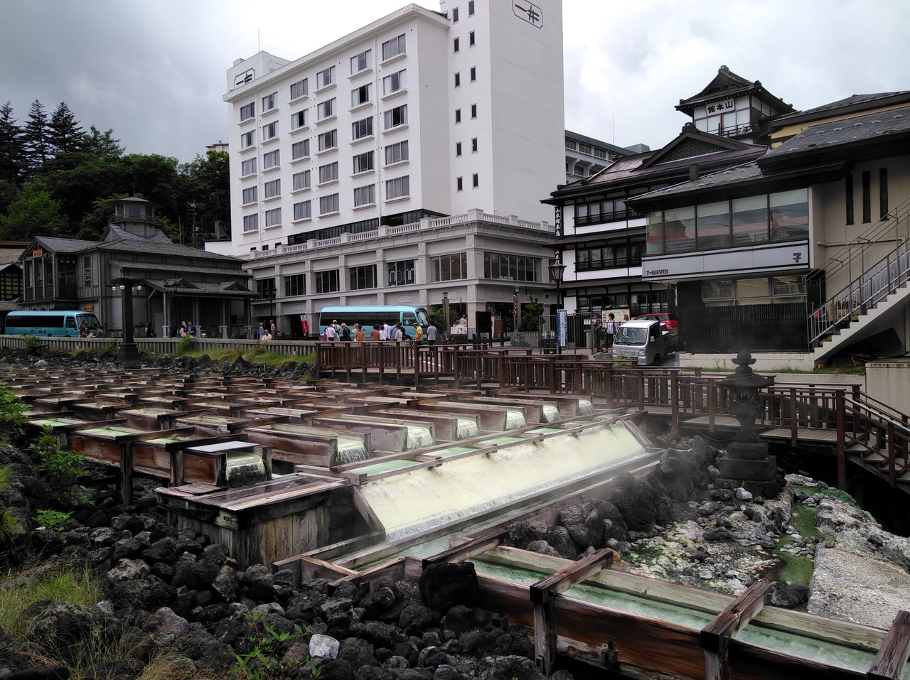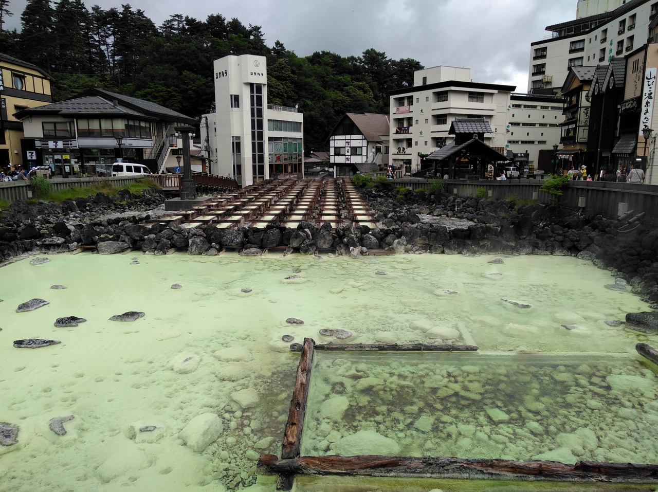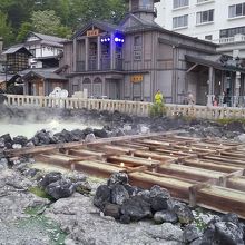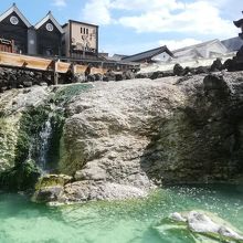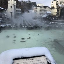 旅館街の中央にある草津温泉最大の源泉で、石柵に囲まれた幅20m、高さ60mの中から毎分約4,000リットルの熱湯が湧き出ており、硫気で黄緑色になった湯は何条もの木樋に流され、泉温を下げ、湯の花を採取して各旅館に送られる。