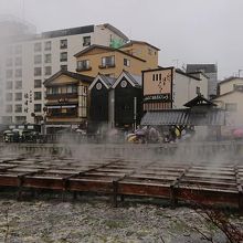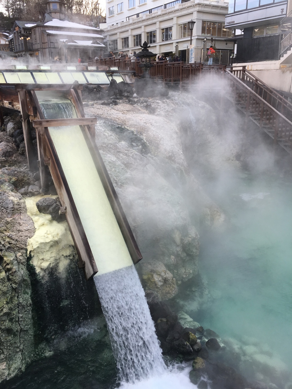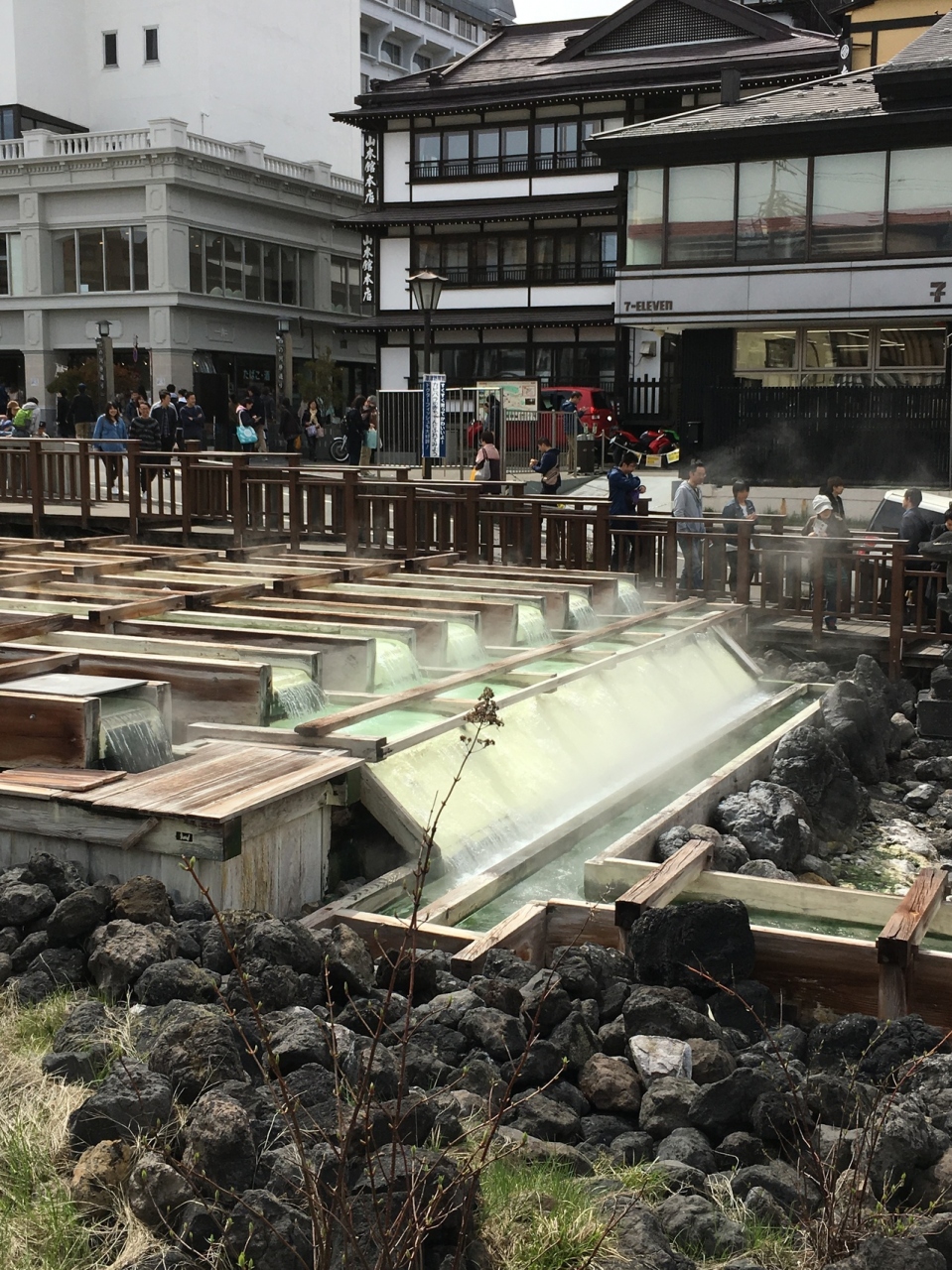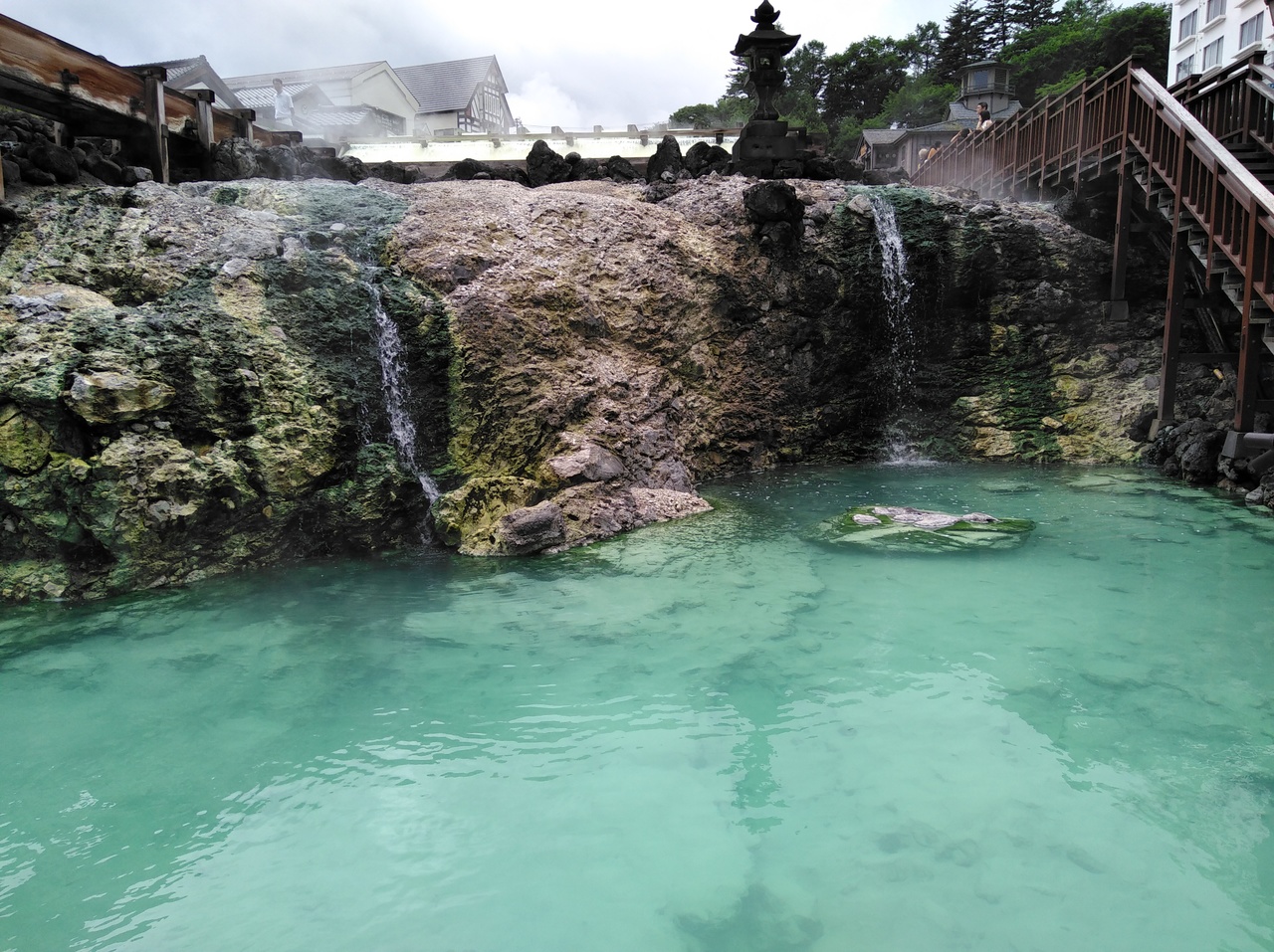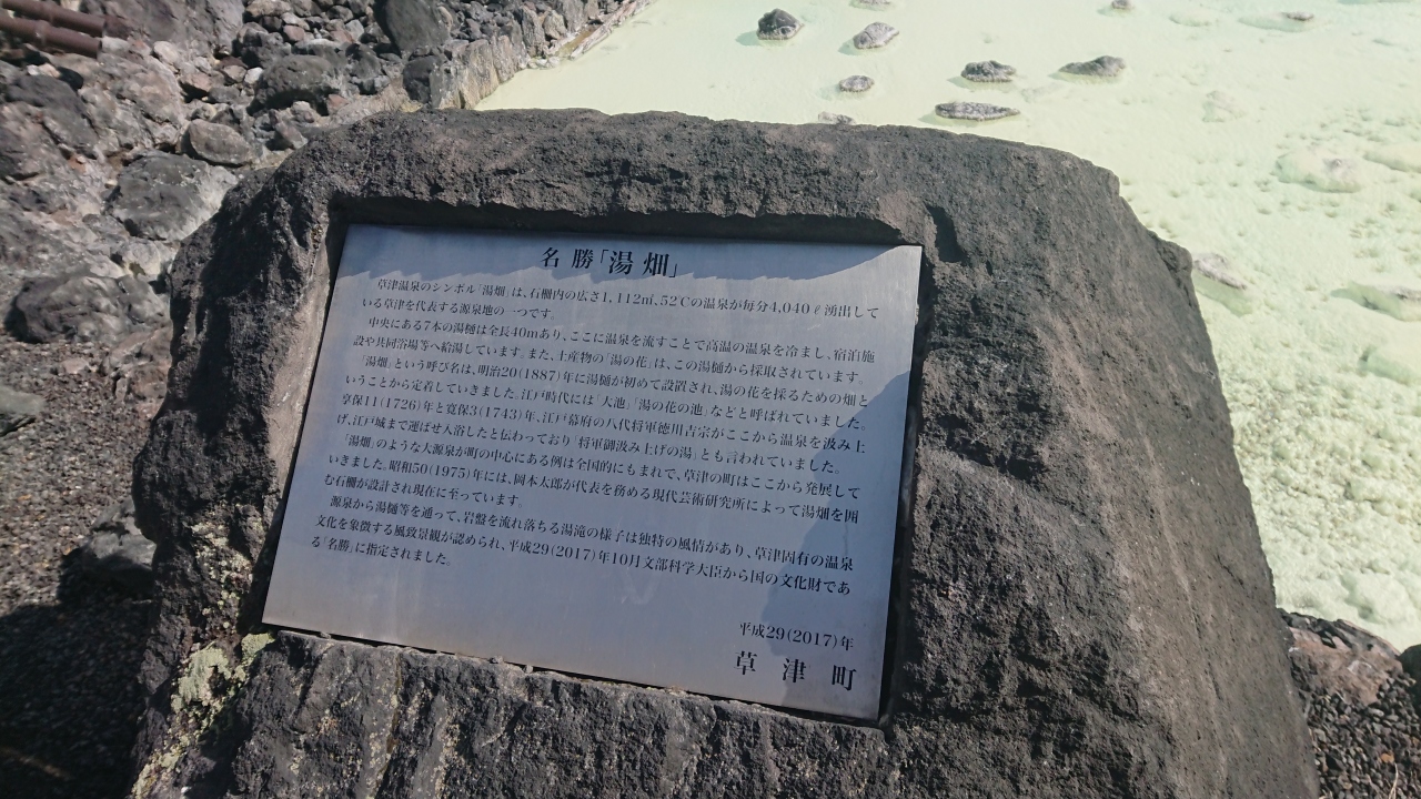 旅館街の中央にある草津温泉最大の源泉で、石柵に囲まれた幅20m、高さ60mの中から毎分約4,000リットルの熱湯が湧き出ており、硫気で黄緑色になった湯は何条もの木樋に流され、泉温を下げ、湯の花を採取して各旅館に送られる。
