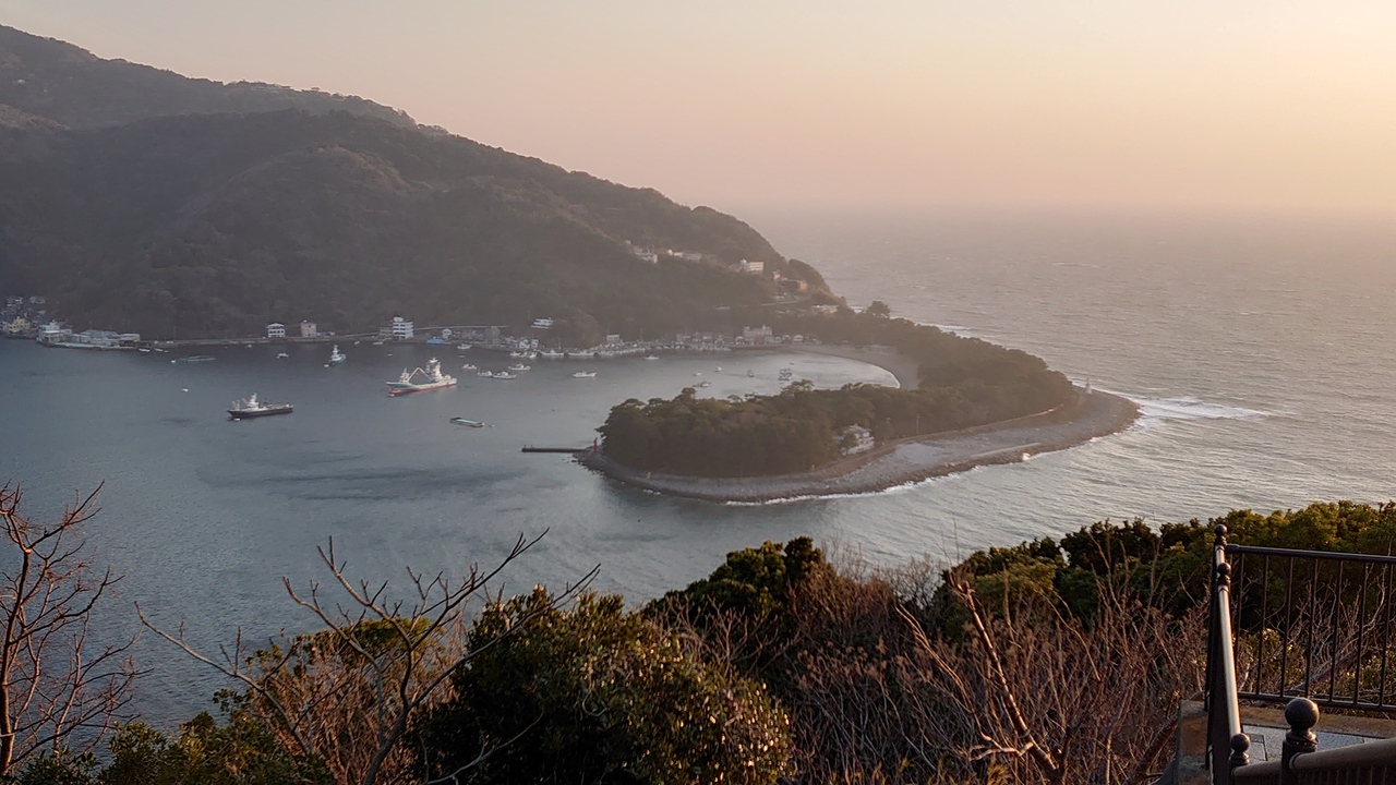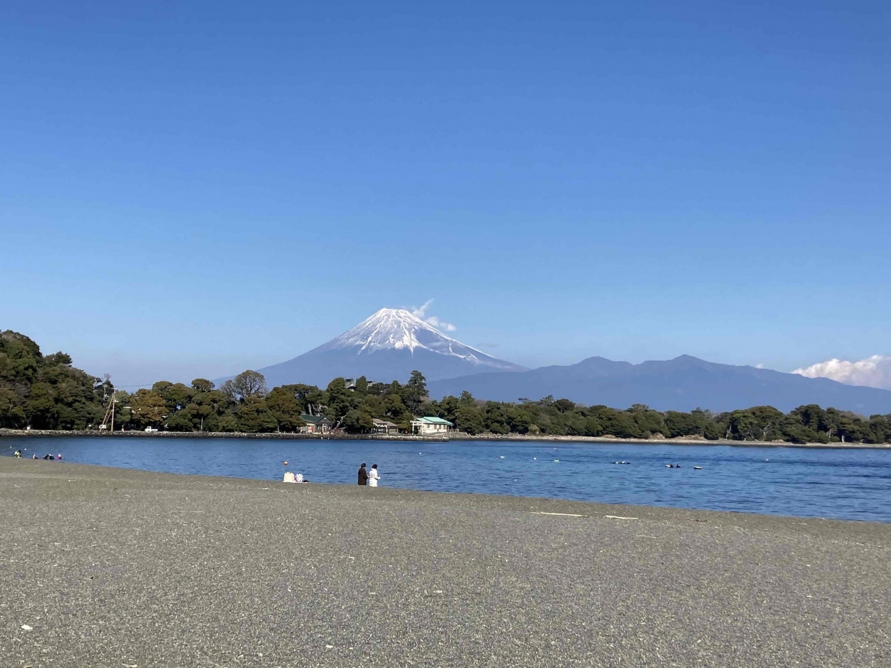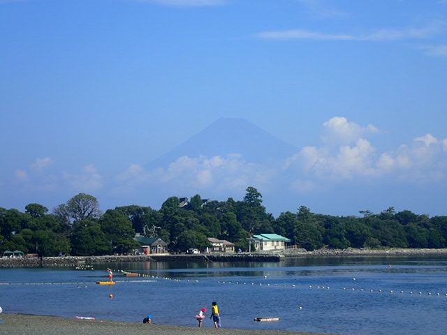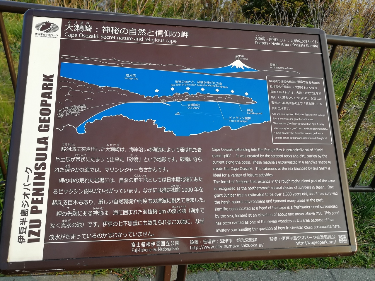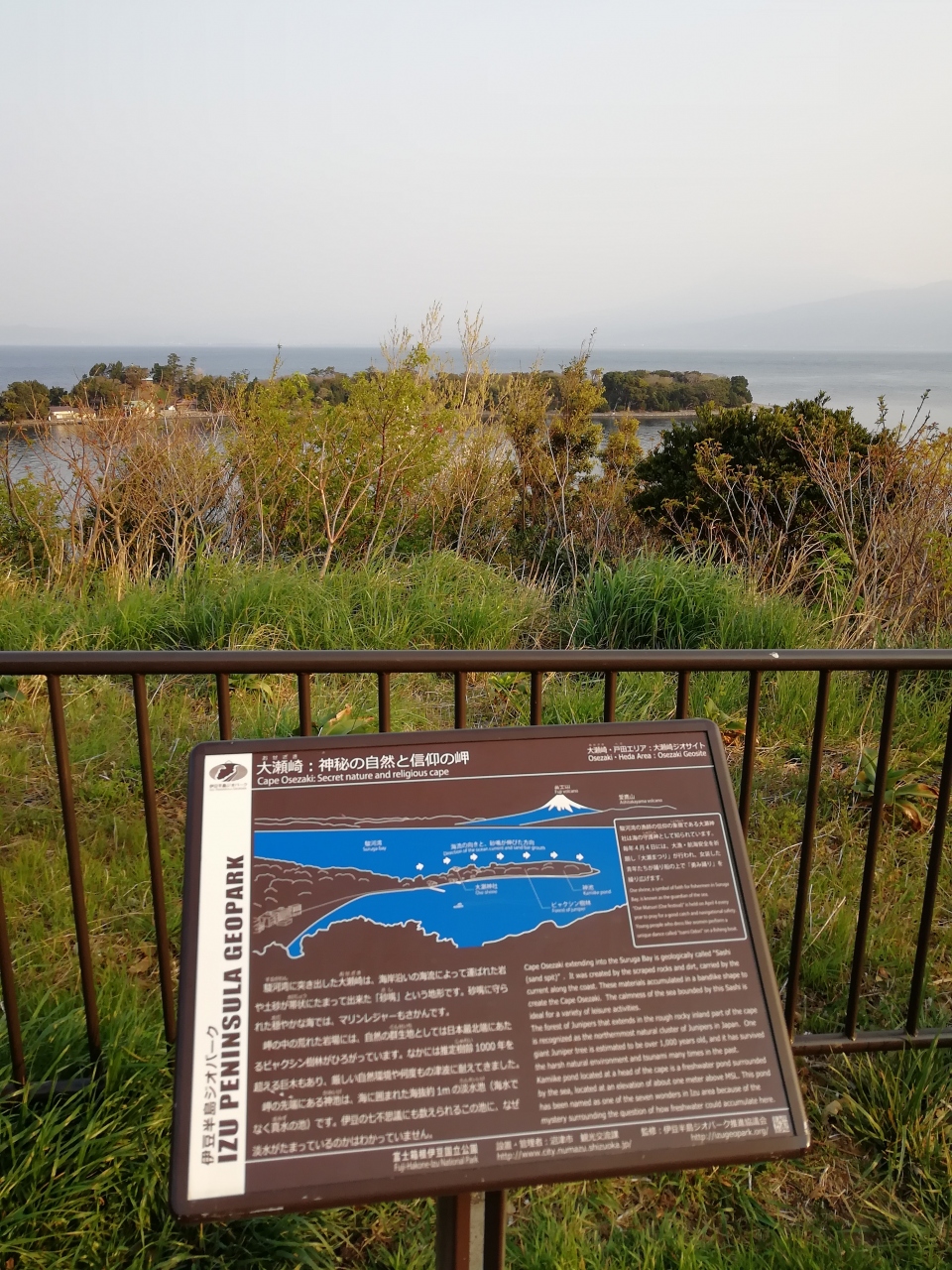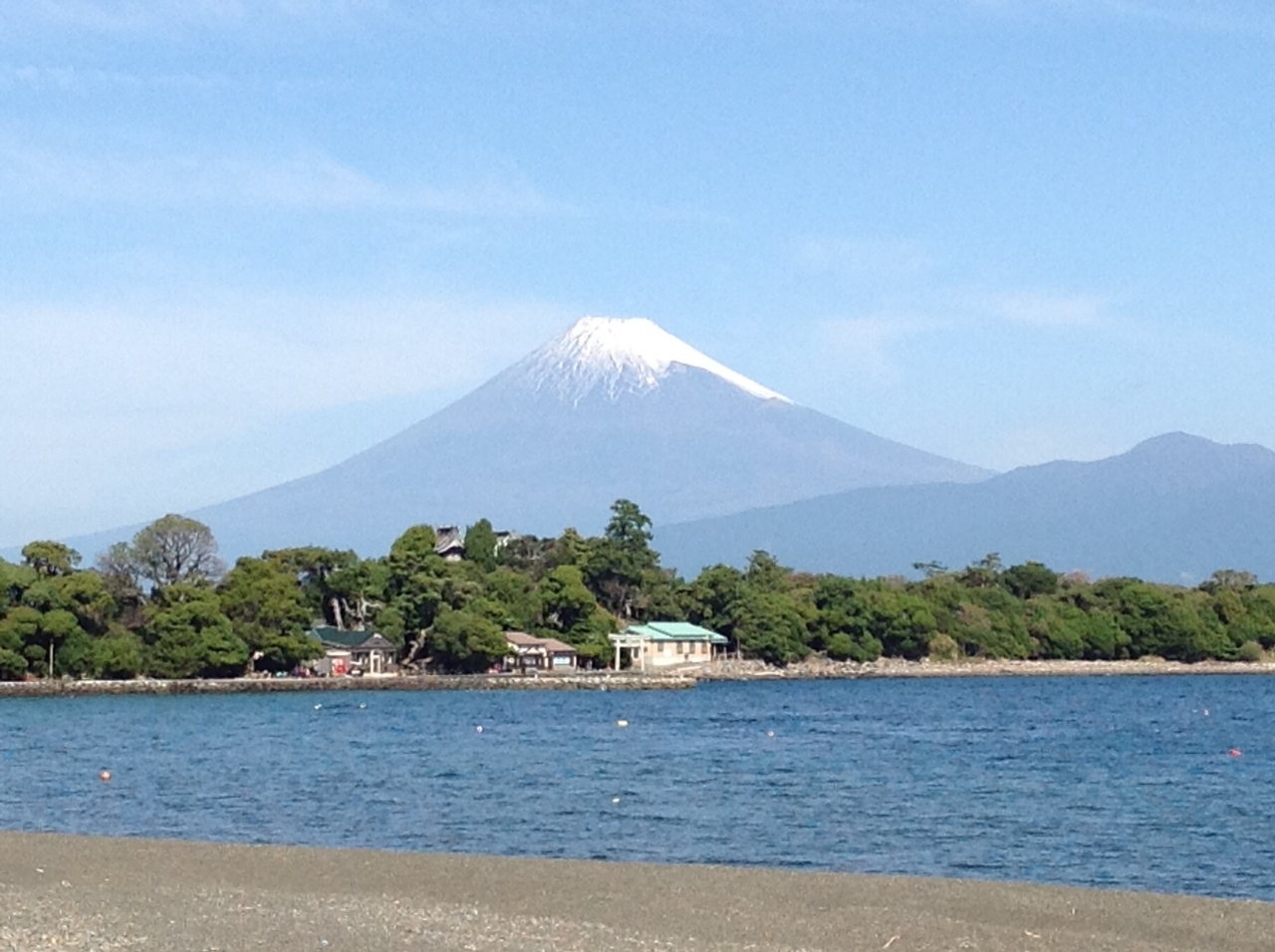 やや急な石段の上にある大瀬神社にもきちんとお参りを。社殿に向かって右後ろに下る道を行くと海に出ます。富士山が望めます。
