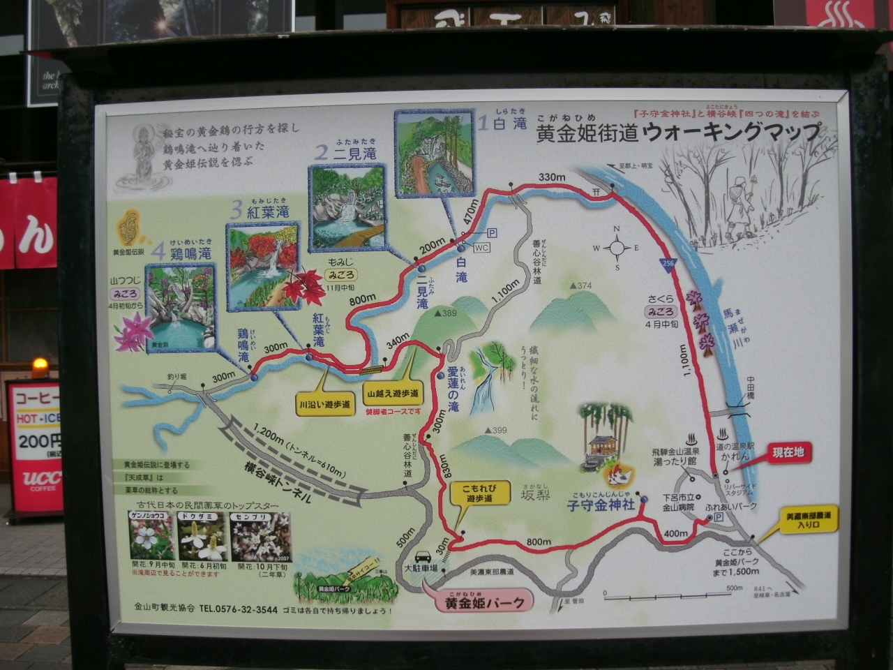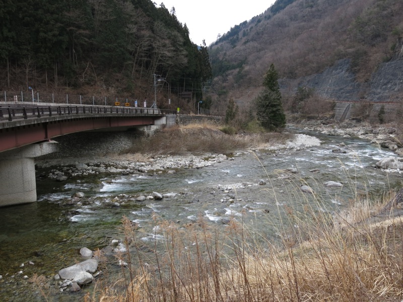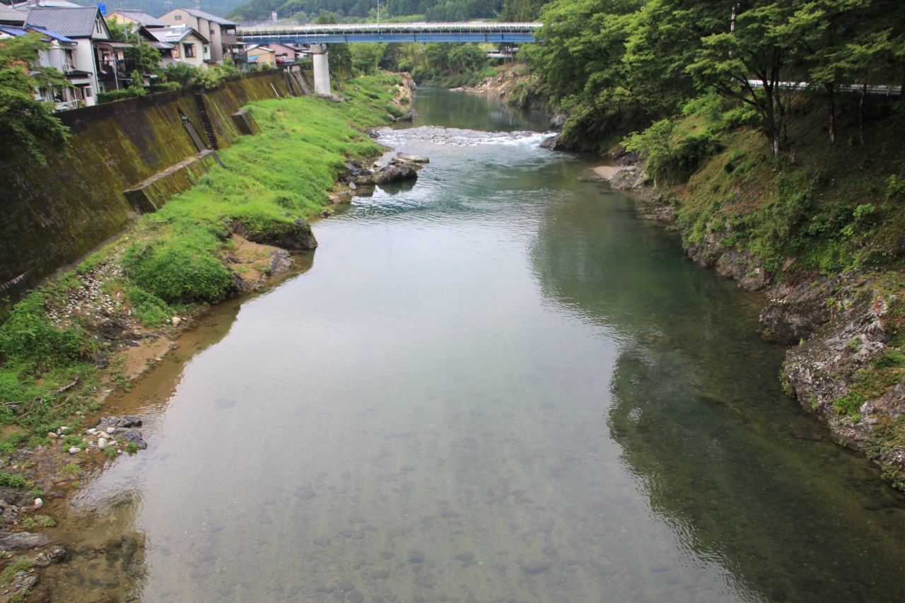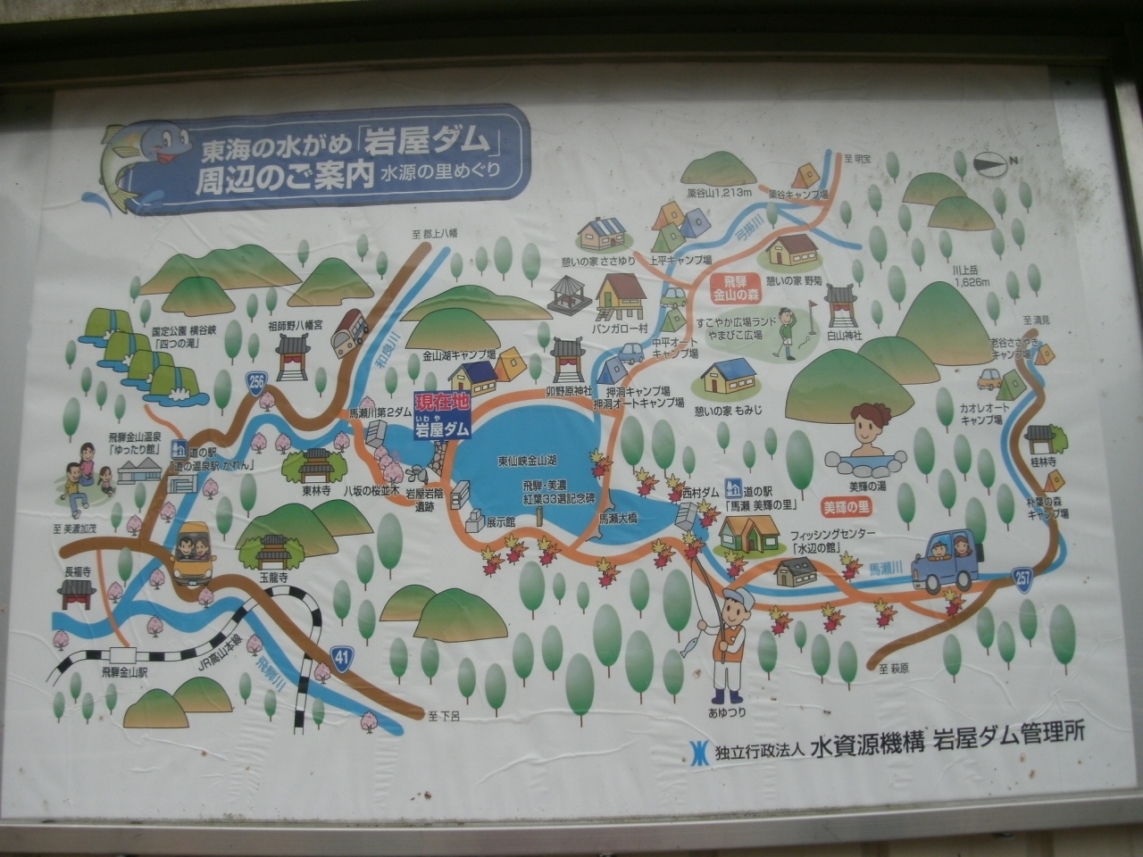 合流点近くは、国道256号線に沿って流れていて、その一部が“黄金姫街道ウォーキングコース”になっています。その先は県道86号線、431号線に沿って川は流れていて、馬瀬川第2ダムや岩屋ダム、金山湖などの見所があります。