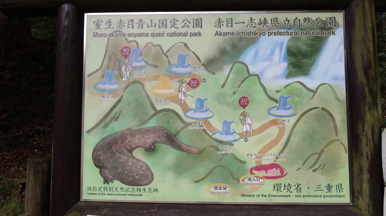 入口の赤目滝水族館(旧日本サンショウウオセンター)で入山料(渓谷保全料)1,000円を払って歩き出します。行者滝を過ぎ、銚子滝を眺めながら進むと、水音が響き始めます。結構立派な霊蛇滝です。その先に赤目五瀑の一つである不動滝があります。渓谷にかけられた不動橋からの眺めは壮観ですが、明治の中ごろまではこの滝から奥は原生林で足を踏み入れることはできなかったそうです。