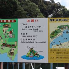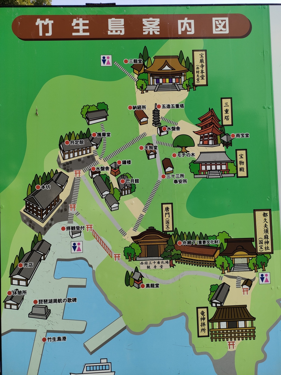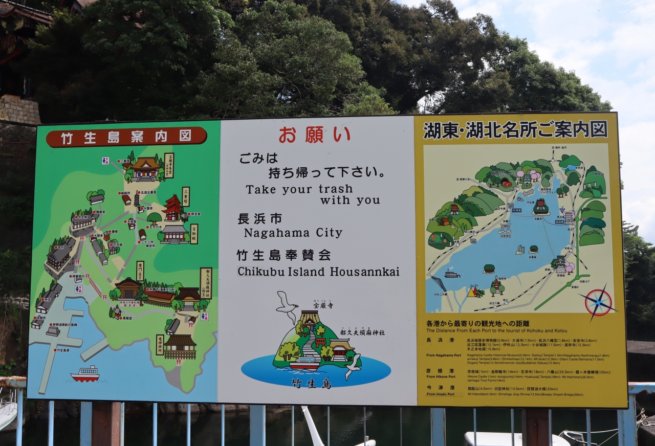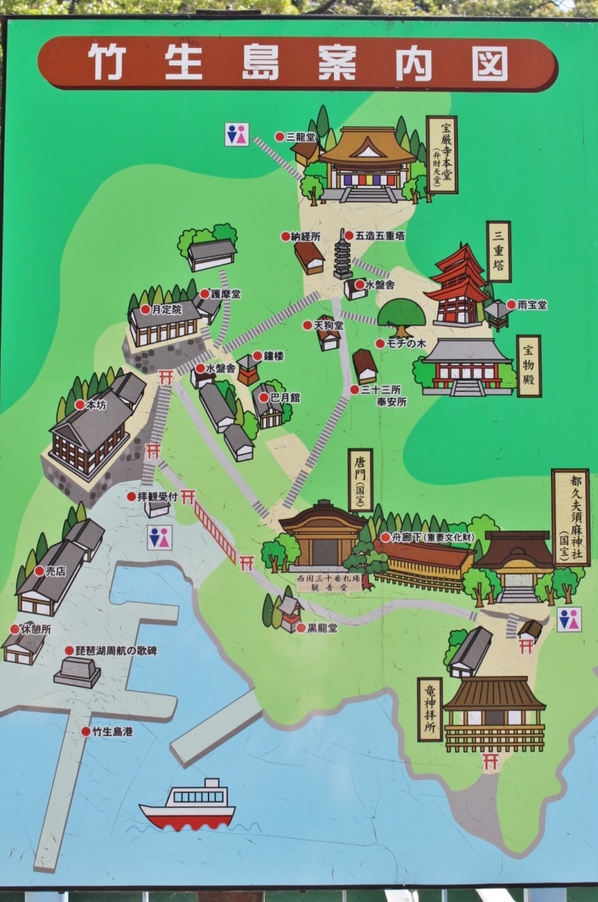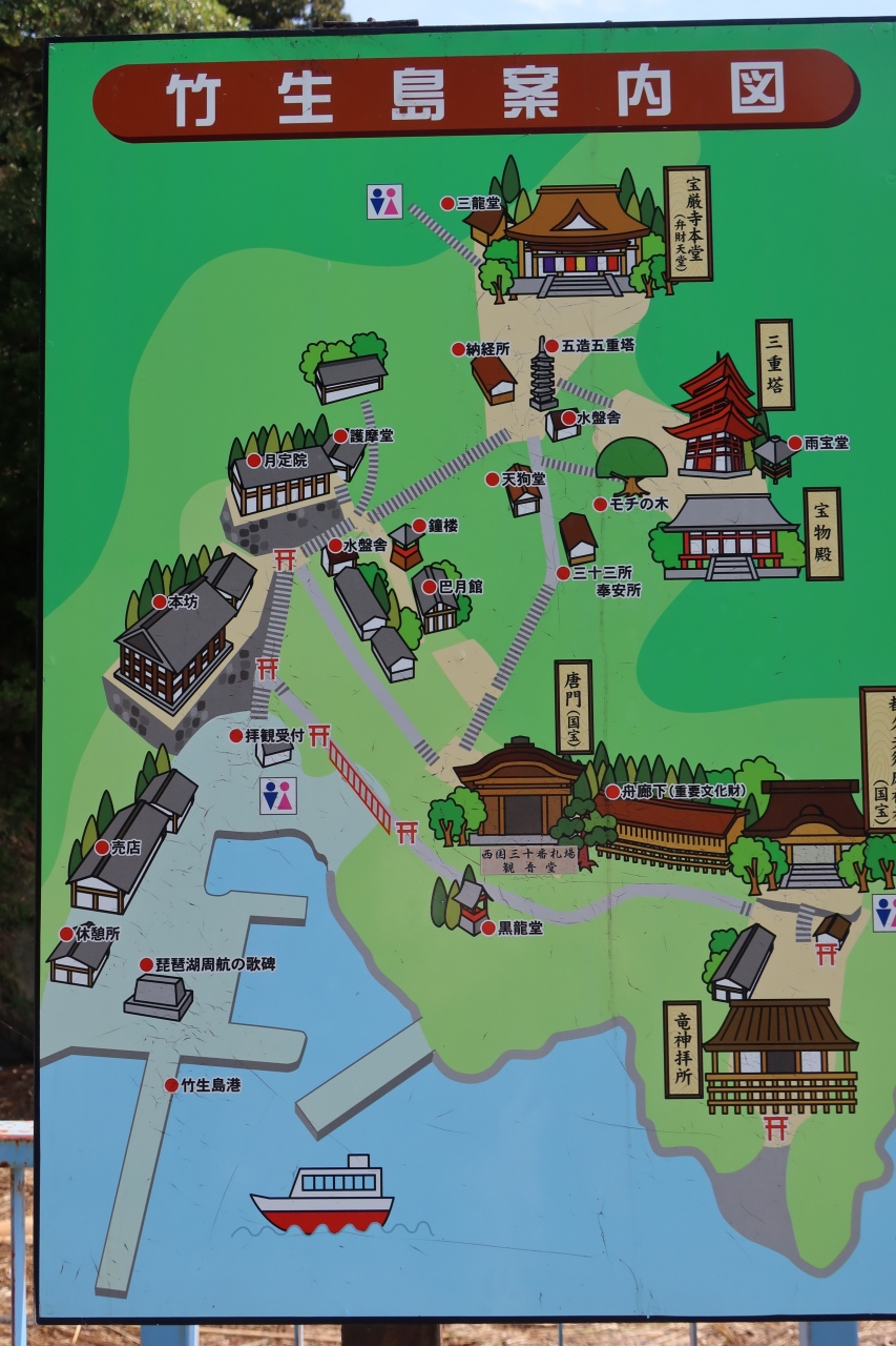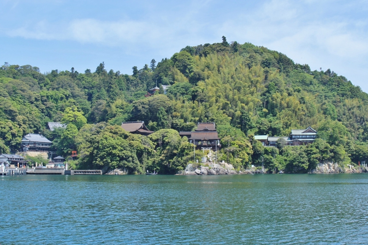 琵琶湖の北部に浮かぶ周囲2kmあまりの無人島で、宝厳寺と都久夫須麻神社が祀られている。