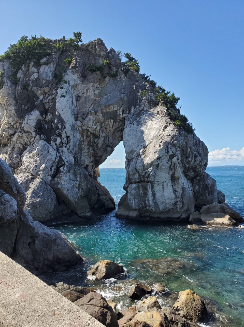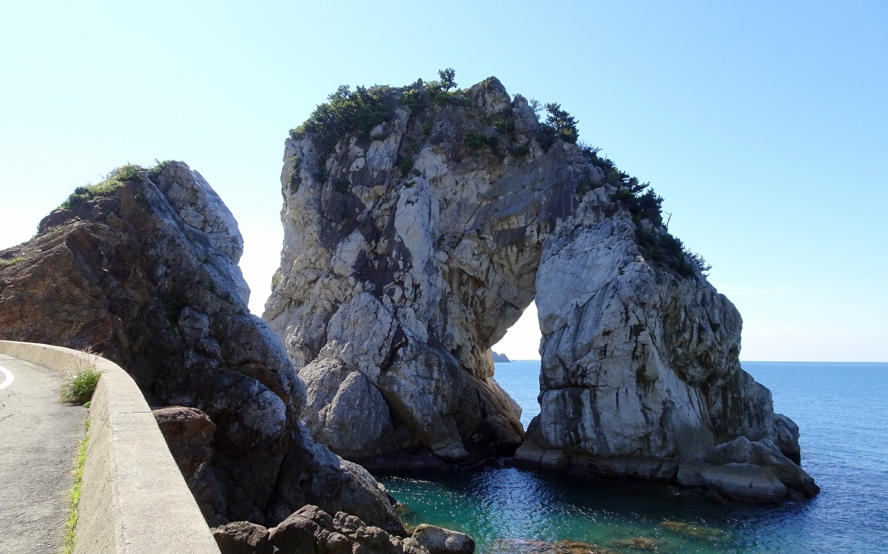 また,白崎海洋公園から海岸沿いに南へ歩いて約8分。海の中に巨大な岩門が立っています。立厳岩(たてごいわ)という,白い石灰岩に波の浸食で開いた洞門で,まるで自然が作り出した凱旋門。海の中凛然と浮かび上がる様は圧巻です。 閉じる投稿日:2019/01/19