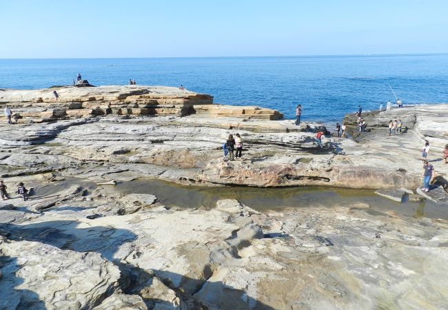 海岸に突き出した砂岩からなる岩盤で、とても広いです。
