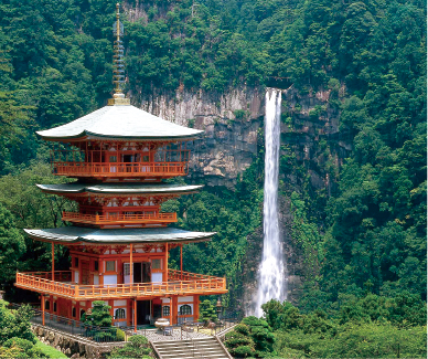 熊野那智大社の別宮、飛瀧神社のご神体として古くから人々の畏敬を集めてきた那智の滝は、「一の滝」とも呼ばれ日本三大名瀑の一つです。ユネスコの世界遺産『紀伊山地の霊場と参詣道』(2004年〈平成16年〉7月登録されました。 落差133m、銚子口の幅13m、滝壺の深さは10mの落差日本一の名瀑で、熊野の山塊、その奥方より流れ落ちる姿は圧巻で、大晦日にはライトアップも行われます。 銚子口の岩盤に切れ目があって、三筋に分かれて流れ落ちるところから、「三筋の滝」ともよばれています。 毎年7月9日と12月27日には、古来からの神事にのっとり、神社(飛瀧神社)の御神体としてこの滝を崇め、「御滝注連縄張替行事」が行われます。 かつて、諸国から那智の滝に詣でる人々は、写経を経筒に入れ、お滝入口の大鳥居をくぐり左側にある「那智経塚」に、写経を納めました。