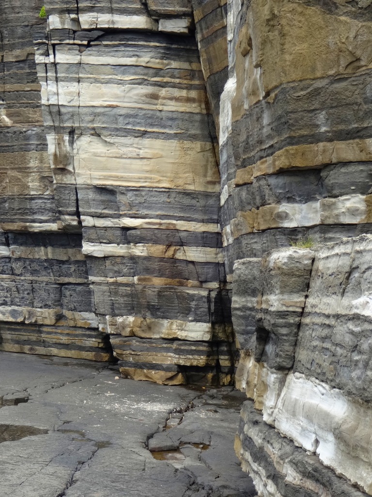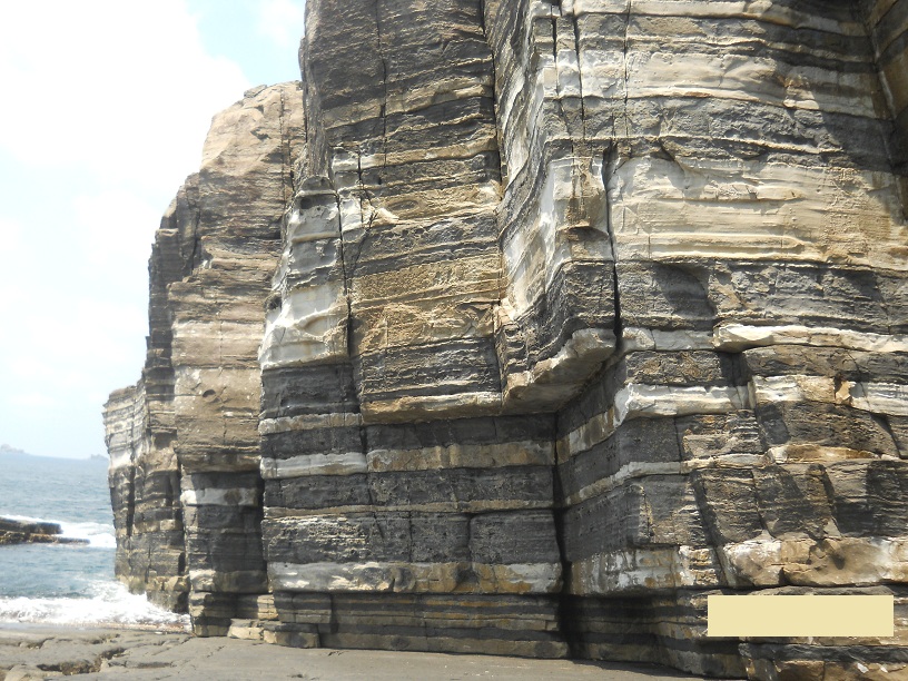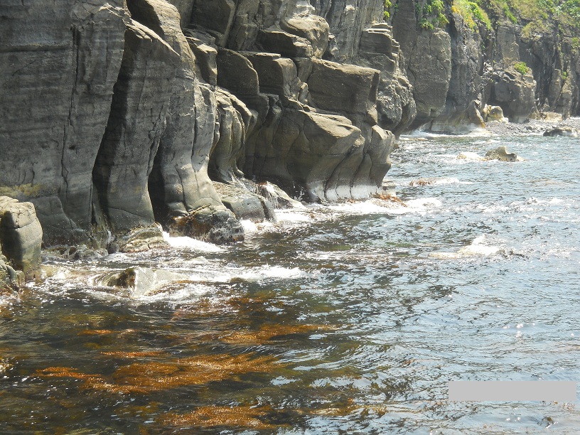 ここの岩は頁岩と砂岩の岩に斑レイ岩マグマが接触したために生じた物です