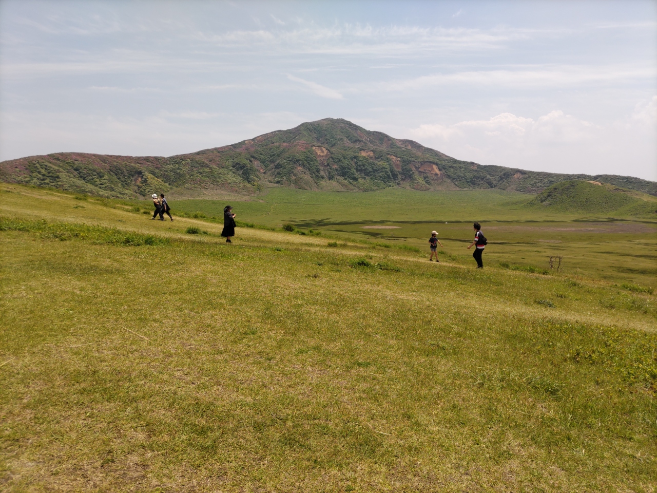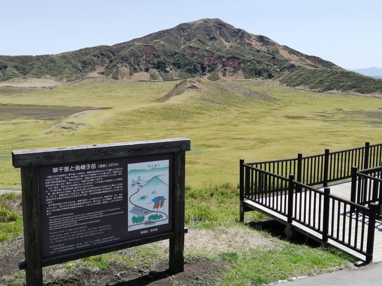 烏帽子岳の北麓に広がる直径約1kmの草原。二重式火口の跡で、中央には大きな池があり、放牧馬がのんびりと草を食んでいる牧歌的風景は、阿蘇を代表する景色となっている。目の前には噴煙をあげる中岳がそびえる。